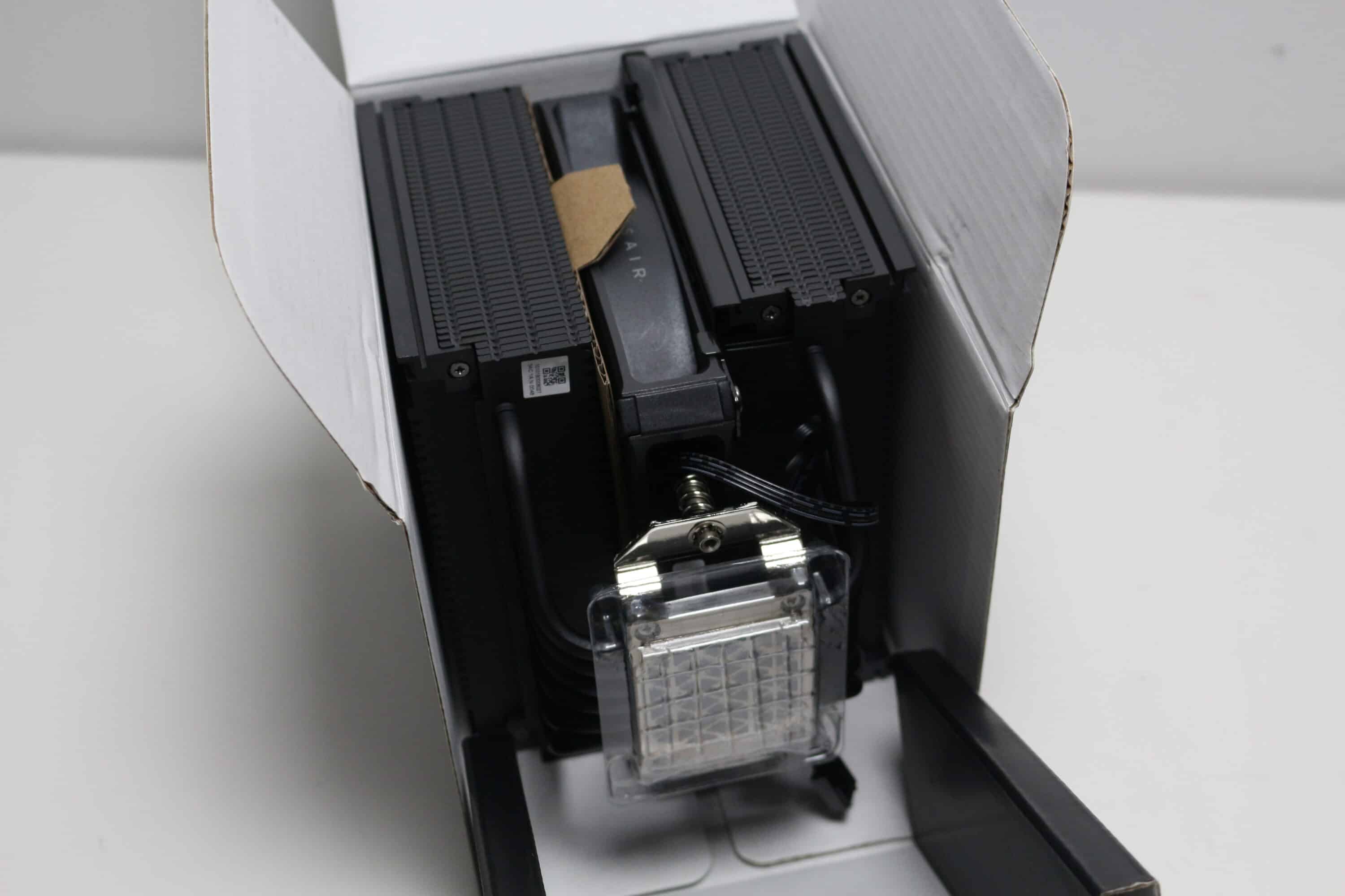 In das Innere der Verpackung gelangt man, wenn man die obere Lasche des Kartons öffnet. Darunter finden wir zwei Schutzformen aus weichem Schaumstoff, in welche Corsair den Kühlkörper, den Lüfter und das Montagezubehör hüllt. Zusätzlich sind die einzelnen Komponenten nochmal von einer Verpackung aus Pappe ummantelt. Zum Lieferumfang des Corsair A115 gehören der Kühlkörper inklusive der zwei Lüfter, sämtliches Montagematerial für alle aktuellen Intel- und AMD-Mainstreamsockel, ein Y-Splitterkabel für die Lüfter sowie die werkseitig aufgetragene Wärmeleitpaste. Eine Montageanleitung gibt es nur in digitaler Form per QR-Code.