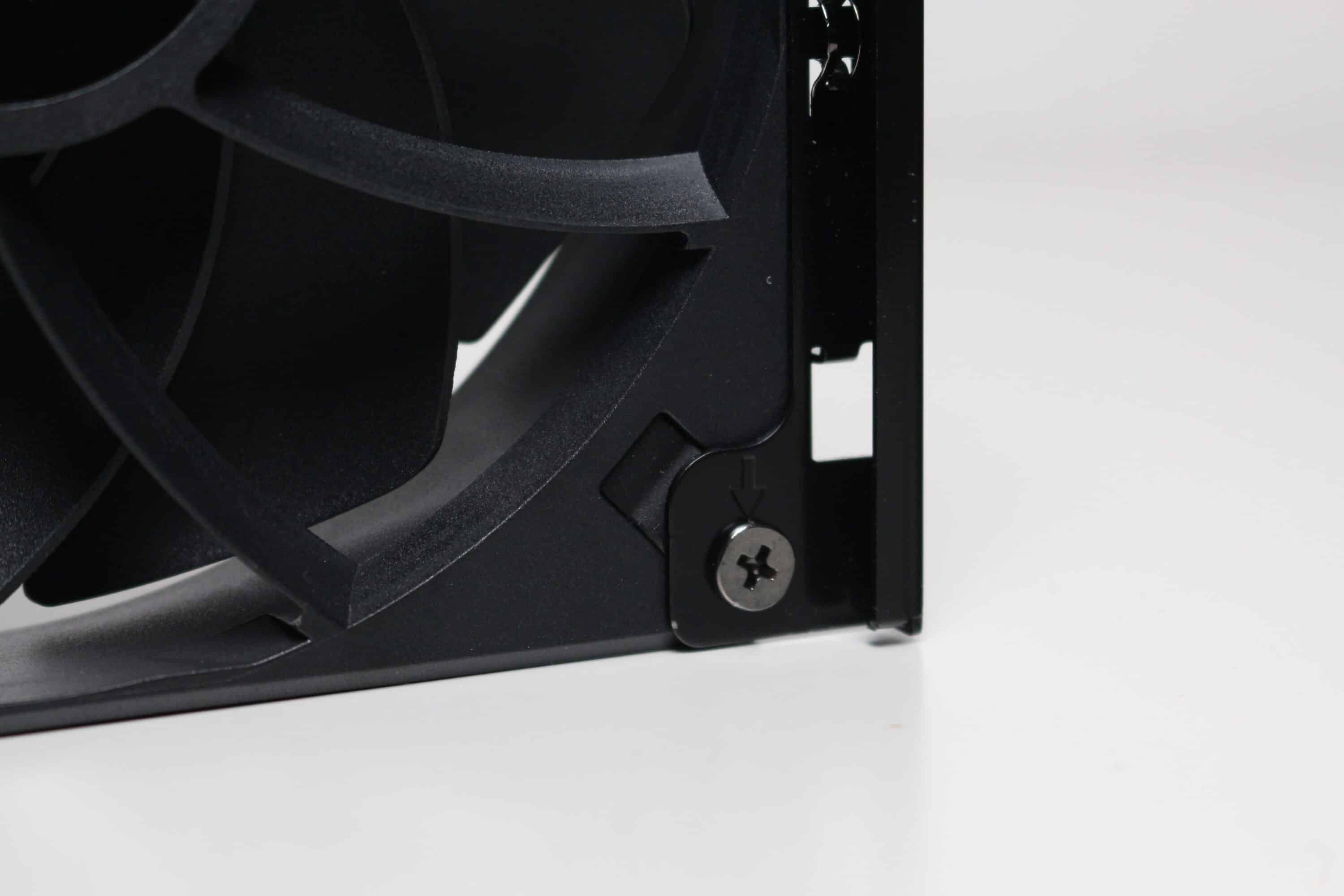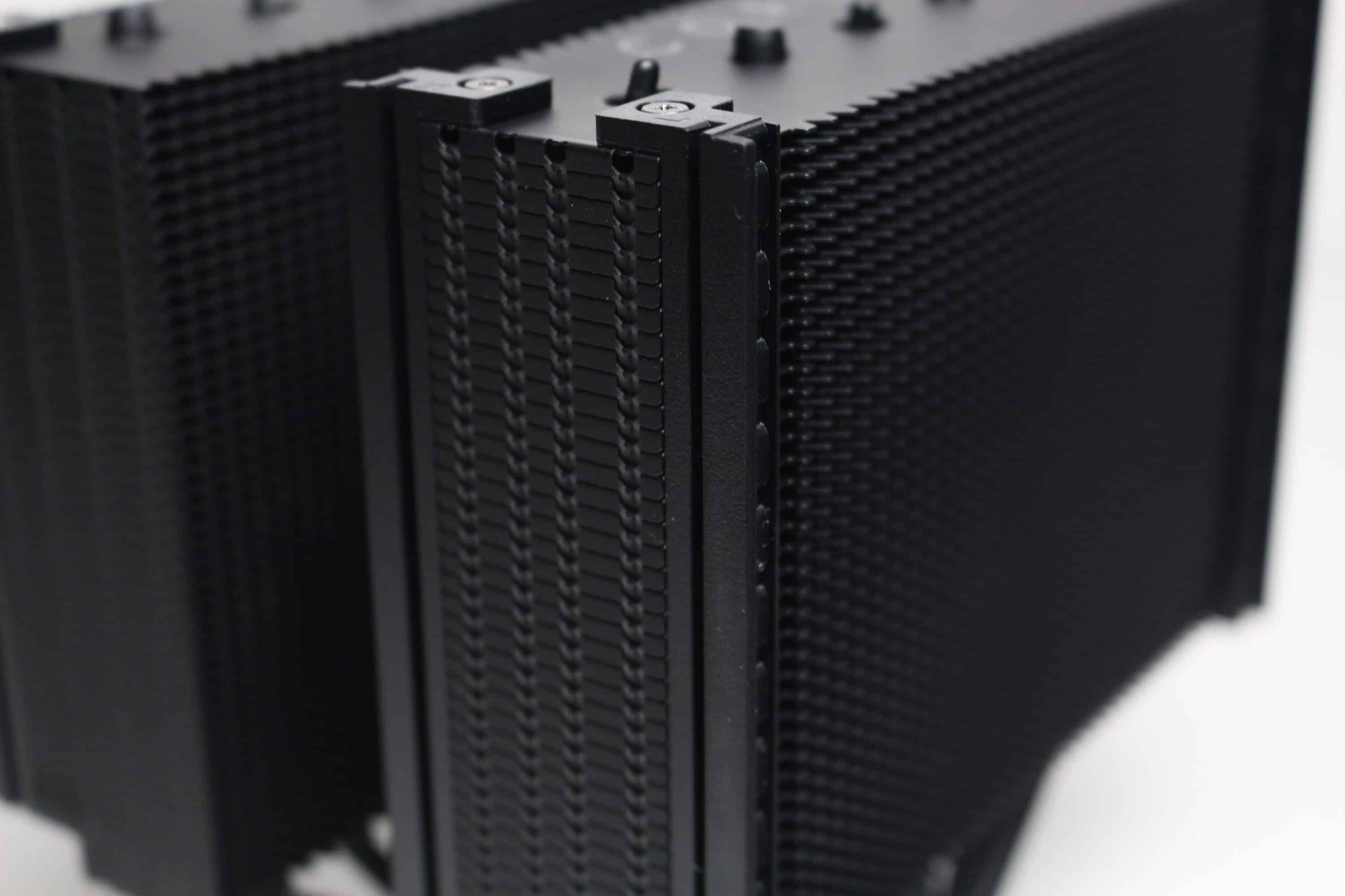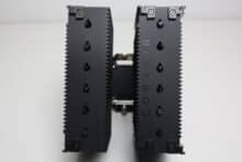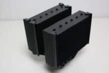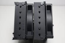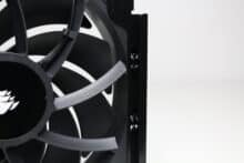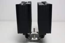 Besonders interessant ist beim Corsair A115 zudem das Montagesystem der Lüfter. Anders als bei vielen anderen Herstellern verzichtet Corsair nämlich auf die typischen Metallklammern. Stattdessen verfügen beide Lüfter über angeschraubte Stahlschienen mit denen die Lüfter von oben in die Führungsschienen am Kühlkörper geschoben werden können. Die Führungsschienen wurden aus einem stabilen Kunststoff gefertigt und sind am Kühlkörper verschraubt. Die Arretierung der Lüfter erfolgt über kleine Stahlklemmen an der Innenseite der Halteklammern.