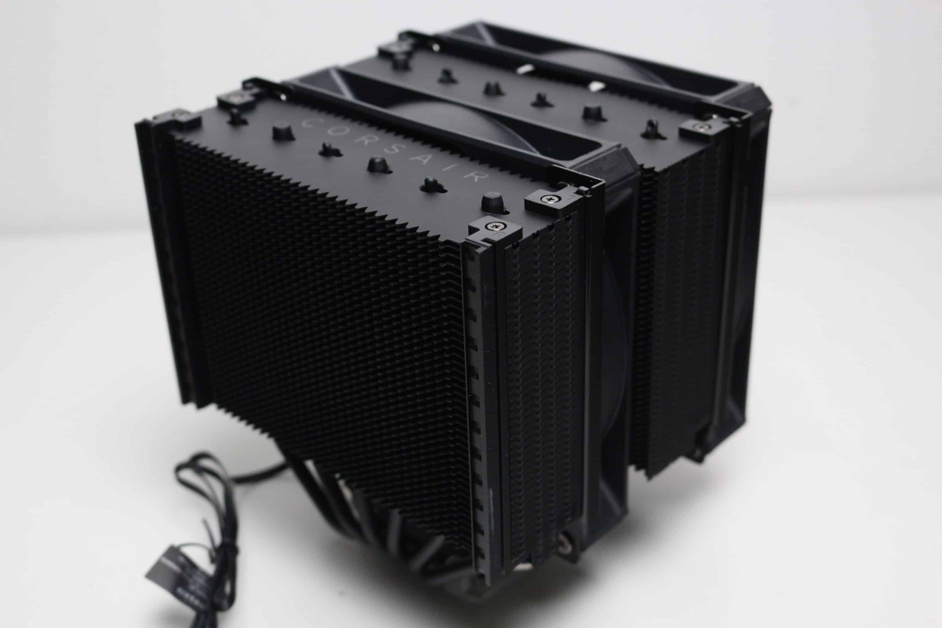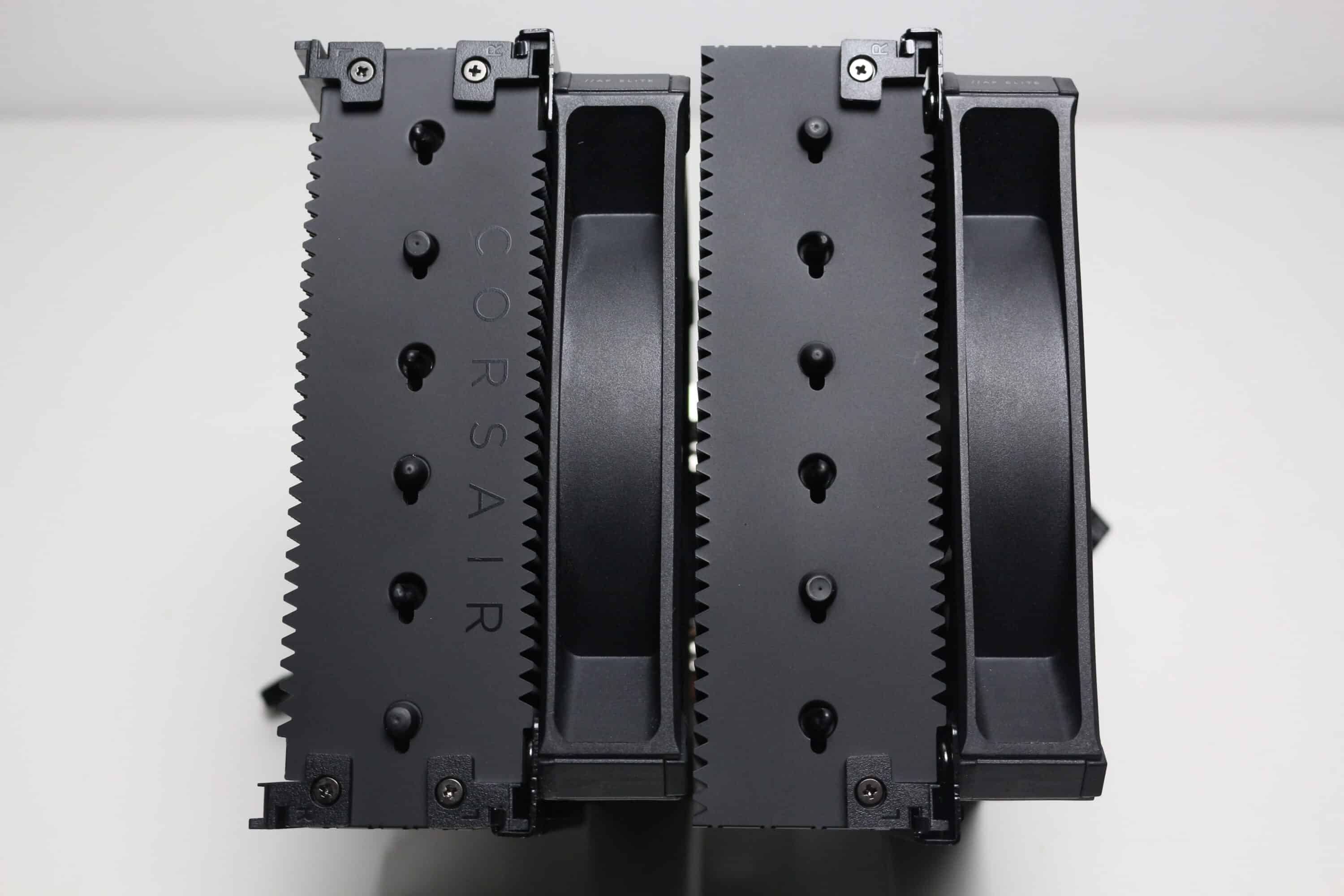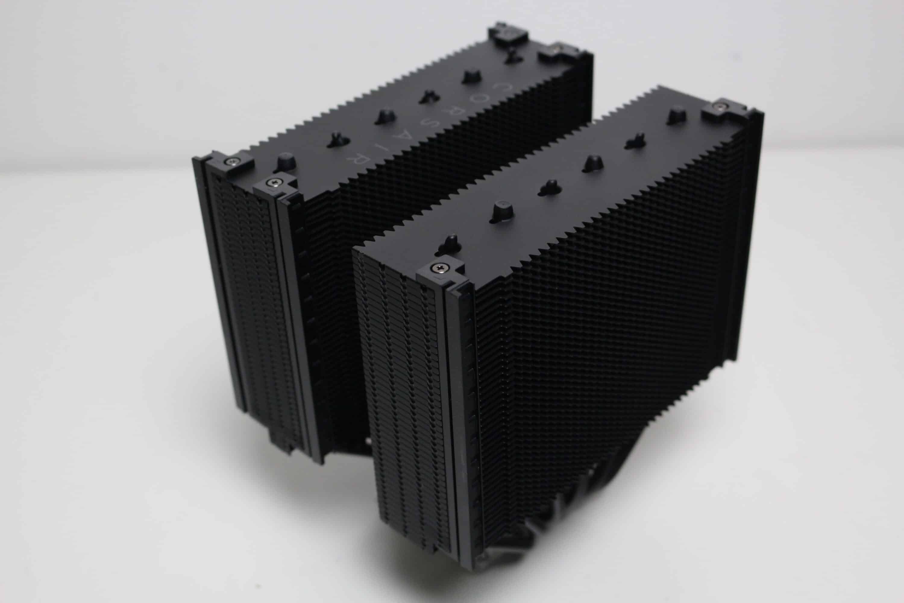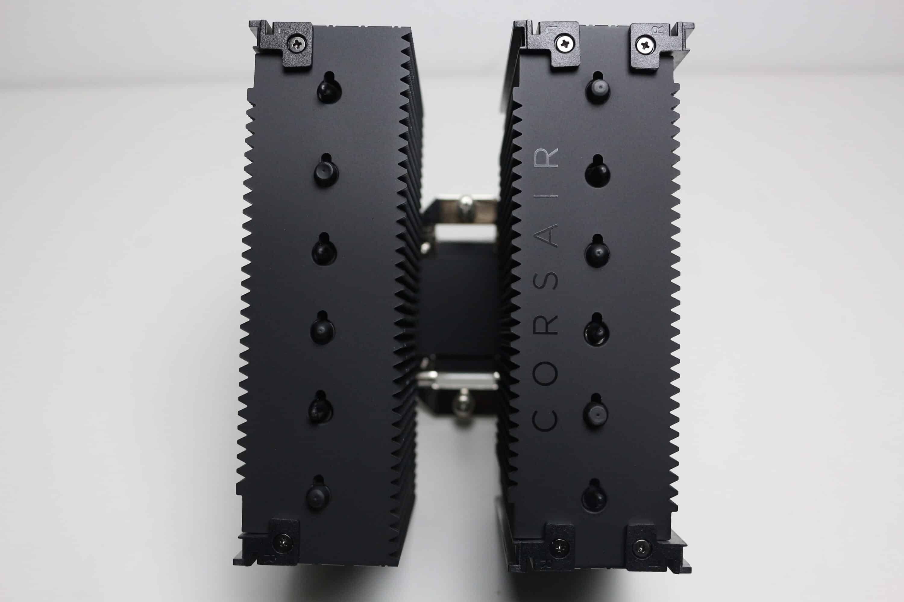 Der Kühlkörper besteht aus zwei Kühltürmen mit jeweils 45 horizontalen Aluminiumlamellen, die zur Verbesserung der Optik schwarz vernickelt wurden. Außerdem verfügen die Lamellen über Zacken, welche laut Hersteller Luftverwirbelungen minimieren sollen. Die Übertragung der Wärme vom Heatspreader der CPU zu den Lamellen erfolgt dabei über eine vernickelte Bodenplatte aus Kupfer sowie sechs schwarz vernickelte Heatpipes mit einem Durchmesser von jeweils sechs Millimetern. Die Enden der Heatpipes versteckt Corsair nicht mit einer Abdeckplatte. Stattdessen lässt sich auf dem hinteren Kühlturm aber ein unauffälliger Herstellerschriftzug erkennen.