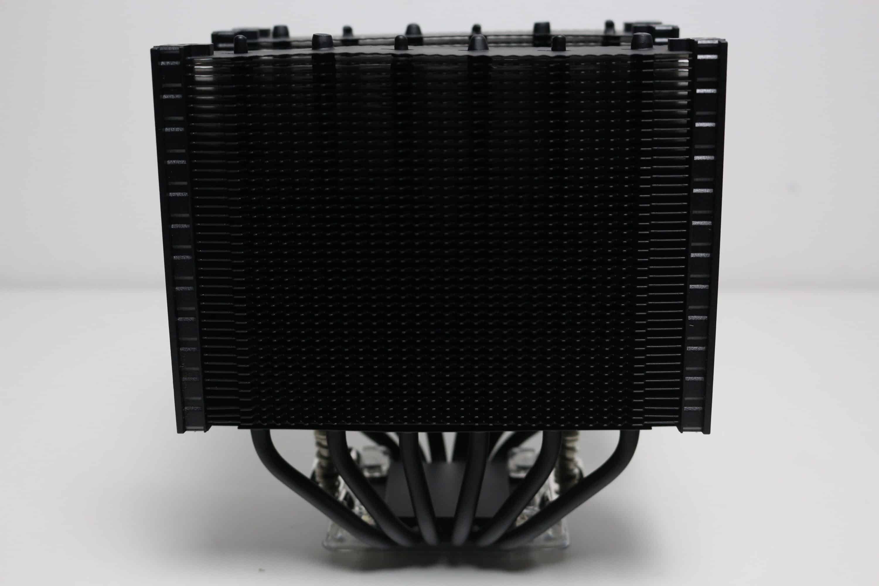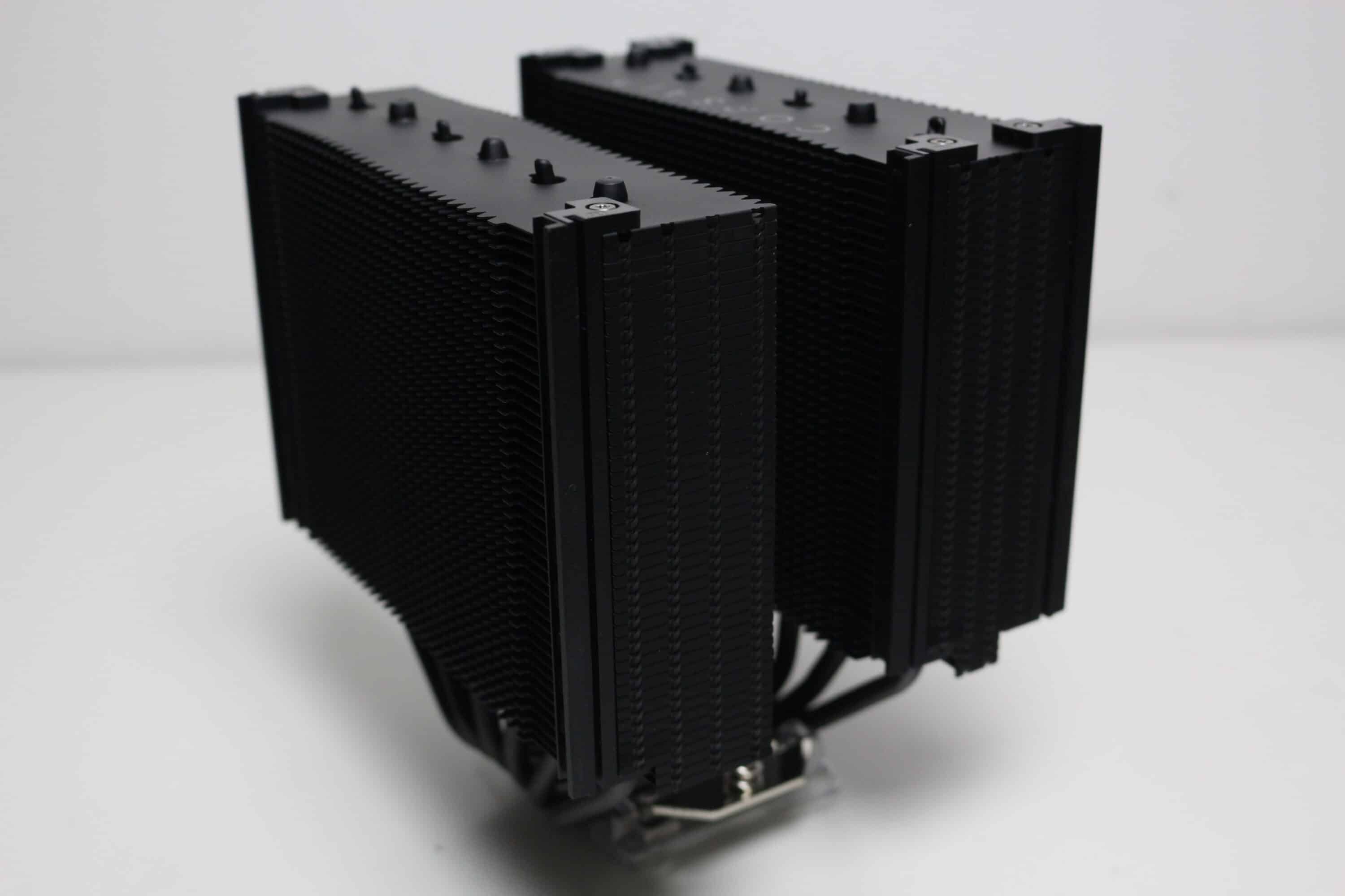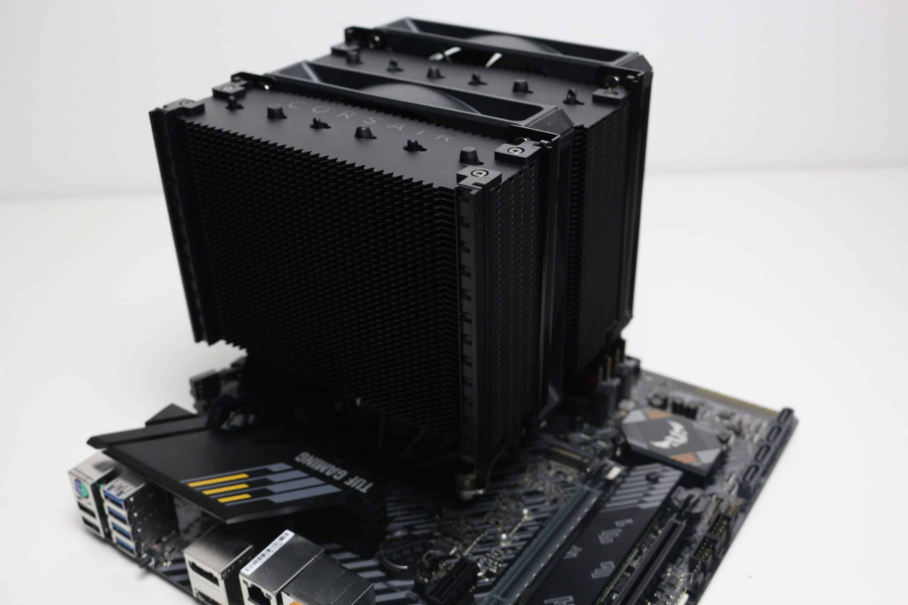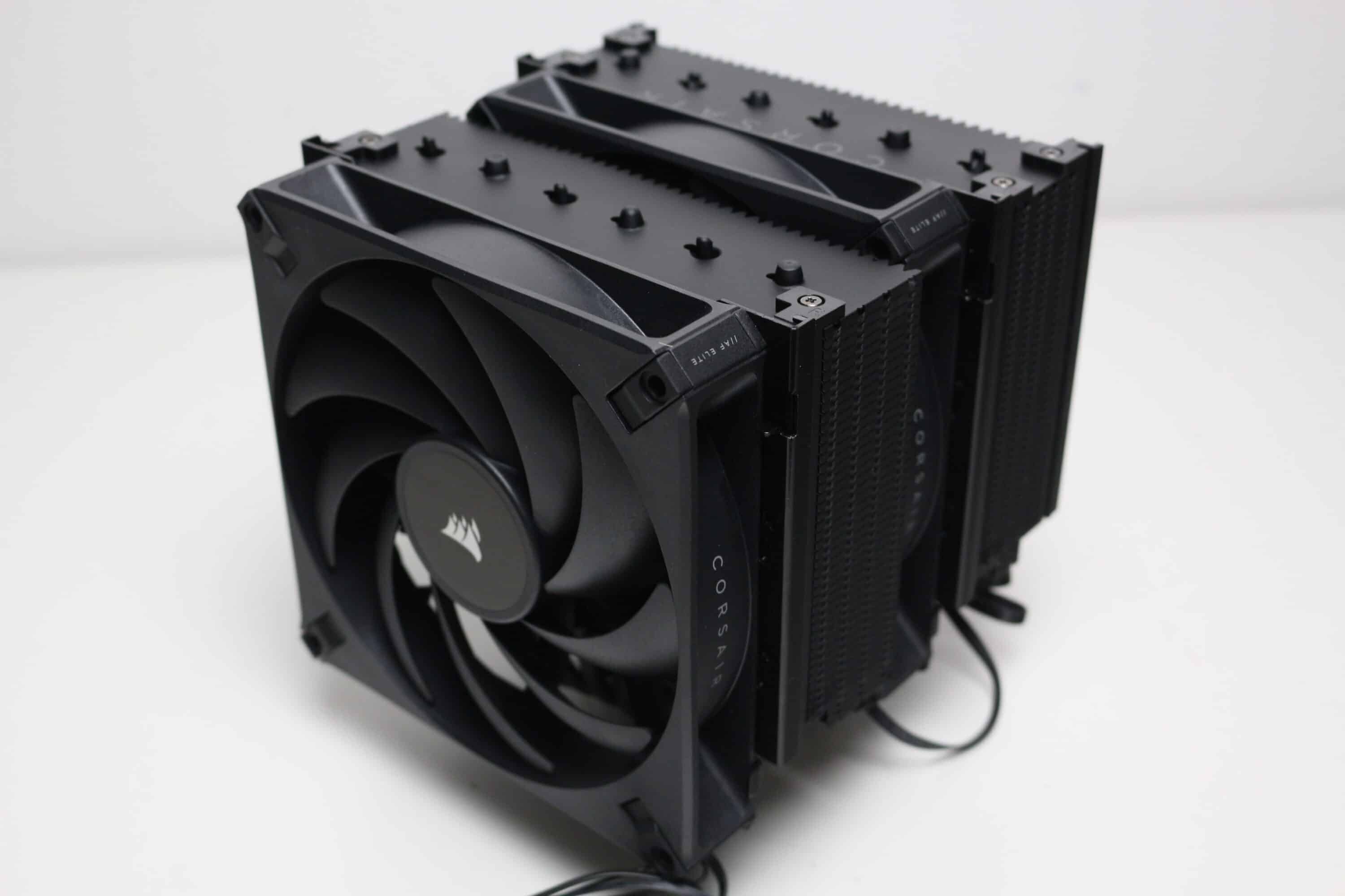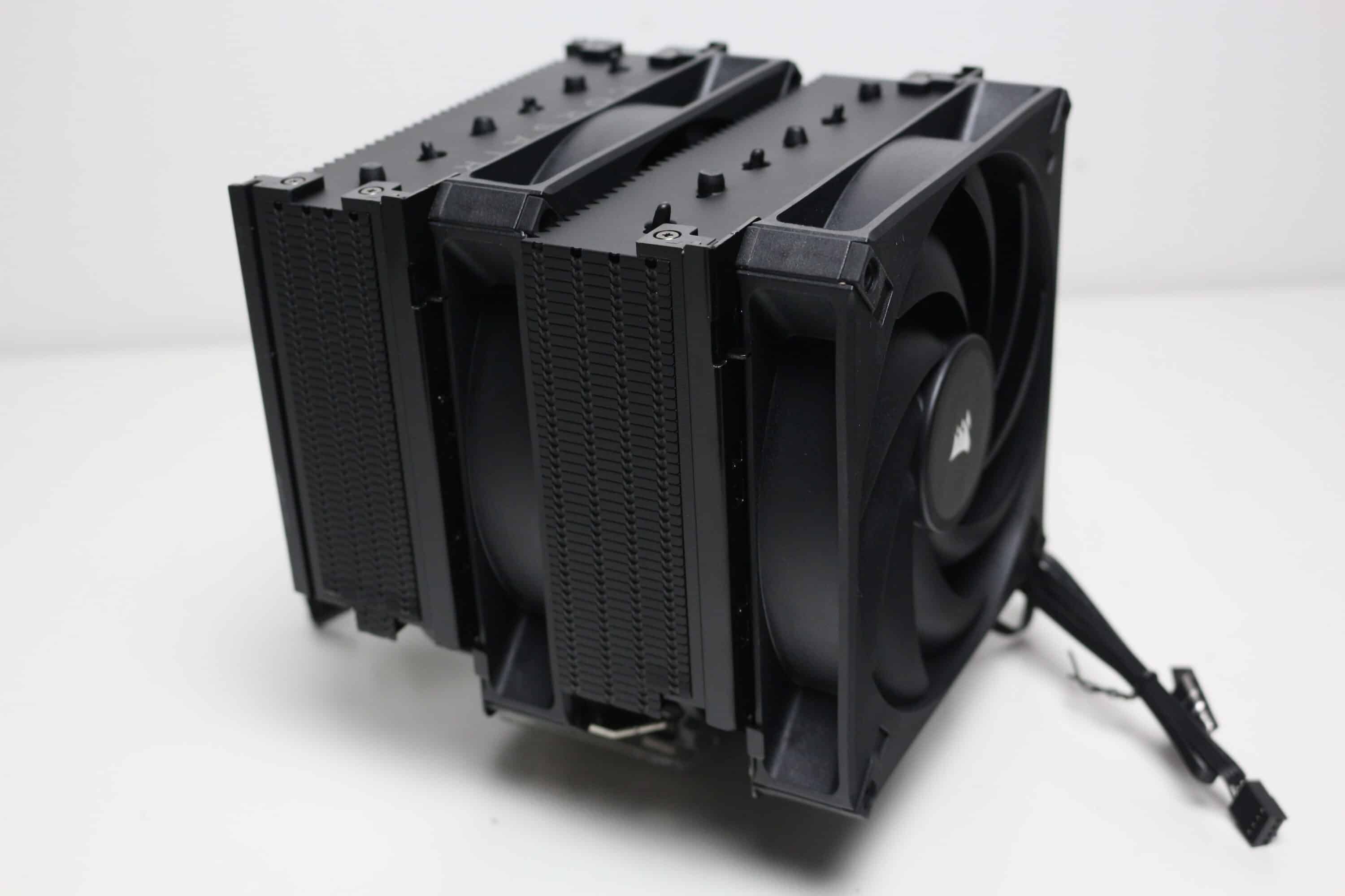 Der Kühlkörper besteht aus zwei Kühltürmen mit jeweils 45 horizontalen Aluminiumlamellen, die zur Verbesserung der Optik schwarz vernickelt wurden. Außerdem verfügen die Lamellen über Zacken, welche laut Hersteller Luftverwirbelungen minimieren sollen. Die Übertragung der Wärme vom Heatspreader der CPU zu den Lamellen erfolgt dabei über eine vernickelte Bodenplatte aus Kupfer sowie sechs schwarz vernickelte Heatpipes mit einem Durchmesser von jeweils sechs Millimetern. Die Enden der Heatpipes versteckt Corsair nicht mit einer Abdeckplatte. Stattdessen lässt sich auf dem hinteren Kühlturm aber ein unauffälliger Herstellerschriftzug erkennen.