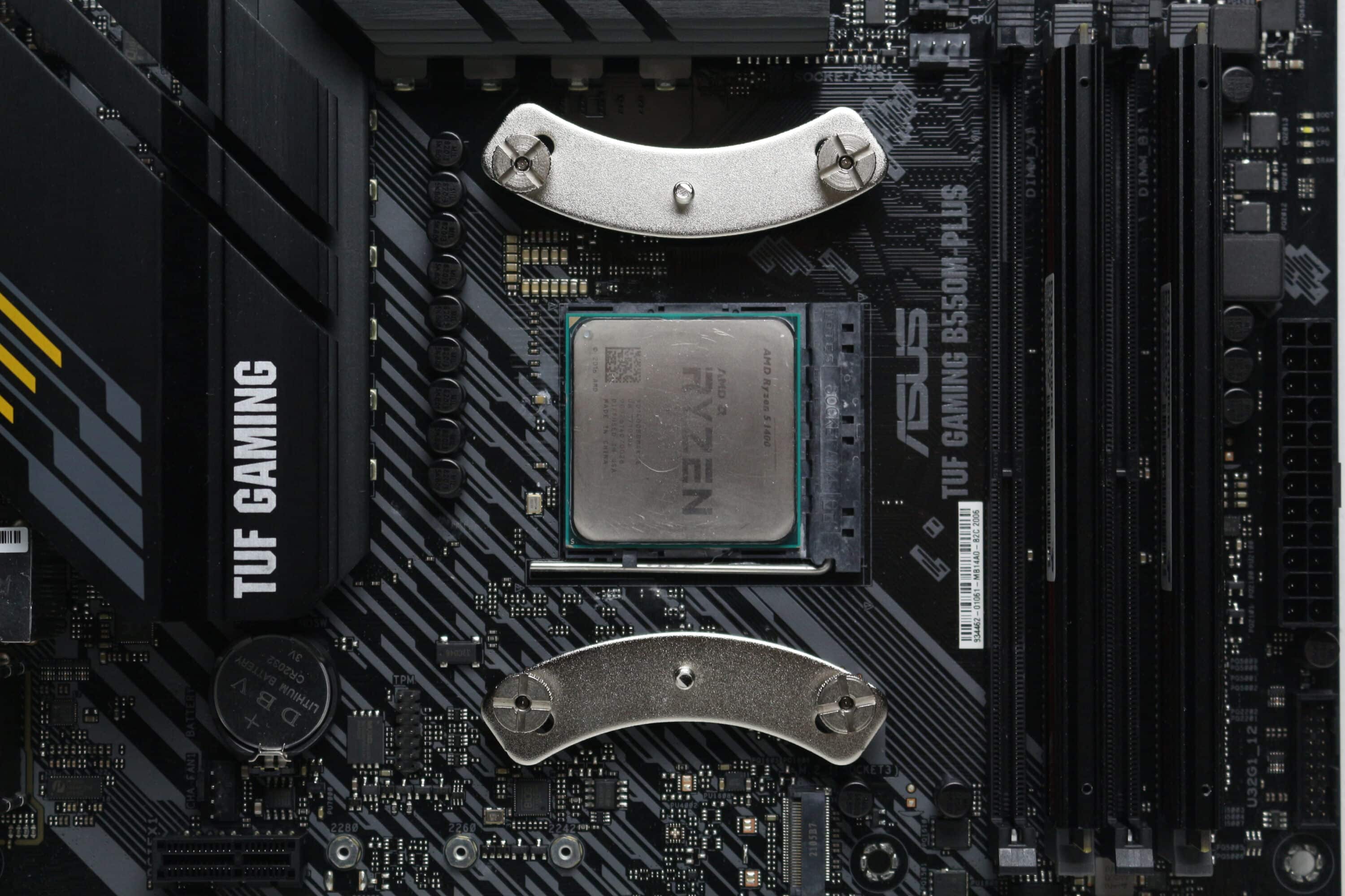 Bei einem AMD-Sockel muss man im ersten Schritt zunächst die Kunststoffbügel des AMD-Retentionmoduls entfernen. Diese werden dann mit vier Abstandshaltern ersetzt, welche auf beiden Seiten über unterschiedliche Gewinde verfügen. Anschließend legt man auf die Abstandshalter die passenden AMD-Bügel und schraubt diese mit den vier zugehörigen Schrauben fest.