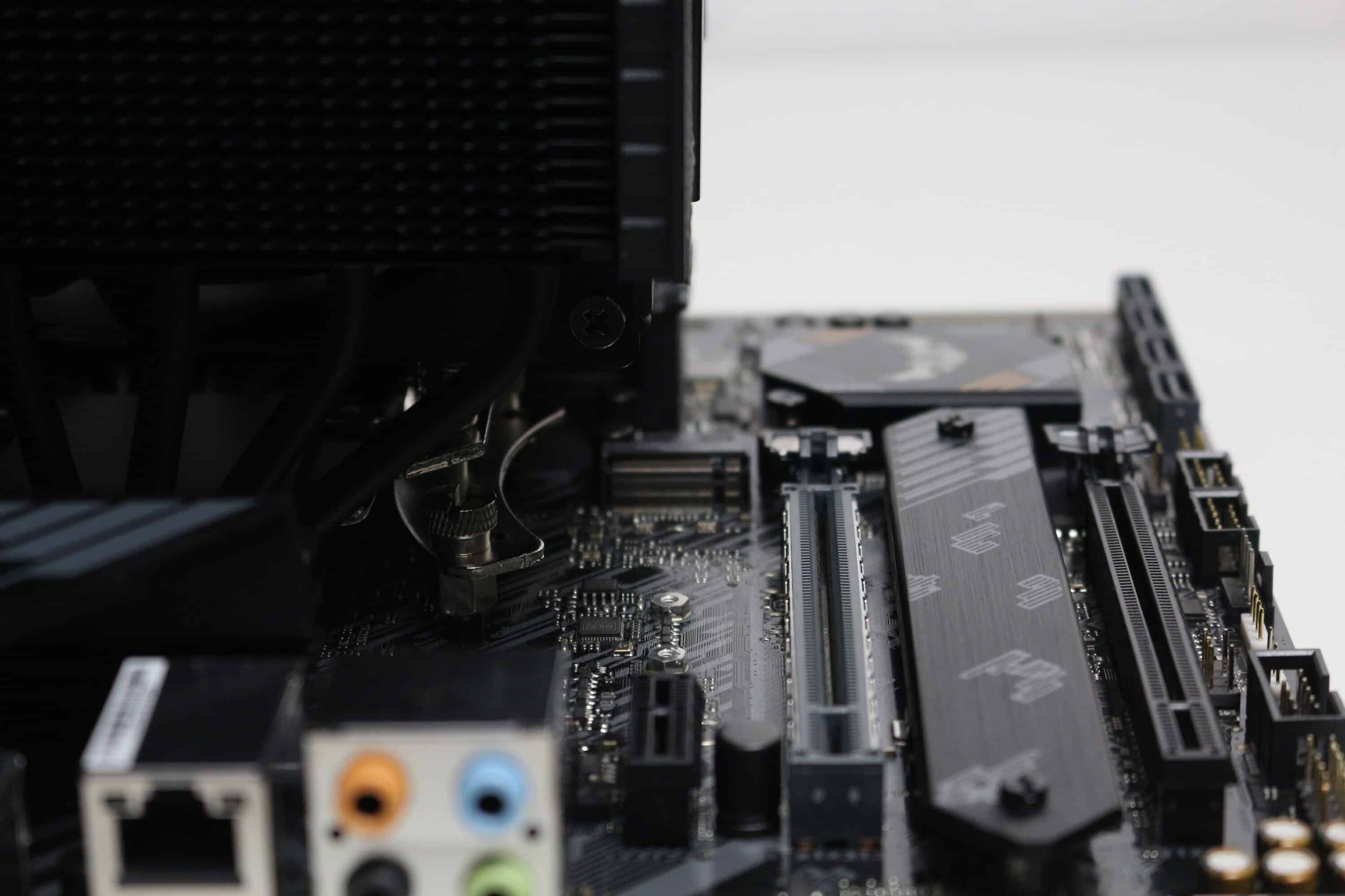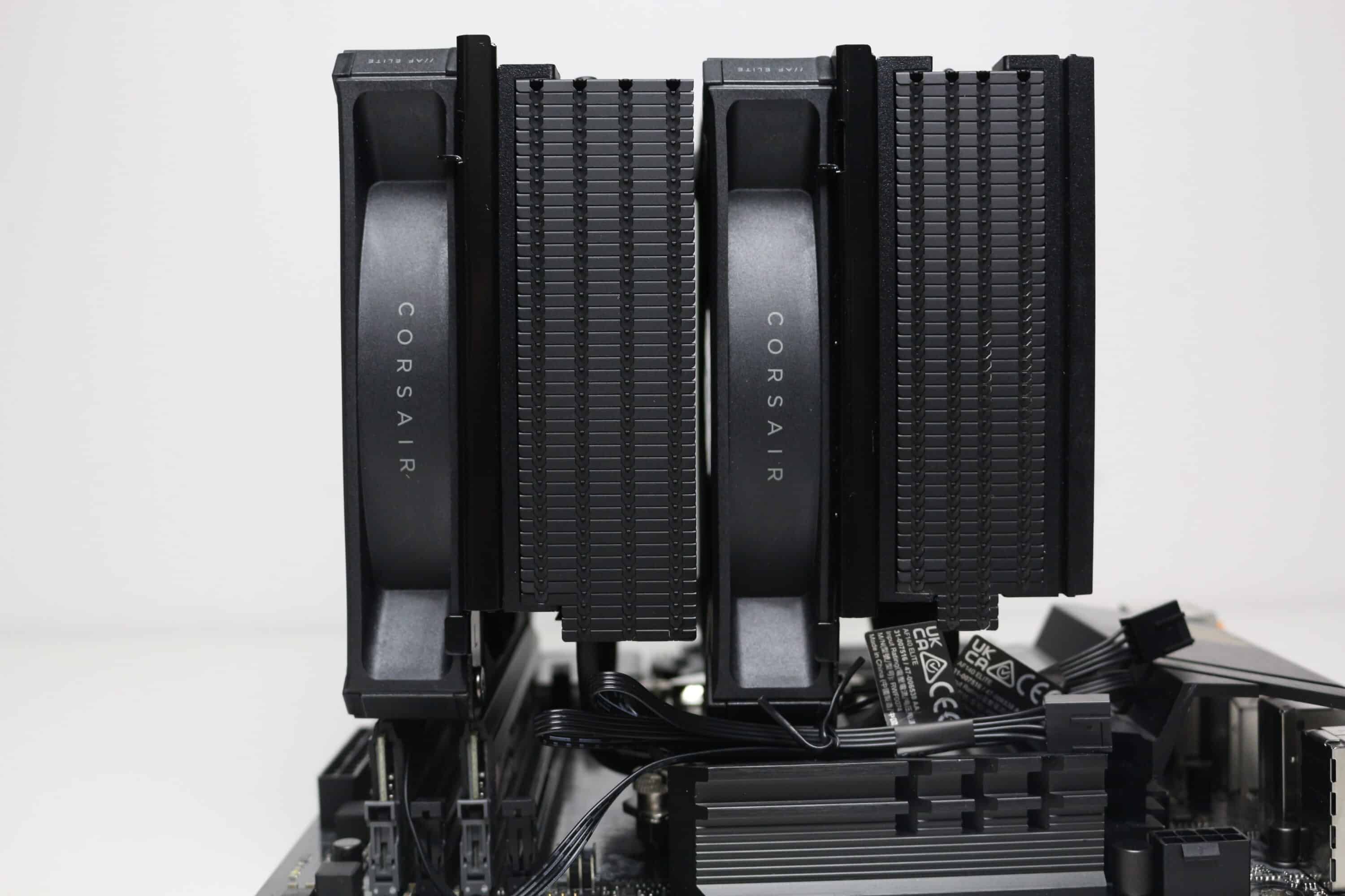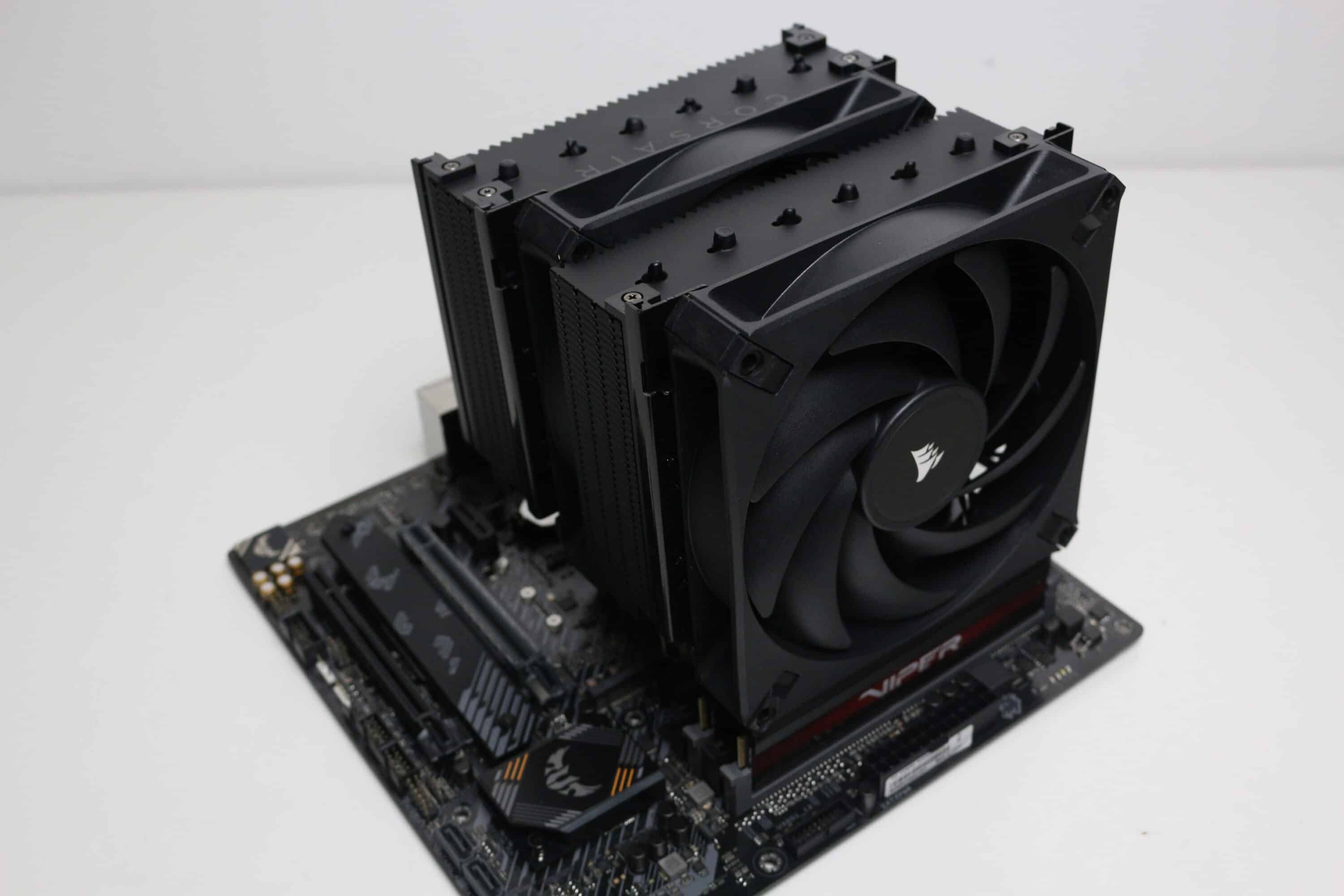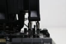 Die Montage des Corsair ist sehr durchdacht und einfach bzw. schnell durchführbar. Durch das ausgeklügelte Schienensystem zur Lüftermontage spart man sich zudem das lästige Hantieren mit den typischen Lüfterklammern und die Lüfter können zügig montiert und variabel platziert werden. Wie bereits erwähnt wurde, ist der Corsair A115 sehr ausladend. Er ragt in unserem Fall sowohl über alle vier RAM-Slots als auch über den ersten PCIe-Slot, der damit unbrauchbar wird. Letzteres hängt aber immer vom Layout des Mainboards ab. Bei hohen Arbeitsspeichermodulen kann der vordere Lüfter nach oben verschoben werden, ragt damit aber über den Kühlkörper hinaus.