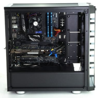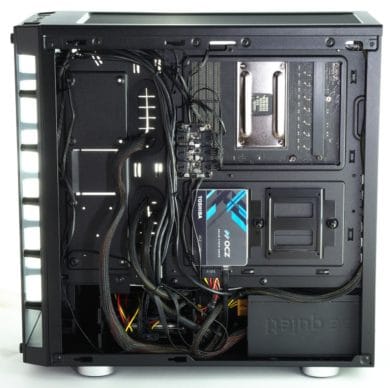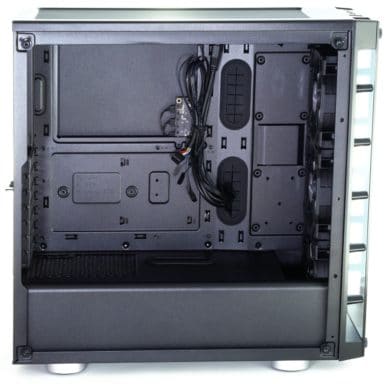 Der Einbau im iCUE 465X RGB geht gut von der Hand. Die Kabeldurchlässe sind sinnvoll platziert, groß genug und einfach zu erreichen. Verglichen mit den Spitzenreitern auf diesem Gebiet fällt das Gehäuse allerdings dennoch zurück: Zwar gibt es hinter dem Mainboardtray mehrere Ösen um Kabelbinder zu befestigen, doch hätte man in dieser Preisklasse ruhig Klettverschlüsse verbauen können. Auch angedeutete Kabelkanäle, wie sie manchmal anzutreffen sind, gibt es hier nicht.