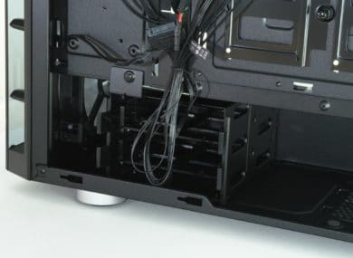 Wie bereits angedeutet, werden die beiden 3,5“-Laufwerke am Boden des Gehäuses untergebracht. Der Festplattenkäfig kann außerdem entfernt werden, um beispielsweise Platz für ein längeres Netzteil zu schaffen. Für kleinere 2,5“-Laufwerke bietet das Gehäuse zwei Halterungen hinter dem Mainboardtray an, und zwei weitere Modelle können direkt an diesem verschraubt werden.