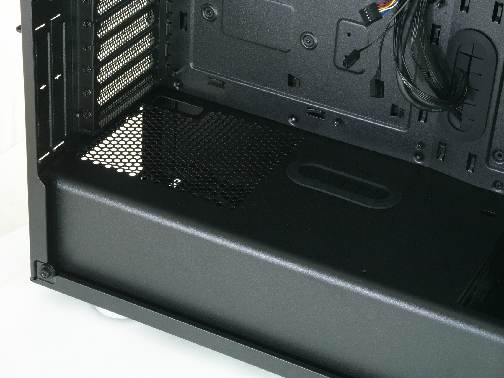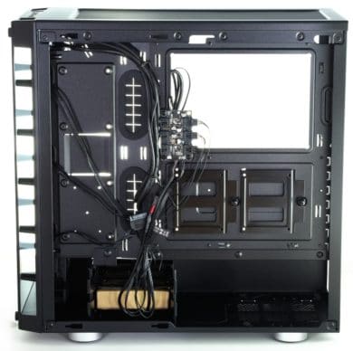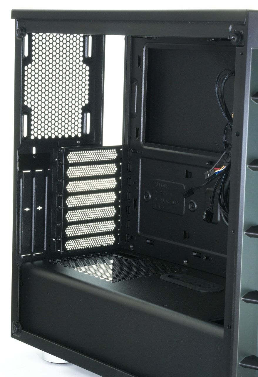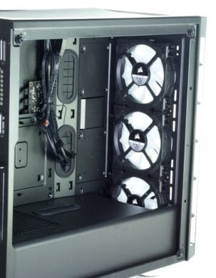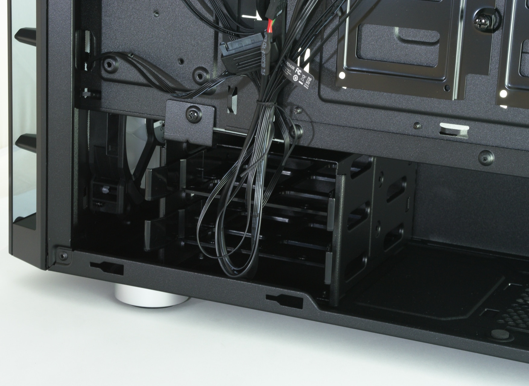 Im Innenraum präsentiert sich das Gehäuse sehr aufgeräumt. Zwischen dem Mainboard und den drei verbauten Frontlüftern gibt es keine Hindernisse, sodass der Luftstrom direkt auf den Prozessorkühler und die Grafikkarte trifft. Zudem ragt der unterste Lüfter zu einem Teil auch in die Netzteilkammer hinein, sodass auch die dort befindlichen Kabel und Festplatten gekühlt werden.