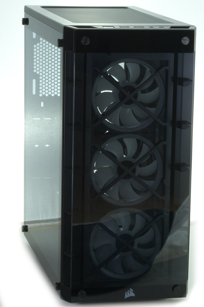 Corsair verbaut beim iCUE 465X RGB nicht nur das obligatorische Glasfenster an der Seite, sondern stattet auch die Front mit einem solchen Fenster aus. Beide Glaselemente werden dabei durch Rändelschrauben gehalten und können dementsprechend leicht abgenommen werden.