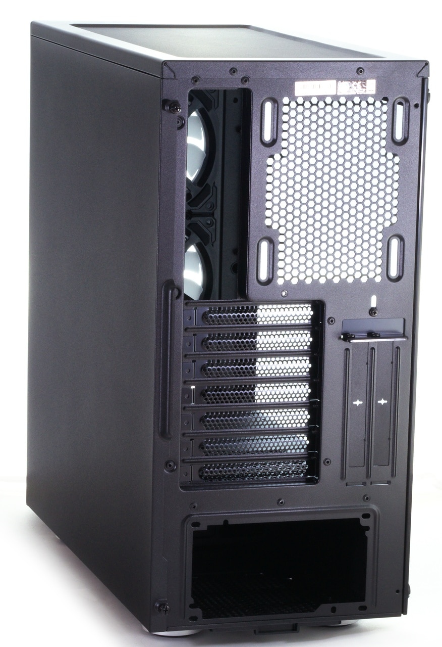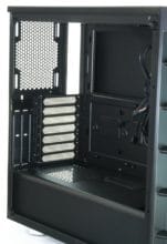 Auch am Heck gibt es keine größeren Überraschungen. Auffällig sind lediglich die beiden vertikalen PCI-Slots, die die aufrechte Montage einer Grafikkarte ermöglichen. Ist das geplant, muss allerdings eine Riser-Card und idealerweise auch eine Wasserkühlung gekauft werden, denn der Abstand zur Glasscheibe ist zu gering um bei einer Dual-Slot-Grafikkarte einen guten Airflow zu ermöglichen. Außerdem sind diese beiden Blenden als einziges nicht wiedereinsetzbar. Stattdessen müssen sie herausgebrochen werden.