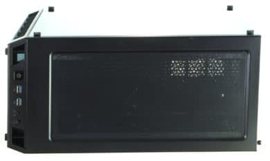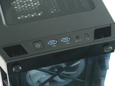 Das I/O-Panel befindet sich an der Oberseite des Gehäuses. Es besteht neben den Power- und Reset-Buttons noch aus einer kombinierten Klinkenbuchse und zwei USB-3.0-Buchsen. Leider setzt Corsair bei diesen auf eine aufgebogene Metalleinfassung. Das hat zwar in der Praxis keinerlei Nachteile, ist aber optisch nicht die schönste Wahl.