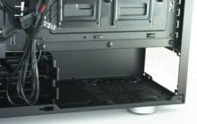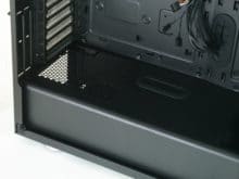 Die Laufwerke werden dabei allesamt durch eine direkte Verschraubung gehalten, während die 3,5“-Festplatten optional auch werkzeuglos, aber nicht entkoppelt montiert werden können. Eine Besonderheit gibt es zudem am Netzteil: Dieses kann sowohl nach unten als auch nach oben gerichtet werden, da sich in der Trennwand über dem Netzteil Luftdurchlässe befinden. Wer besonders abwegig denkt, könnte hier sogar ein SFX-Netzteil einsetzen und somit die Belüftung der Grafikkarte etwas aufbessern, doch das dürfte nur für die wenigsten Nutzer wirklich von Interesse sein.