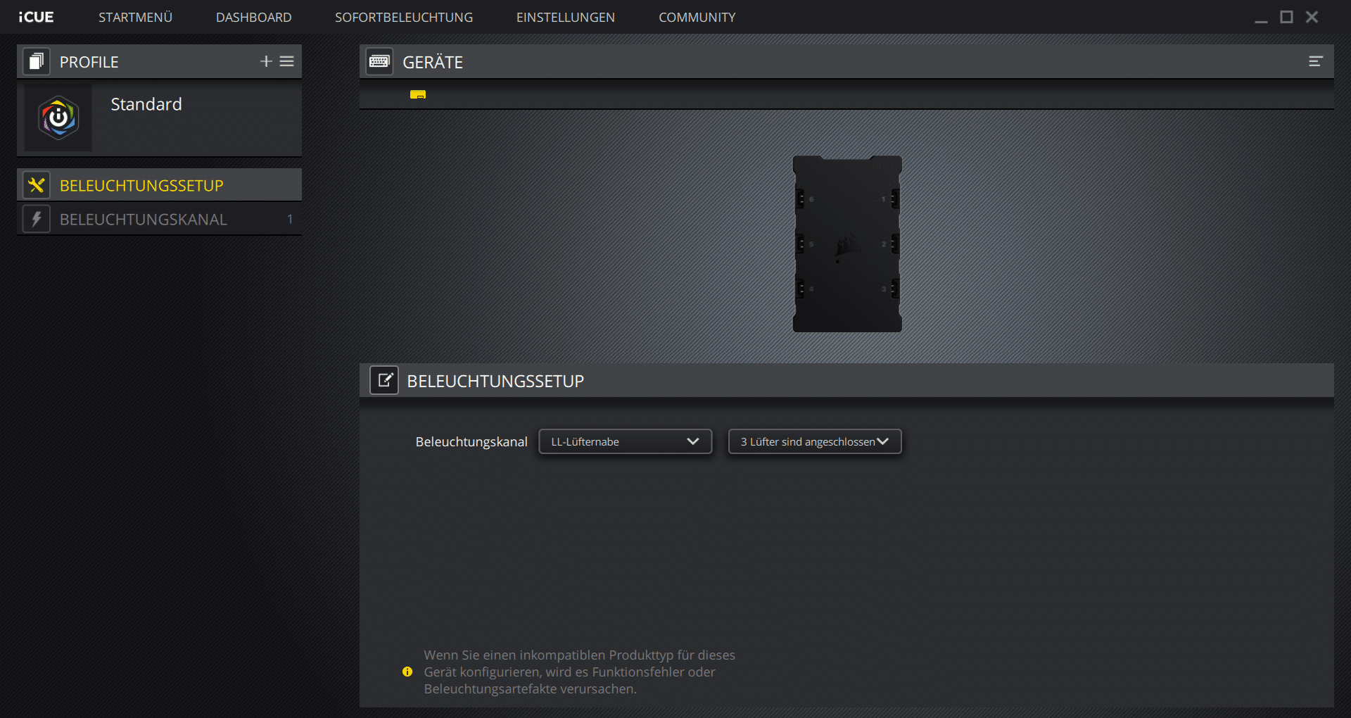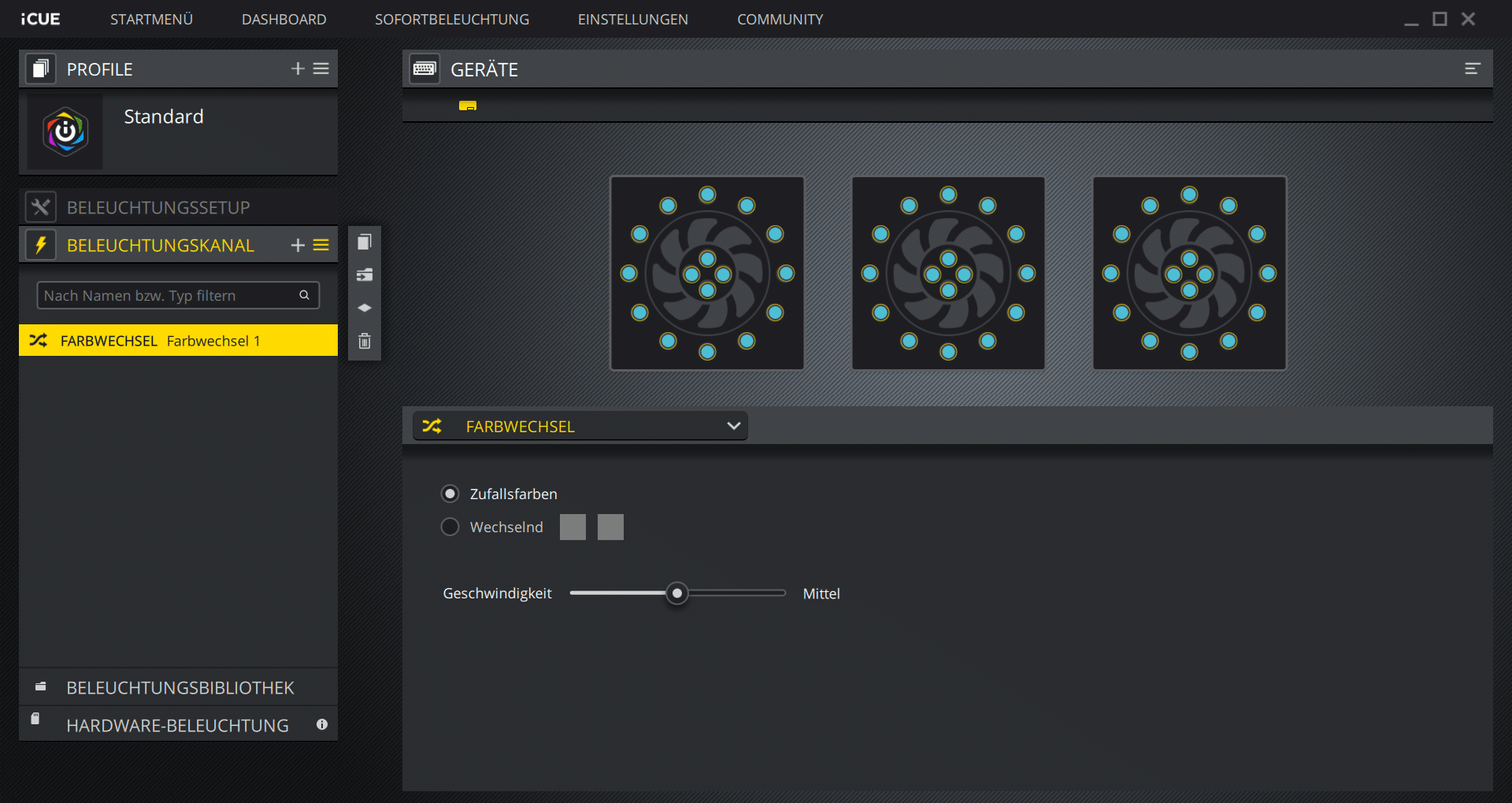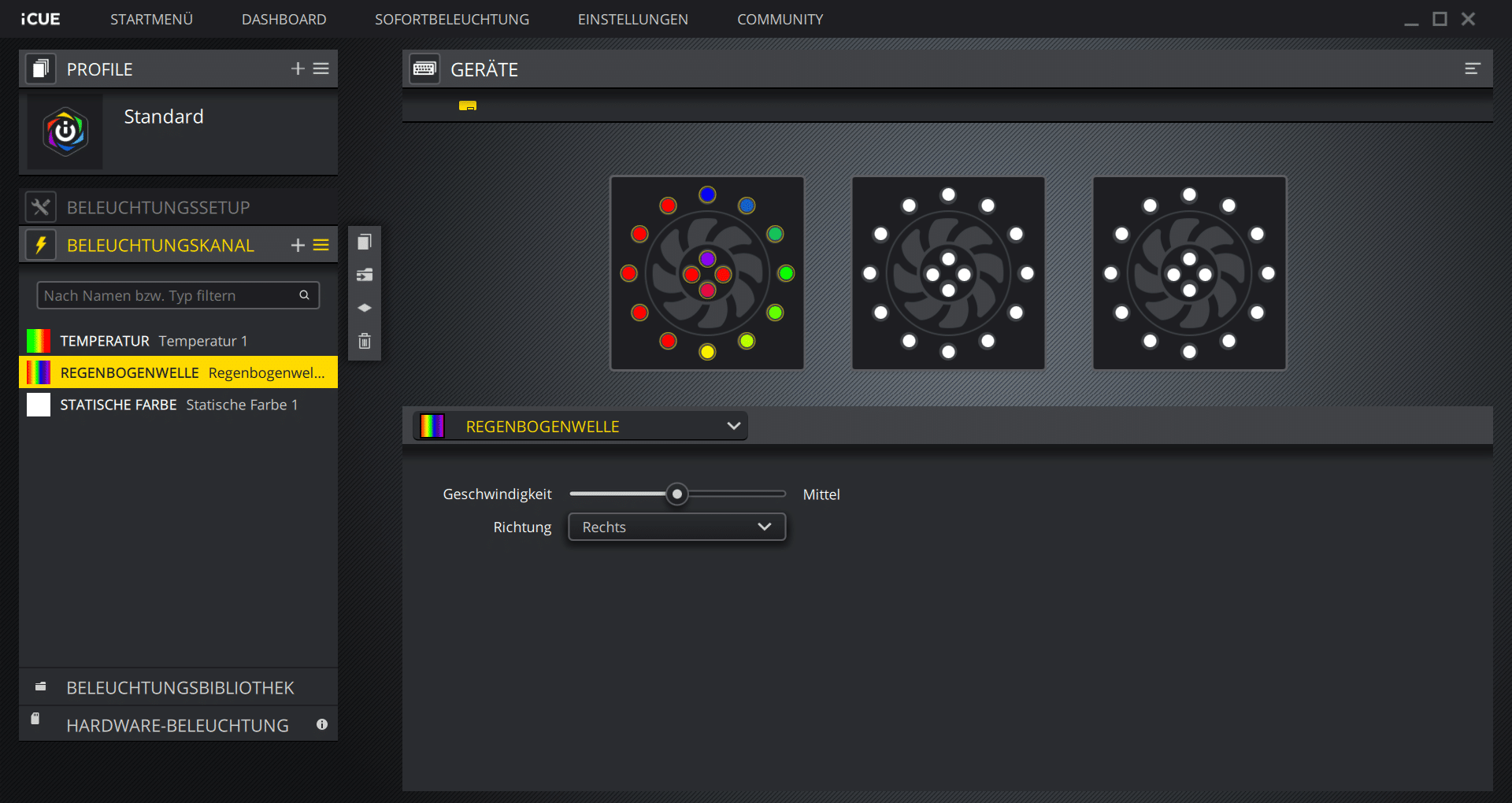 Zudem gefällt uns auch die ARGB-Beleuchtung, die durch 16 LEDs pro Lüfter realisiert und durch die für den Hersteller übliche iCUE-Software angesteuert wird. Corsair bietet hier das gewohnt umfangreiche Paket mit modernem UI und zahlreichen Lichteffekten, die angepasst und frei zusammengestellt werden können. Eine besonders nette Spielerei ist beispielsweise die Visualisierung der Temperatur der Sensoren im System.