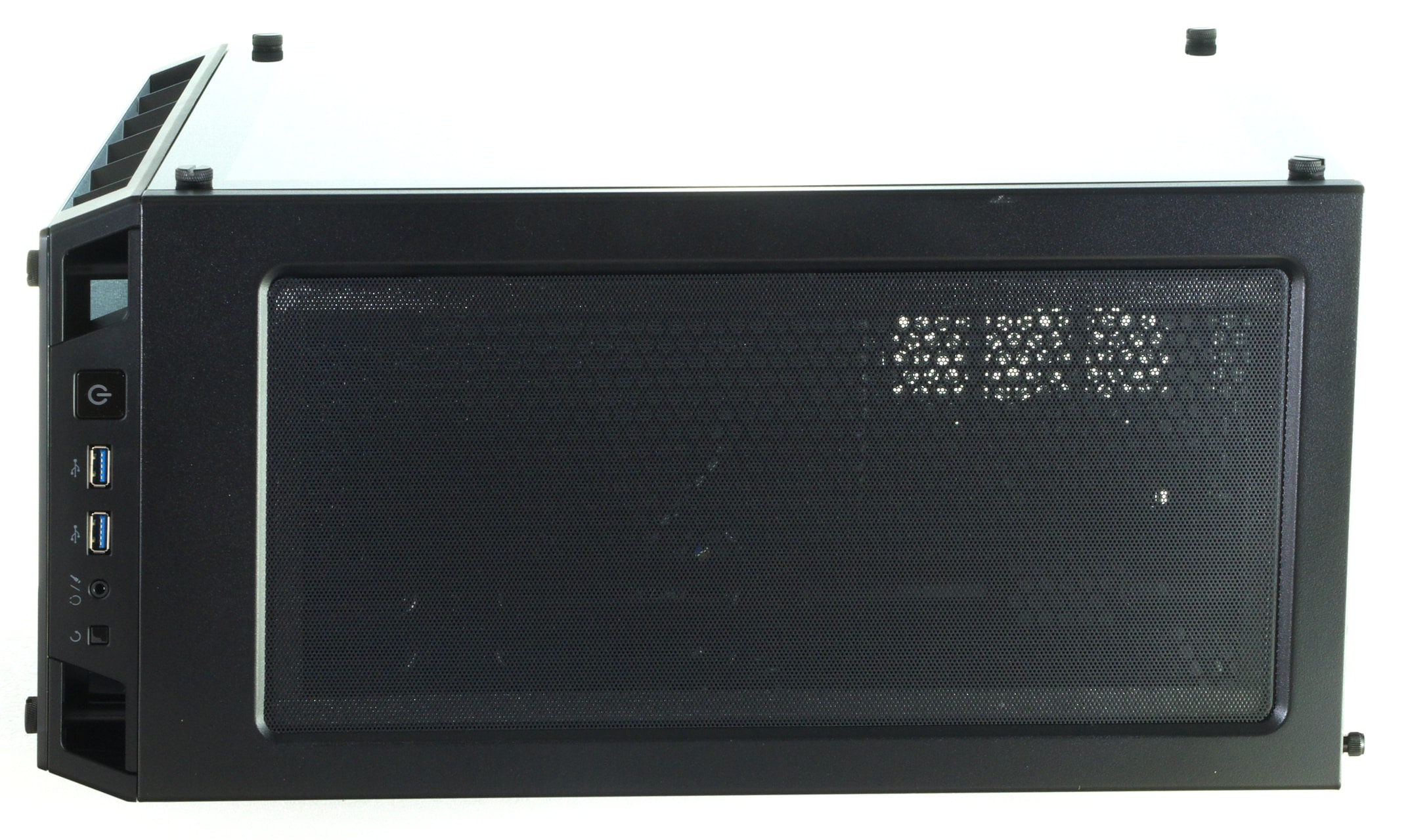 An der Vorderseite fallen, abseits der Glasscheibe, insbesondere die großen Luftschlitze auf. An den Seiten sowie oben gibt es große Lufteinlässe, sodass die Frontlüfter hier gut an Nachschub gelangen. Ein Staubfilter direkt vor den Lüftern verhindert dabei eine Verschmutzung. Zur Reinigung muss glücklicherweise nicht die gesamte Vorderseite abgenommen werden, sondern es reicht, das Fenster abzuschrauben. Das ist wesentlich angenehmer, als die oft verwendeten Haken der Frontabdeckung auszulösen.