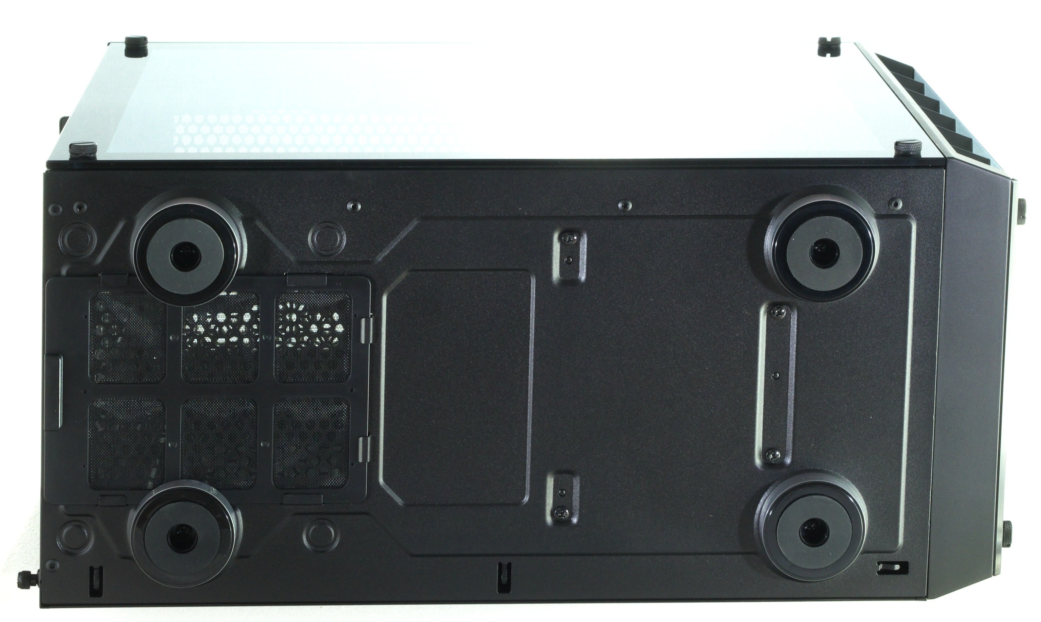 Auch die Unterseite des Gehäuses ist klassisch gehalten. Es gibt vier große, entkoppelte Standfüße sowie einen Staubfilter für das Netzteil, der von hinten her entfernt werden kann. Während die Verarbeitungsqualität des Gehäuses sonst überall tadellos ist, konnten wir hier einen winzigen Makel feststellen: Einer der Standfüße weist an einer Stelle eine kleine Beschädigung auf. Hier scheint bei der Produktion ein Missgeschick passiert zu sein. Sonst ist die Verarbeitungsqualität des Gehäuses auf gewohnt hohem Niveau – wenn auch mit Stahl, statt mit Aluminium als Hauptmaterial.