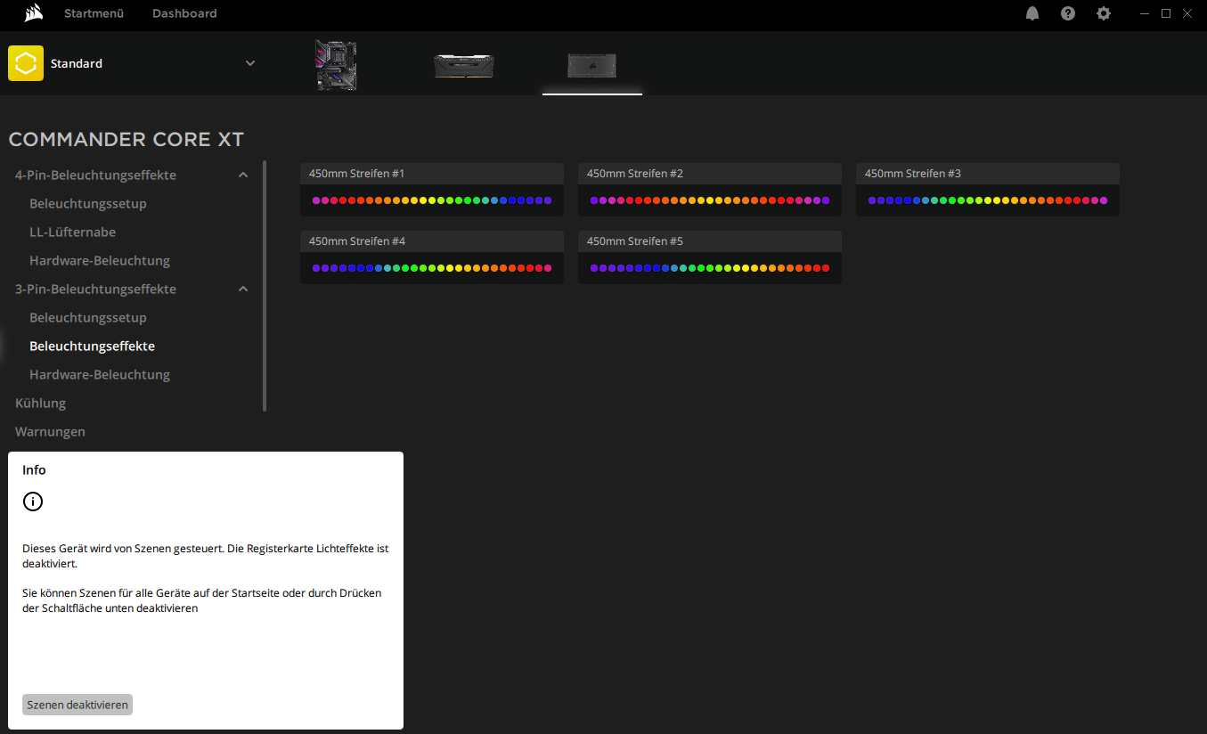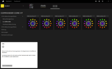 Die Beleuchtung und auch die Lüftergeschwindigkeiten lassen sich zusammengefasst in der Corsair iCUE Software steuern und anpassen. Für die gesamte Technik im Gehäuse ist dabei die enthaltene Commander Core XT Steuerung zuständig. An dieser werden die Lüfter und RGB-Stripes eingesteckt und schon bietet sich die Möglichkeit, die Beleuchtung und auch die Lüftergeschwindigkeit über die iCUE Software zu steuern. Dementsprechend sind die Komponenten auch die der Software unter dem Reiter „COMMANDER CORE XT“ zusammengefasst. Taucht man tiefer ein, erkennt man, dass die Beleuchtung der Lüfter über die „4-Pin-Beleuchtungseffekte“ geregelt wird. Die RGB-Stripes können hingegen unter „3-Pin-Beleuchtungseffekte“ gefunden werden. Die Stripes sowie auch die Lüfter verfügen über eine adressierbare RGB-Beleuchtung.