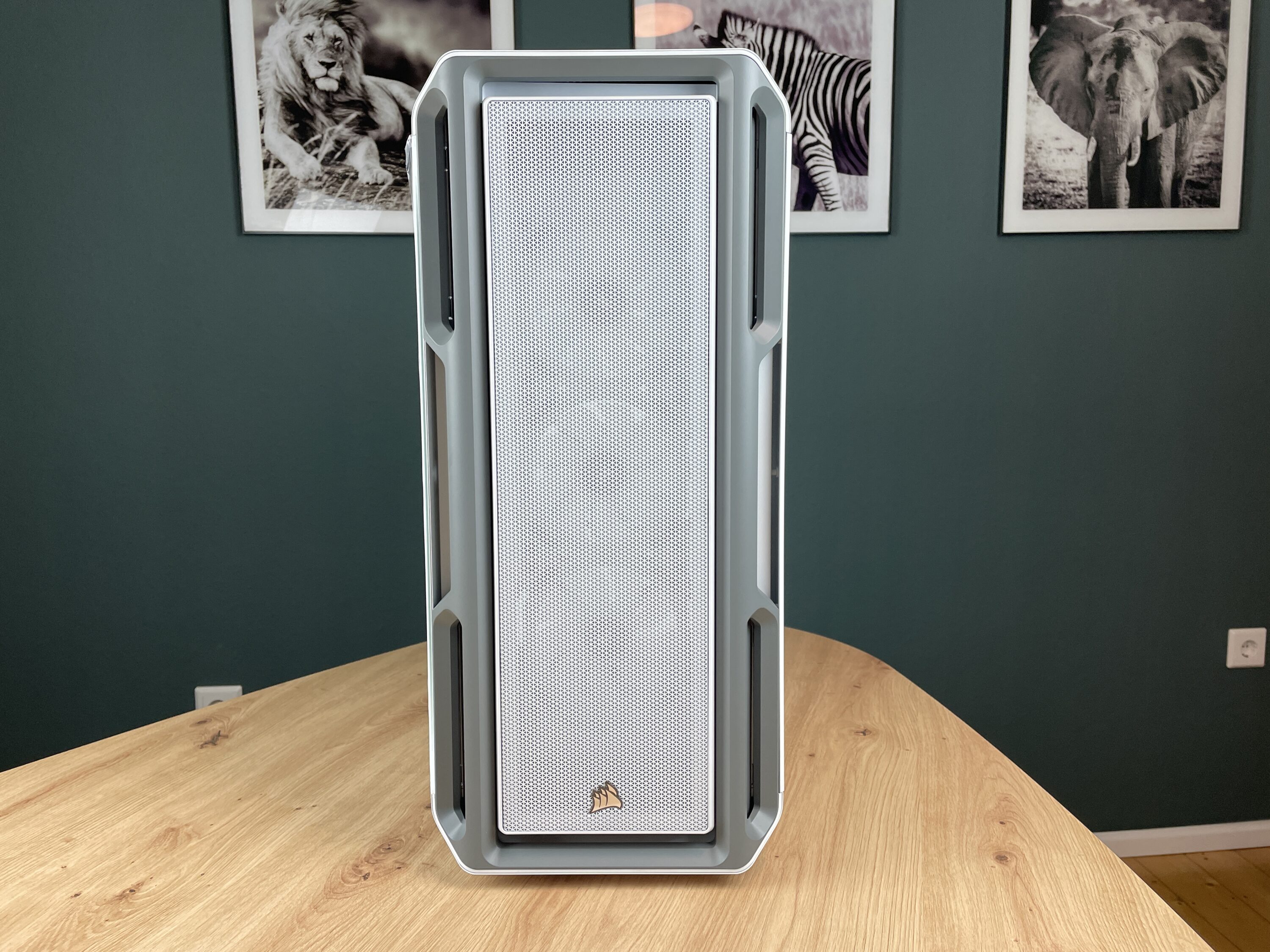 Die Front hebt sich farblich vom Rest des iCUE 5000T RGB ab. Der Rahmen rund um das herauslösbare Gitter in der Front wurde in einem hellen Grau gestaltet und bildet so einen schönen Kontrast zu den weißen Teilen des Gehäuses. Als Besonderheit verstecken sich hinter den Öffnungen an der linken und rechten Seite jeweils ein RGB-Streifen, auf die wir später in diesem Test noch genauer eingehen.