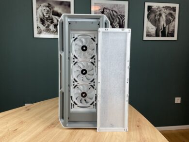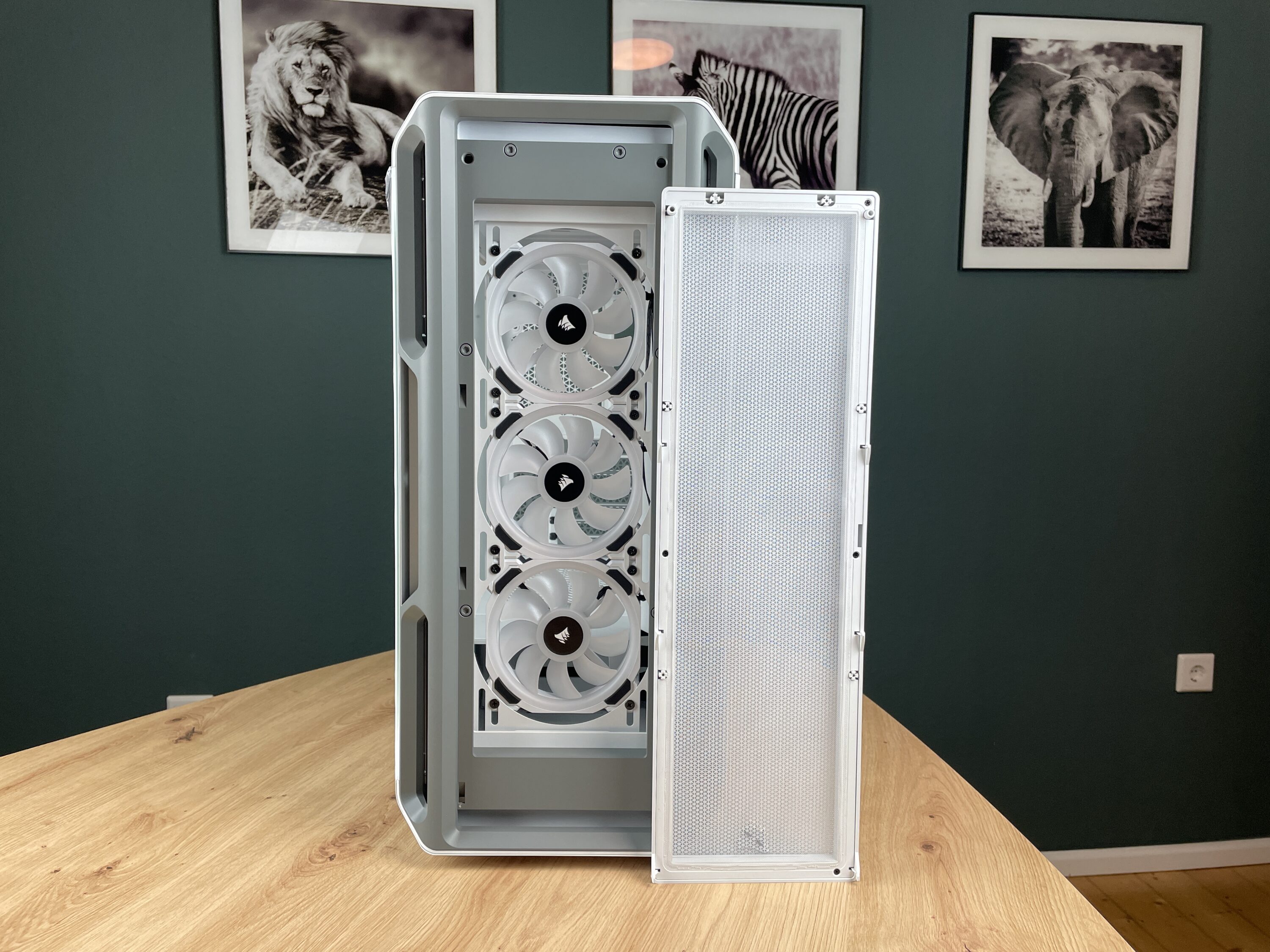 Das Gitter in der Front ist in Weiß gehalten und lässt sich sehr bequem, durch einfaches Ziehen an der obersten Kante, herauslösen. Auch die Befestigung ist sehr gut gestaltet. Es wird von oben eingesteckt und dann durch Magneten an Ort und Stelle gehalten. Der Rahmen des Gitters ist aus Plastik, welcher von innen mit einem Staubfilter bespannt ist. Hinter dem Lüftungsgitter befinden sich die drei weißen 120-mm-Corsair-LL-Lüfter.