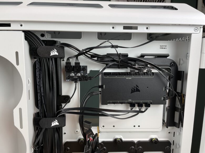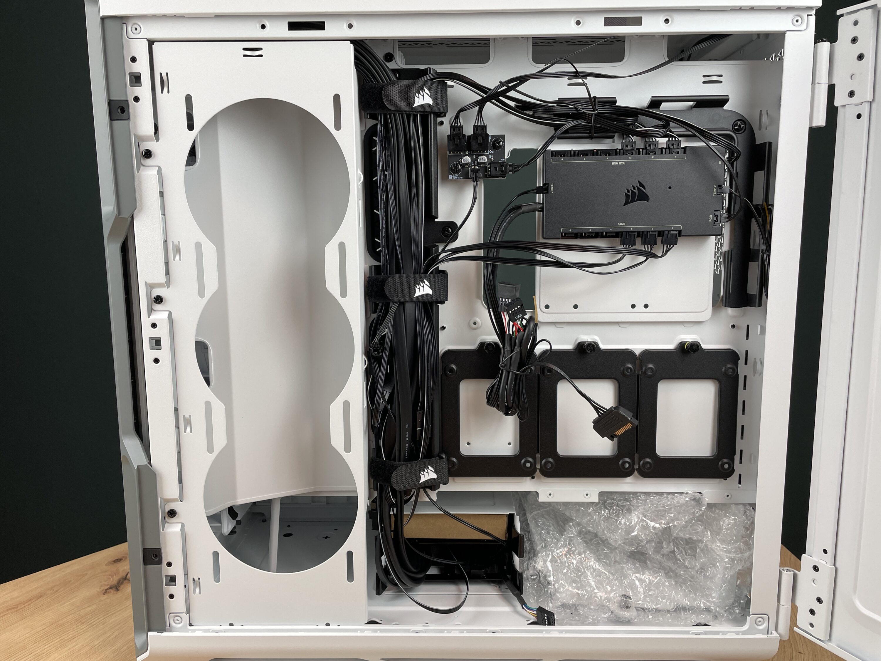 Auf der Rückseite des Mainboardtrays ist ordentlich etwas los. Hier finden wir neben den drei SSD-Montagerahmen auch ein weiteres großes Feature des Corsair iCUE 5000T RGB. Nämlich die Lüfter- und Beleuchtungssteuerung, die über die Commander Core XT Steuerung geregelt und verbunden wird. Sehr positiv ist, dass hier bereits alles vorinstalliert ist und man das Kabelmanagement nur noch an seine Bedürfnisse anpassen muss.