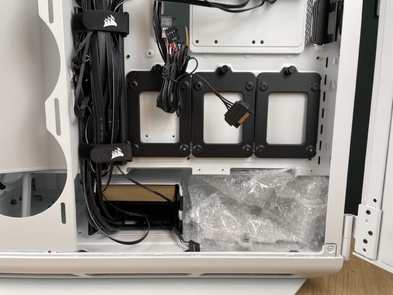 Um beim Thema Kabelmanagement zu bleiben, möchten wir die Möglichkeiten, die dem Anwender hier geboten werden, auch nochmal positiv hervorheben. Denn auch hier hat das iCUE 5000T einiges zu bieten. Im Allgemeinen bietet die Rückseite rund 30 mm Platz für Kabel und sonstige Komponenten. Durch die gut platzierten Kabeldurchlässe lassen sich die einzelnen Kabel präzise und ordentlich in den Innenraum verlegen. Um die Übersicht zu behalten, werden zusätzlich Kabelführungen mit Klettkabelbindern und weitere Befestigungsmöglichkeiten für weitere Kabelbinder geboten.
