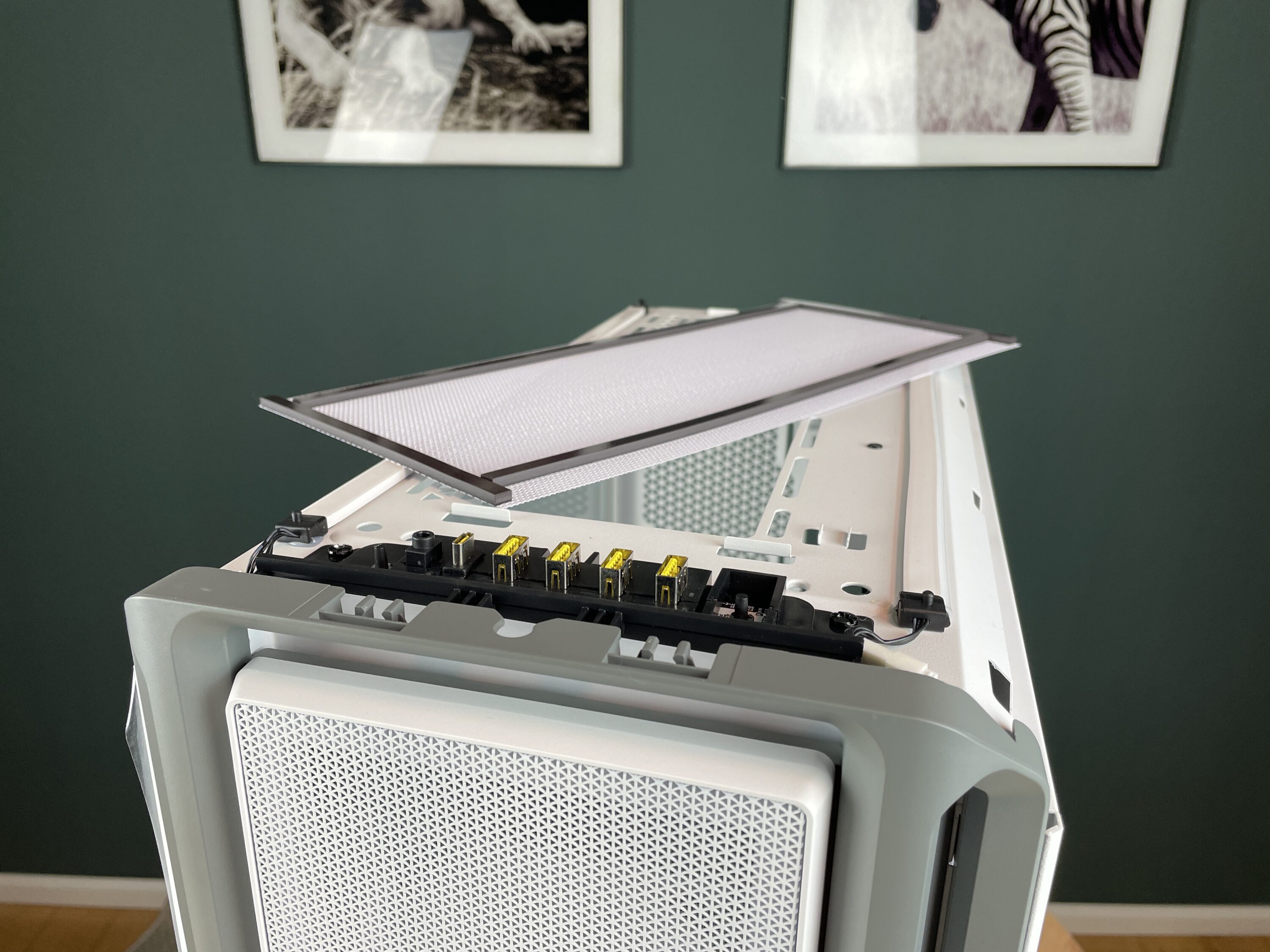 Der Deckel des Corsair iCUE 5000T RGB ist aus einem Teil gefertigt und lässt sich durch eine Aussparung im Heck-Bereich nach oben herausziehen. Da der Deckel fest in das Grundgerüst des Gehäuses einrastet, muss man für das Herauslösen und das Befestigen etwas Kraft anwenden. Hat man den Deckel aber erstmal gelöst, lässt sich darunter ein Staubfilter erkennen, der mit Magneten versehen ist und, durch Begrenzungen am Gehäuse, perfekt über der Aussparung für Radiatoren oder Lüfter platziert ist. Auch im Deckel wurden RGB-Stripes platziert, die man an den langen Seiten rechts und links finden kann.