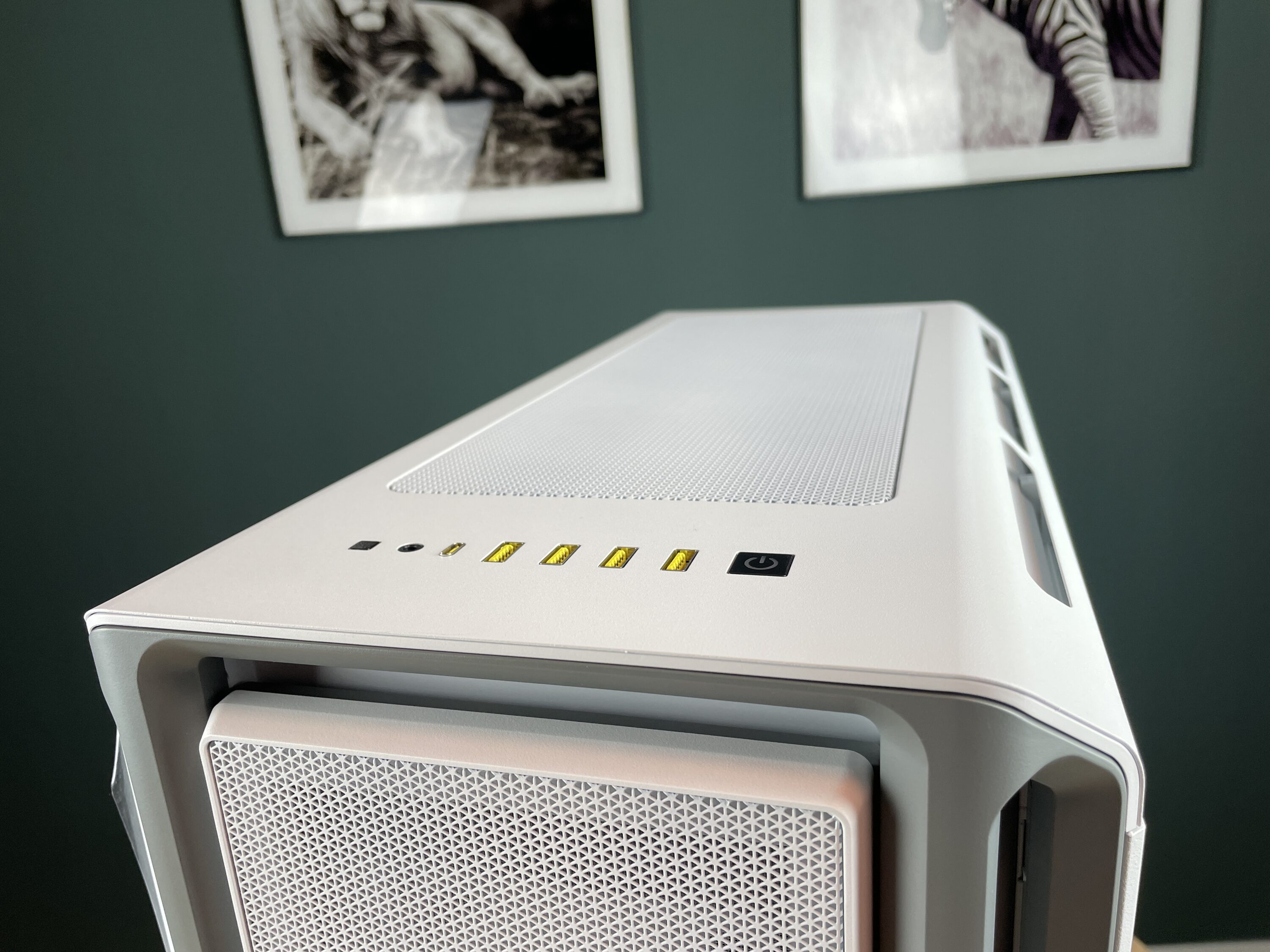 Die Front-I/O im Deckel lässt keine Wünsche übrig. Neben dem typischen Power- und Rest-Knopf, hat Corsair hier einiges aufgefahren. Insgesamt finden wir hier fünf USB-Anschlüsse, die sich in vier USB-A-3.0- und einen USB-C-3.1-Anschluss aufteilen. Auch auf eine Audio-Buchse muss man nicht verzichten.