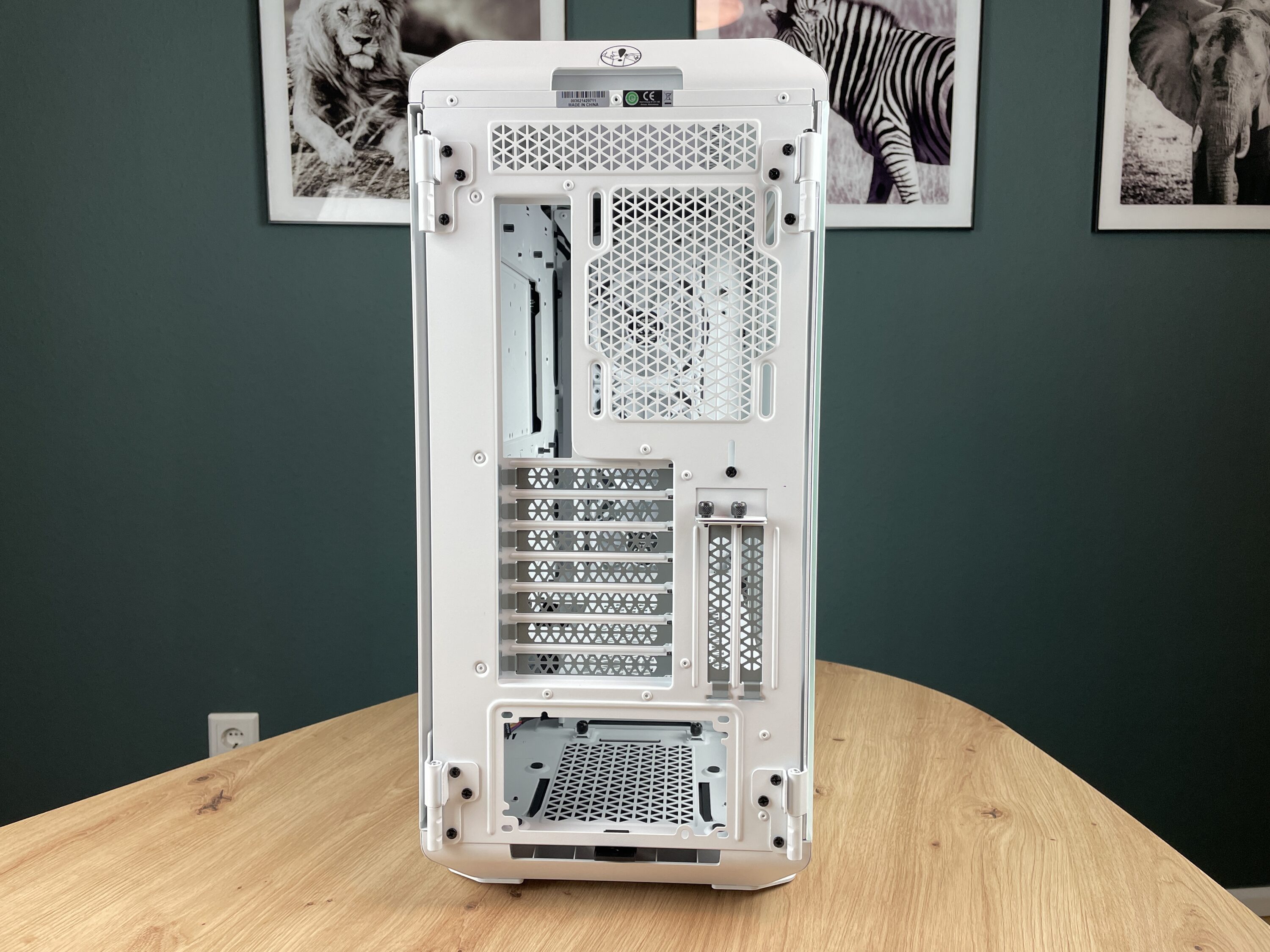 Der Heckbereich verfügt über Perforierungen soweit das Auge reicht. Beginnend bei dem Element oberhalb der Lüfterbefestigungen, bis hin zu den einzelnen PCI-Steckplatzblenden. Als kleine Besonderheit bringt das iCUE 5000T zwei vertikale Grafikkartenplätze mit sich. Die Aussparung zum Herauslösen des Deckels ist durch eine kleine Zeichnung gekennzeichnet und befindet sich am obersten Ende des Hecks.