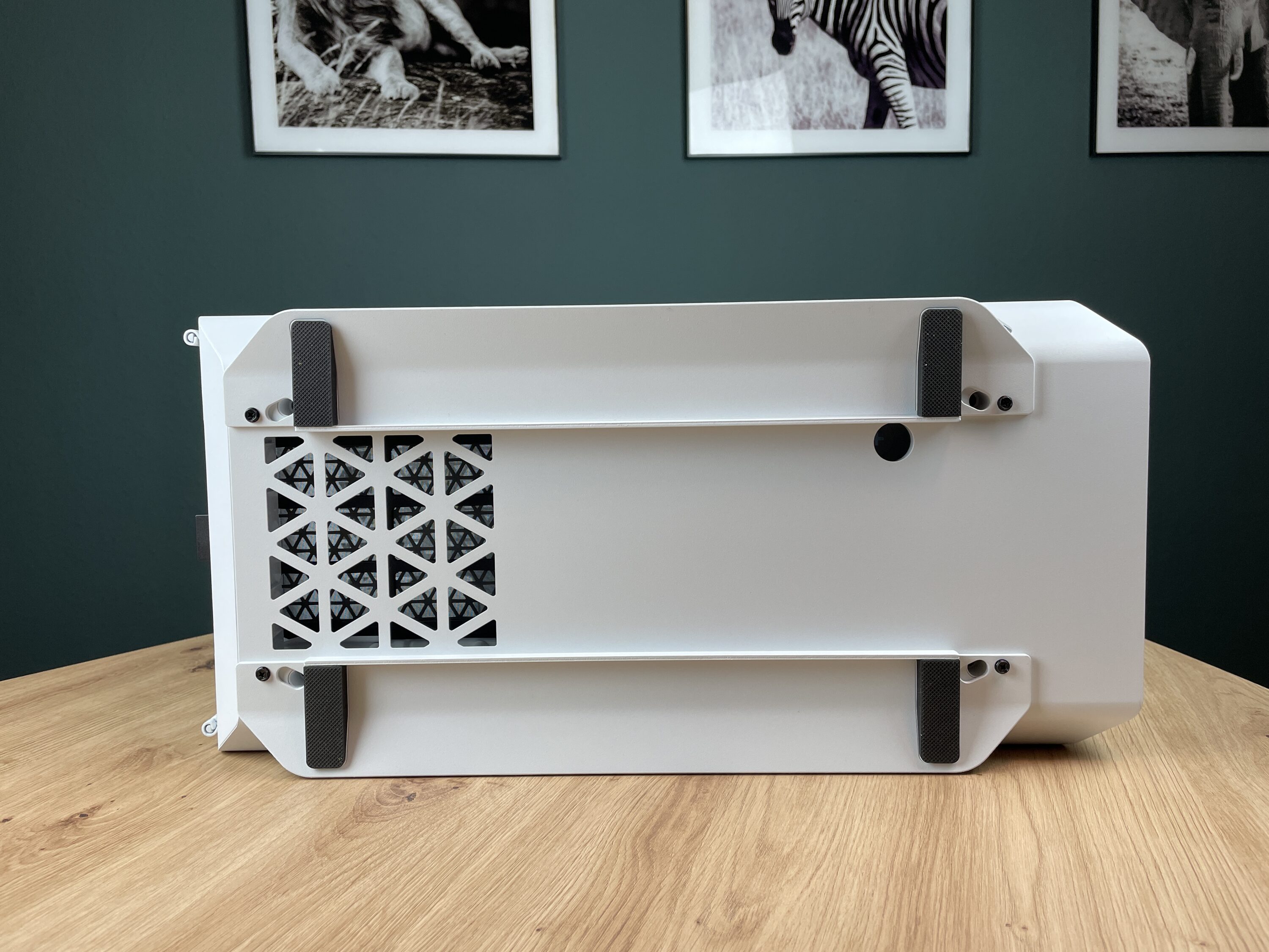 Die Unterseite des 5000T RGB wirkt insgesamt sehr clean und besticht mit den elegant designten Standfüßen, welche mit gummierten Standflächen ausgestattet sind. So wird der bestmögliche Halt auf dem Schreibtisch garantiert. Auch an frische Luft für das Netzteil wurde gedacht. Unterhalb der Netzteilposition befindet sich ebenfalls ein perforierter Bereich, der mit einem Staubfilter versehen wurde.