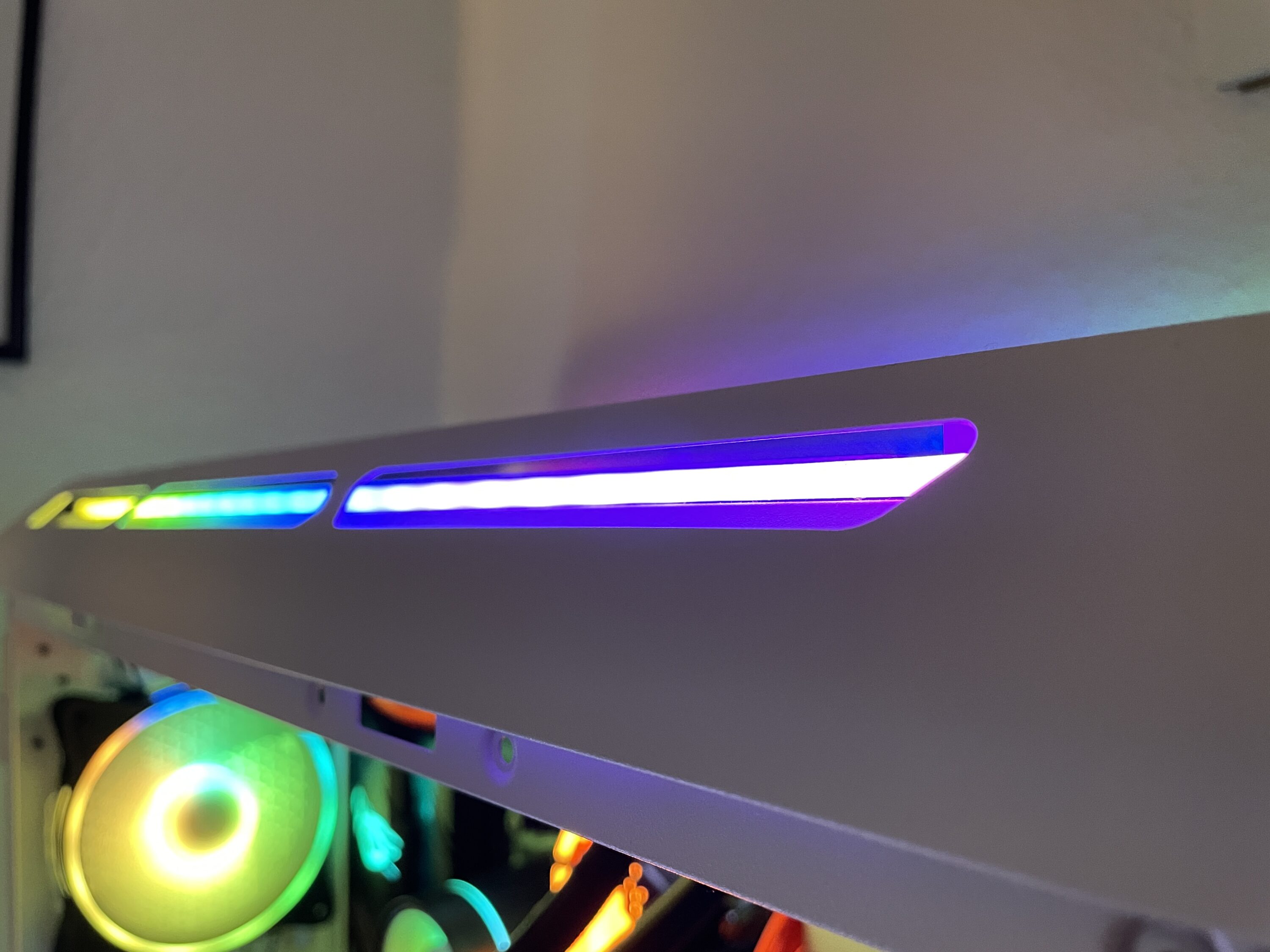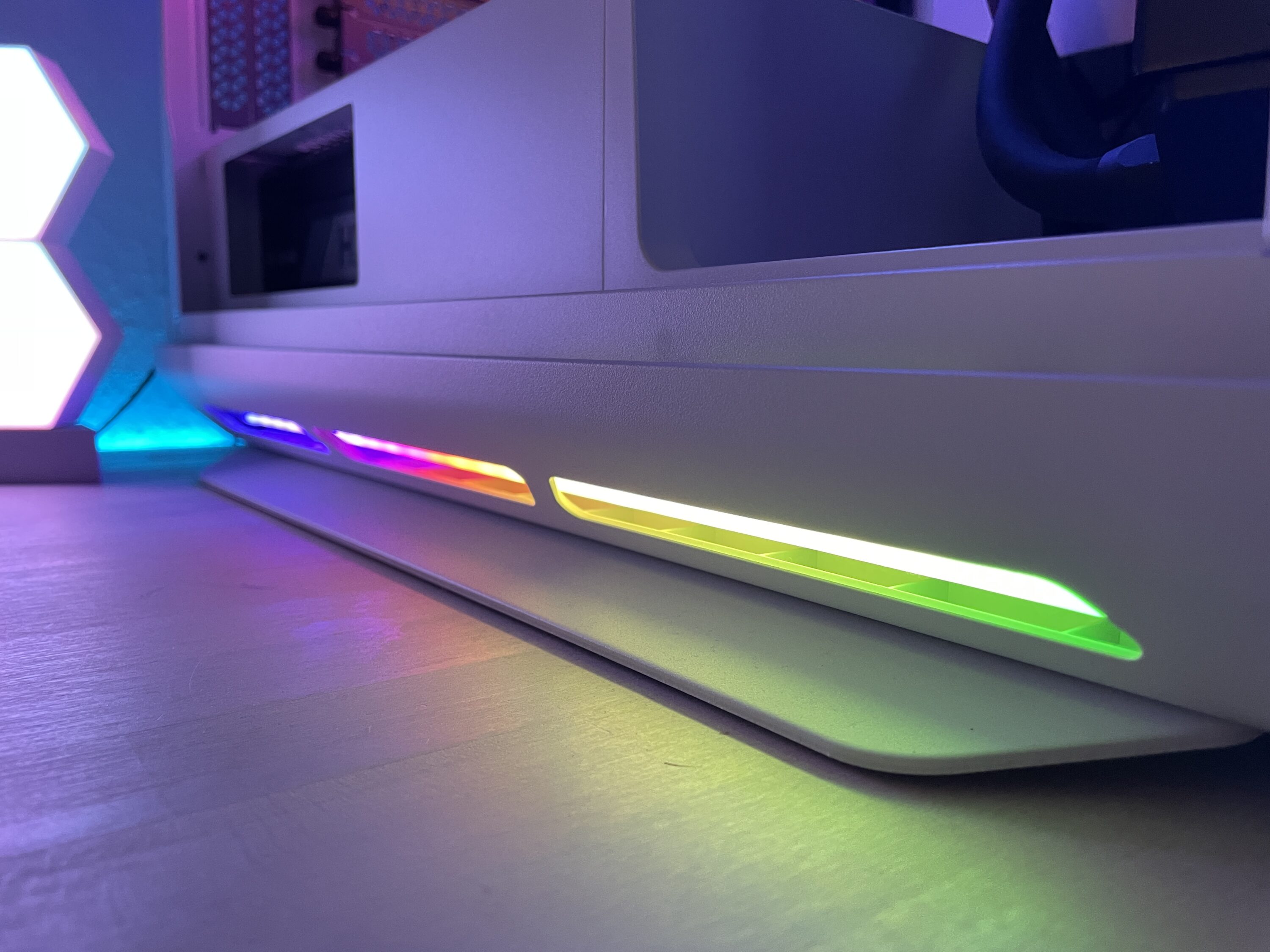 Die RGB-Stripes an den Kanten bieten einen ähnlichen Effekt. Durch die milchige Ummantelung, blendet die Beleuchtung nicht und es entsteht, gerade bei beliebten Effekten wie „Regenbogenfarben“, ein nahtloser Übergang zwischen den einzelnen LEDs. Auch die Öffnungen an den Kanten des Gehäuses, durch die die Beleuchtung durchschimmert, tragen ihren Teil zum Beleuchtungskonzept bei.