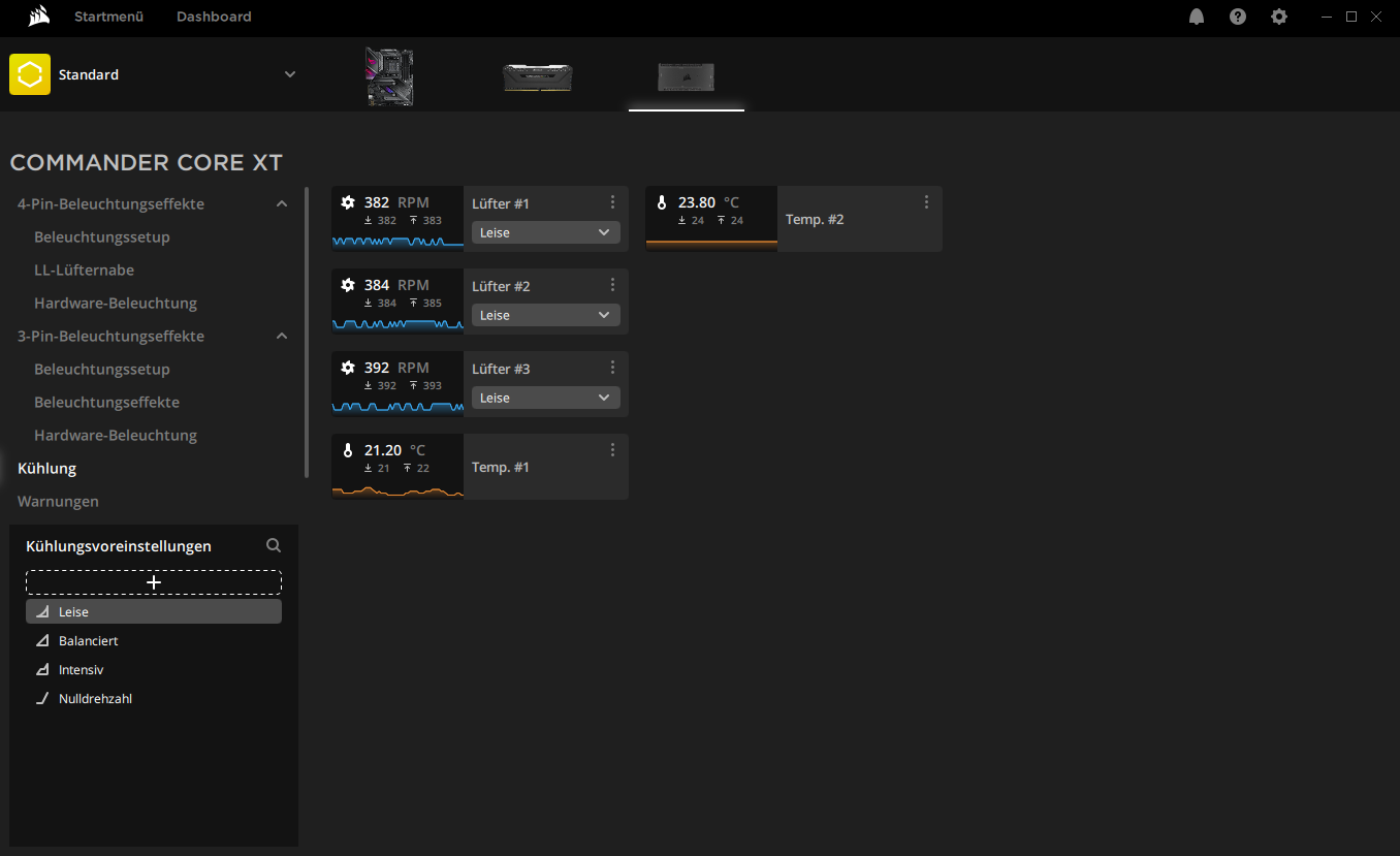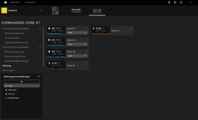 Unter dem Punkt „Kühlung“ lassen sich die Temperaturen der zwei vorinstallierten Temperaturfühler ablesen und auch die Lüftergeschwindigkeit frei anpassen.