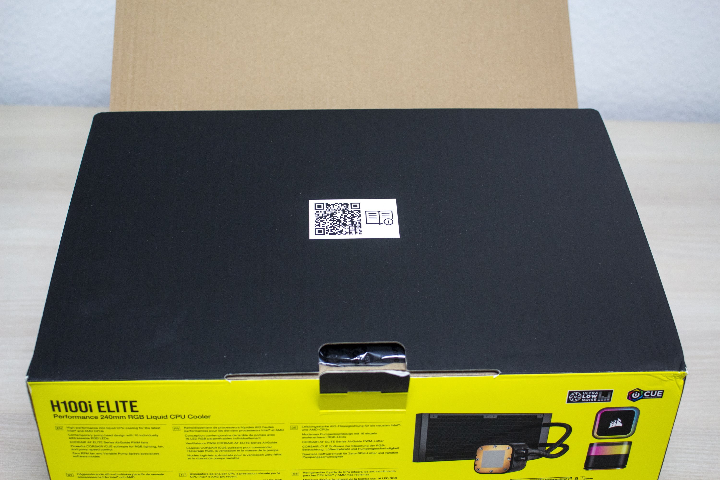 Verpackt wurde die iCUE H100i RGB ELITE durch Corsair in einem kompakten Karton, der in den typischen Farben des Herstellers gestaltet ist. So wurde der Karton oben, unten und an den Seiten schwarz sowie an Vorder- bzw. Rückseite neon-gelb bedruckt. Neben einigen Produktbildern findet man auf dem Karton auch alle relevanten technischen Informationen sowie eine Auflistung der wichtigsten Features.