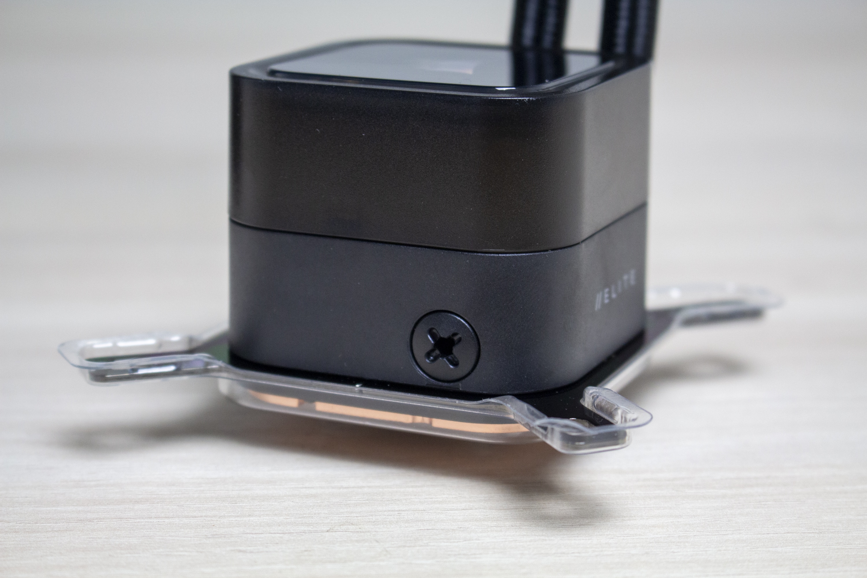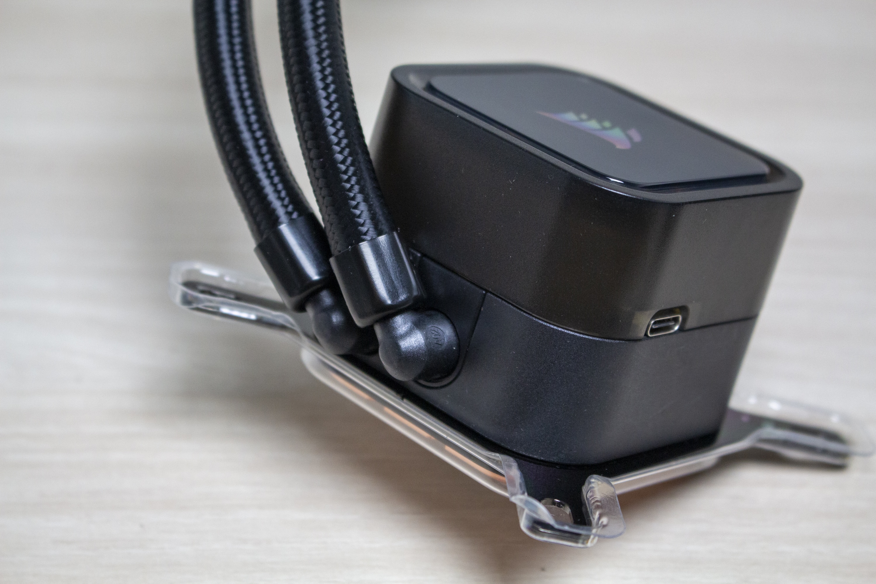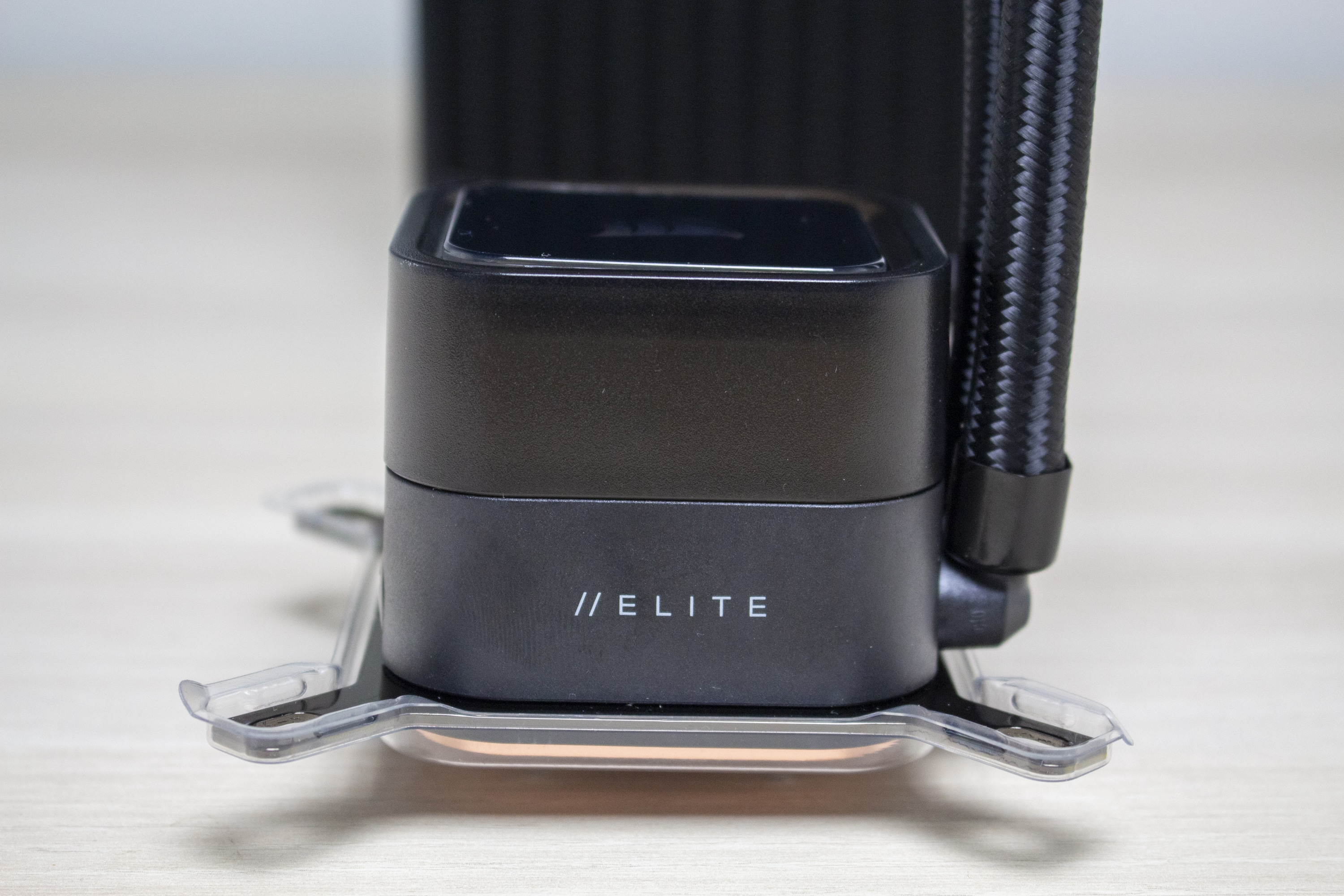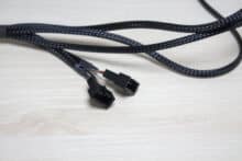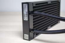 Die Wasserschläuche sind 400 Millimeter lang, von einem feinen schwarzen Sleeve umhüllt und enden am Pumpenblock in zwei beweglichen Gelenken. Diese sind sehr flexibel und ermöglichen so auch den Einbau in flachen Mini-ITX-Gehäusen. Sowohl am Pumpenblock als auch am Radiator wurden die Schläuche mit den Verbindungselementen verpresst.