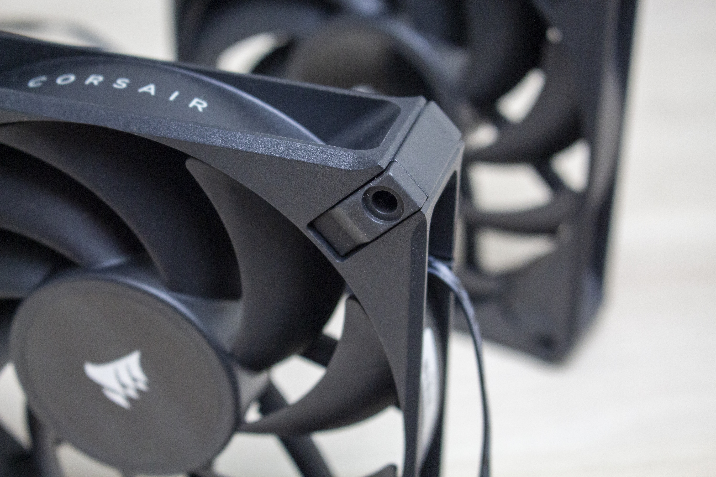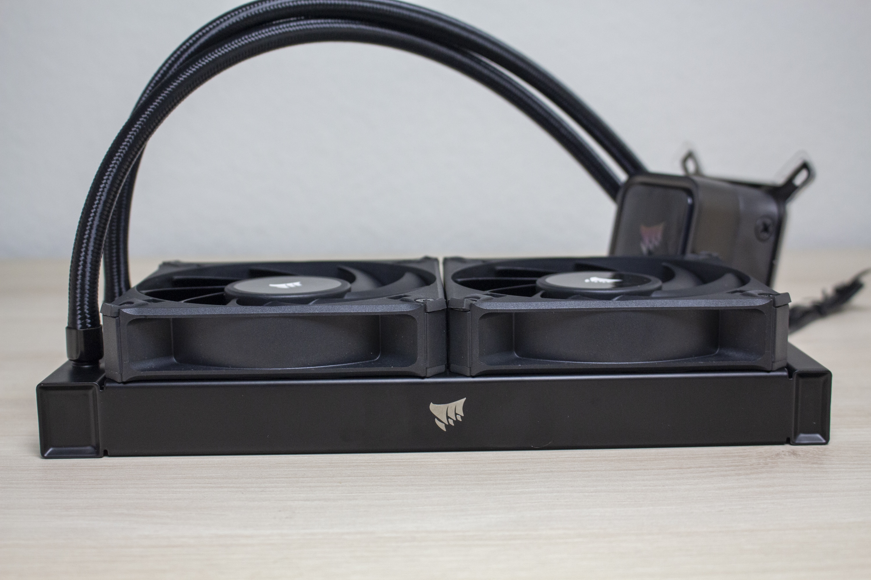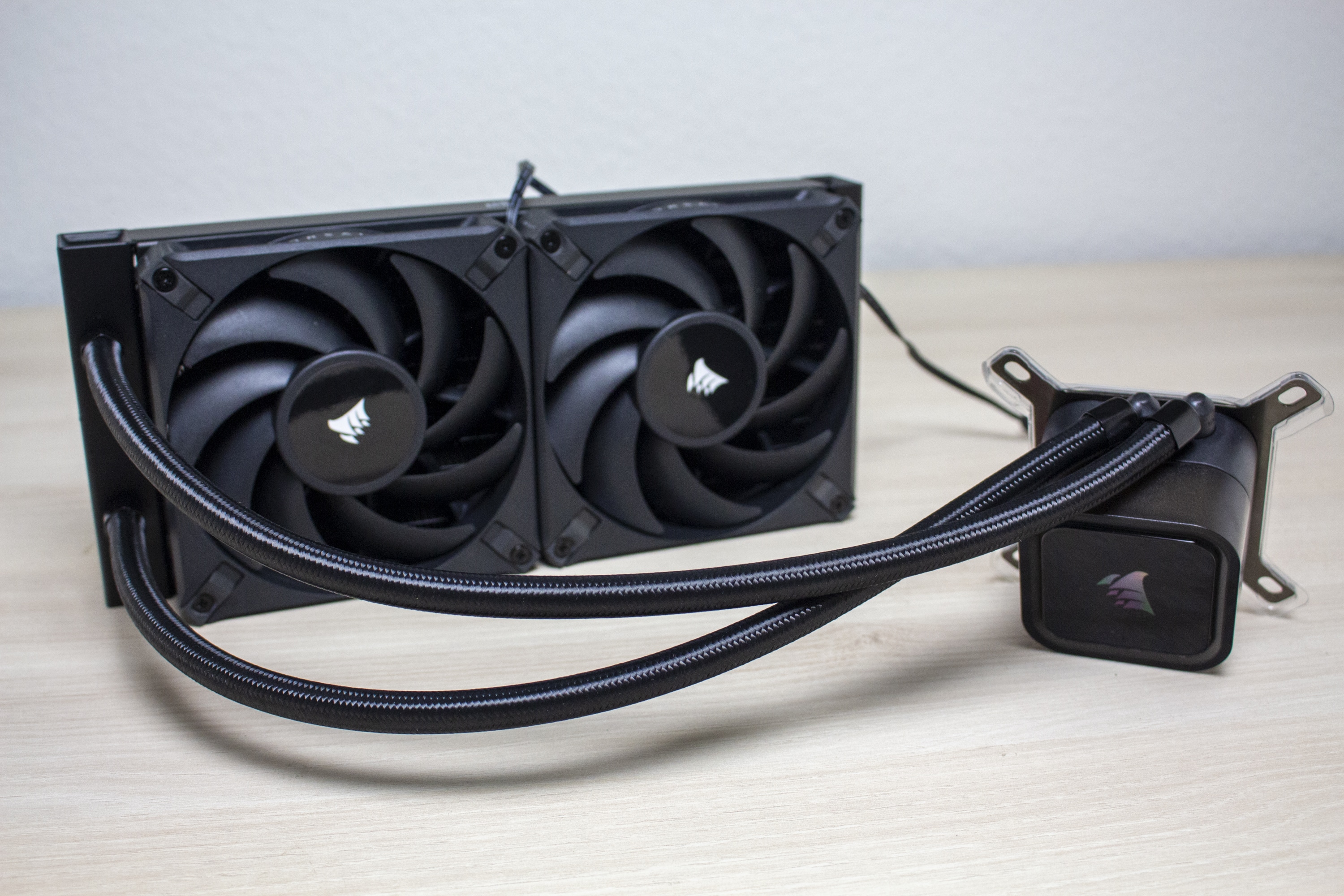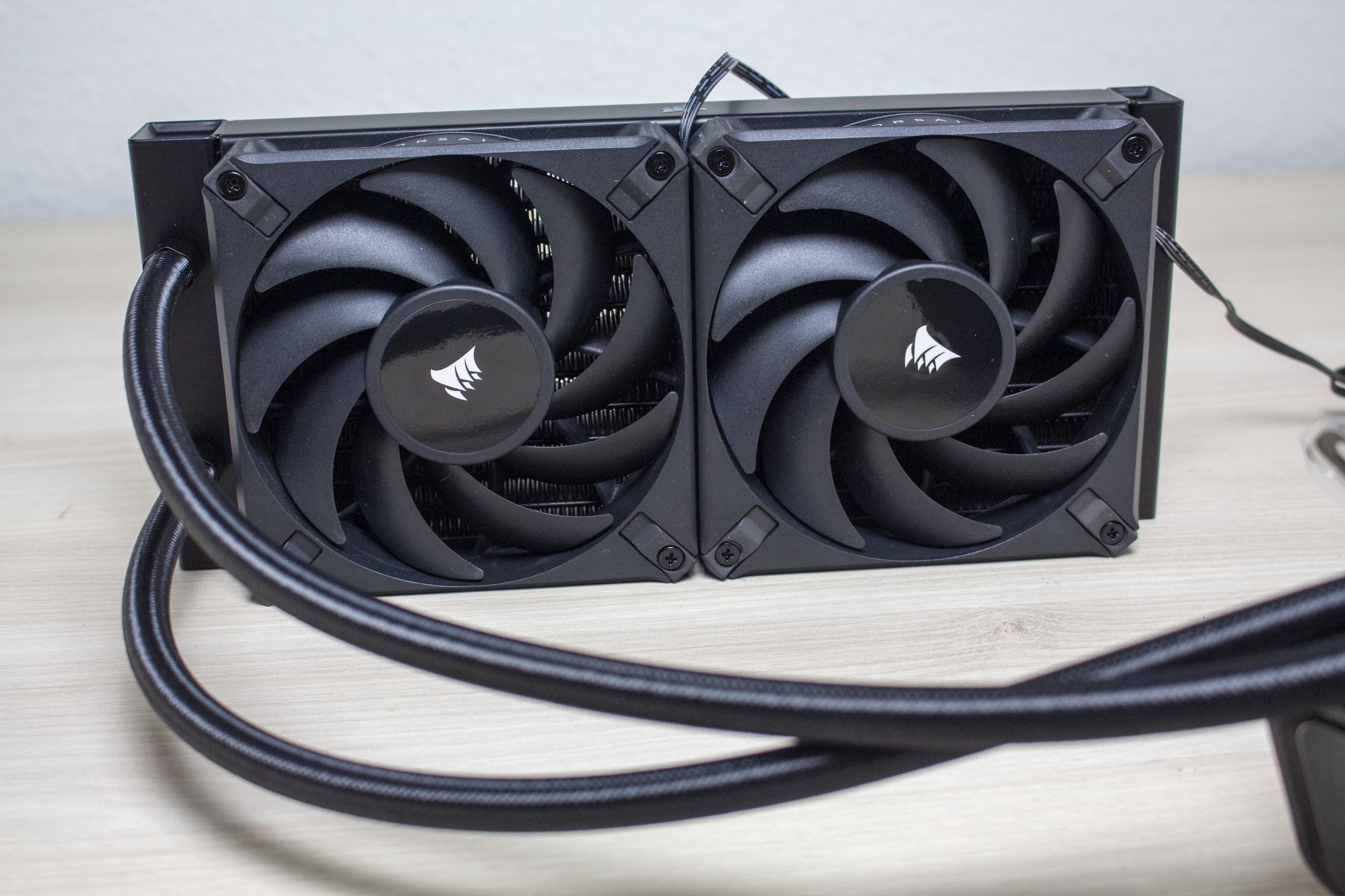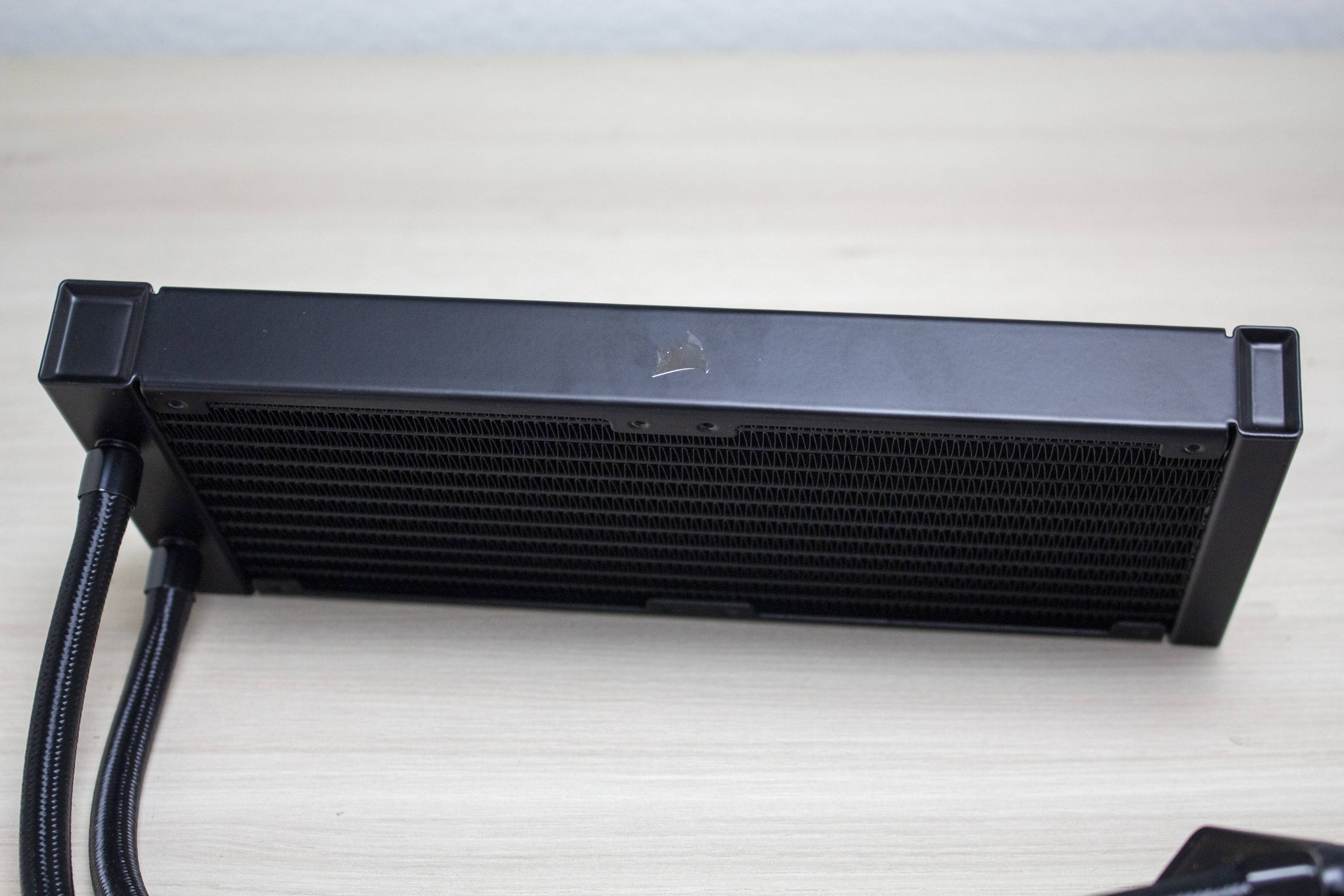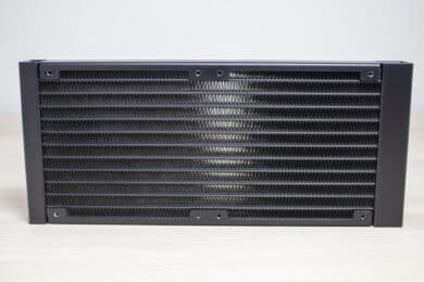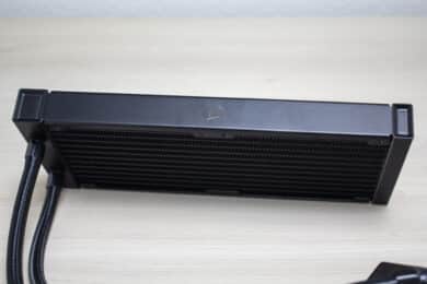 Bezogen auf Lüfter und Radiator belässt Corsair es bei einer schlichten Optik. Lediglich das glänzende Hersteller-Logo auf dem Radiator und den Lüfternaben weisen darauf hin, dass es sich um ein Produkt von Corsair handelt. So ist der aus Aluminium gefertigte Radiator komplett schwarz lackiert und 27 Millimeter dick. Dieser Wert ist üblich für aktuelle AiO-Wasserkühlungen und nichts Besonderes. Die Verarbeitung macht einen sehr guten Eindruck. Es sind keine Kratzer oder verbogenen Finnen am Radiator erkennbar.