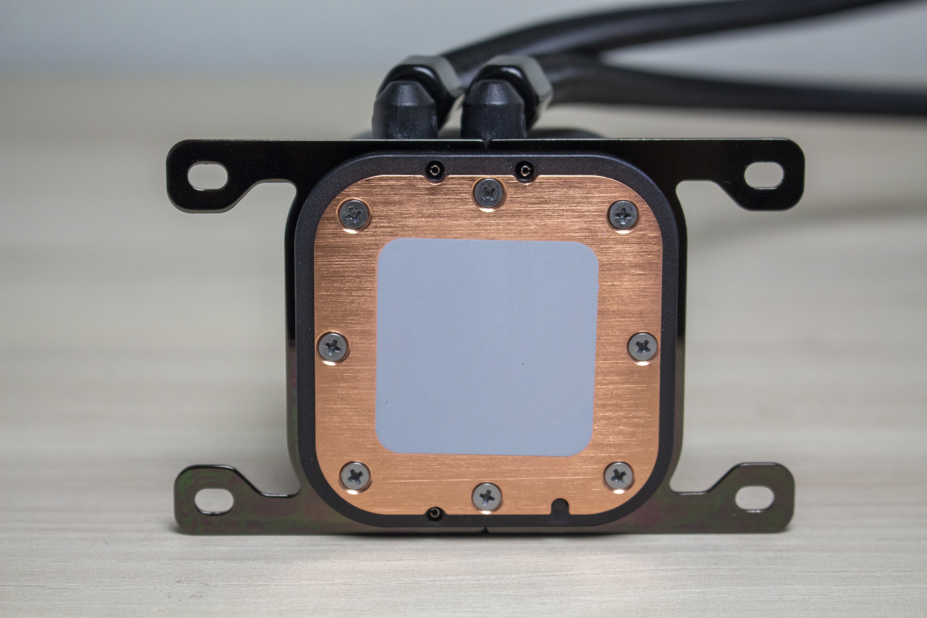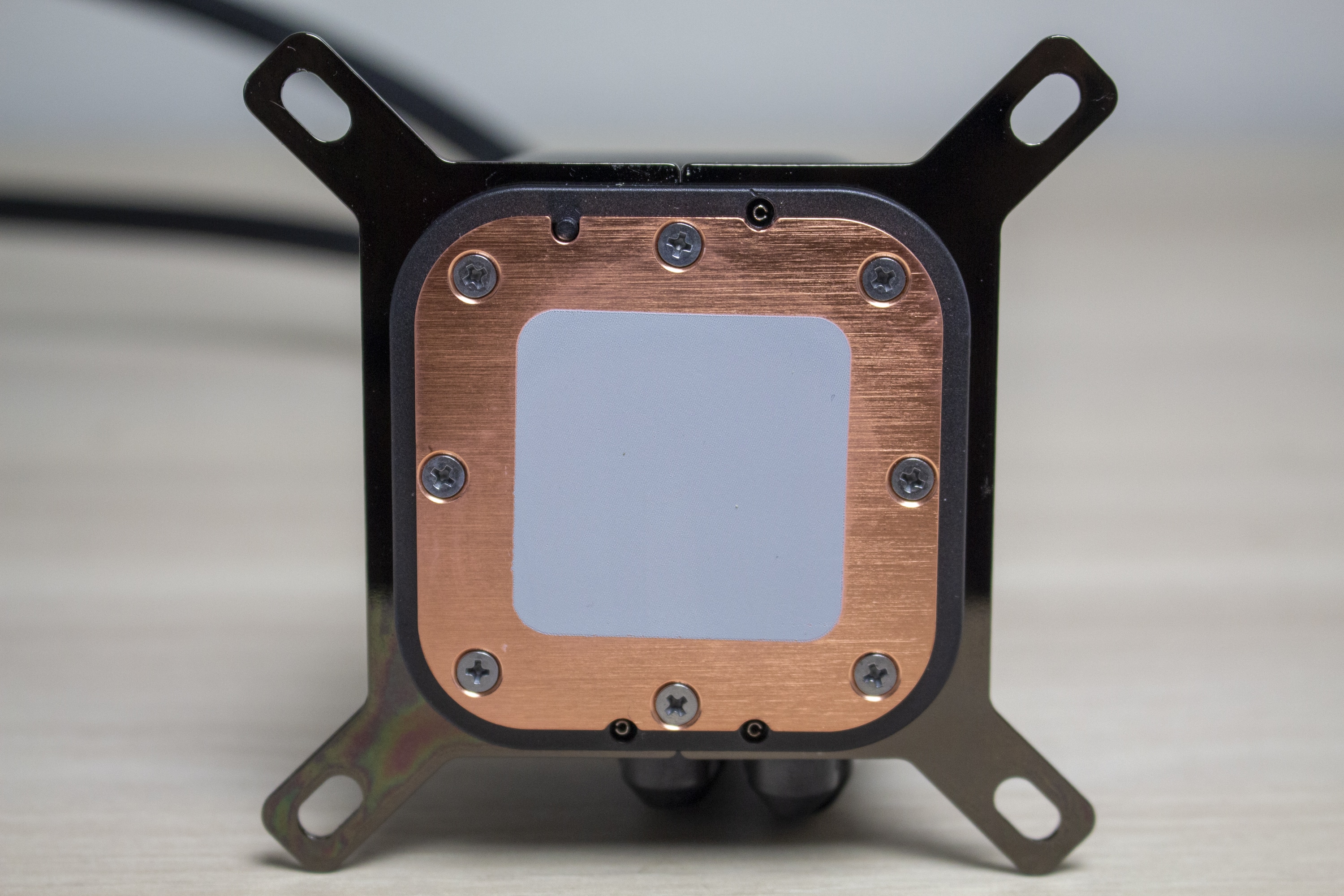 Die eigentliche Backplate verbleibt hinter dem Mainboard und wird auf der Vorderseite anschließend mit vier Abstandshaltern ausgestattet, die an beiden Enden ein Gewinde haben. Anschließend würde man in einem normalen Gehäuse den Radiator mit dem Case verbinden. Dieser Schritt entfällt bei unserem Benchtable jedoch. Nachdem dann die Schutzkappe abgenommen wurde, kann der Pumpenblock auf die Stand-Offs gesetzt werden. Die Auftragung von Wärmeleitpaste ist nicht notwendig, da Corsair ab Werk bereits eine ausreichende Menge aufgetragen hat. Im letzten Schritt wird die Pumpe über vier Rändelschrauben mit den Abstandshaltern verschraubt.