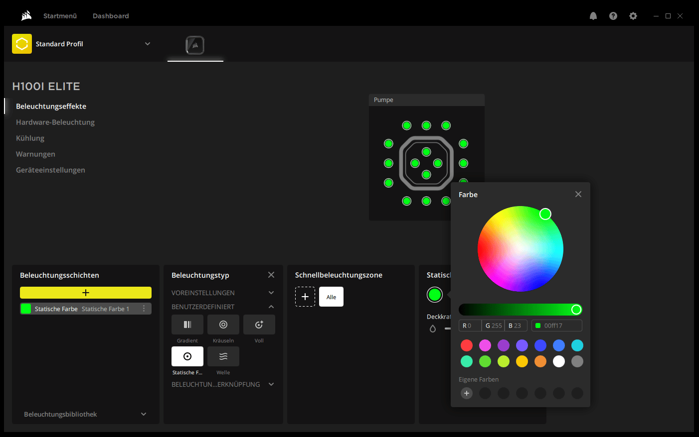Die iCUE Software bietet grundsätzlich sehr viele Möglichkeiten zur optischen Personalisierung der Software und aller Corsair-Produkte aus der iCUE-Reihe. So gibt es zahlreiche vorgefertigte Designvorlagen und Beleuchtungs-Modi, die über verschieden Profile aktiviert bzw. umgeschaltet werden können. Theoretisch ist es auch möglich jede LED im Pumpenblock mit einer anderen Farbe anzusteuern. Optisch ist die beleuchtete Pumpe ein echter Hingucker.