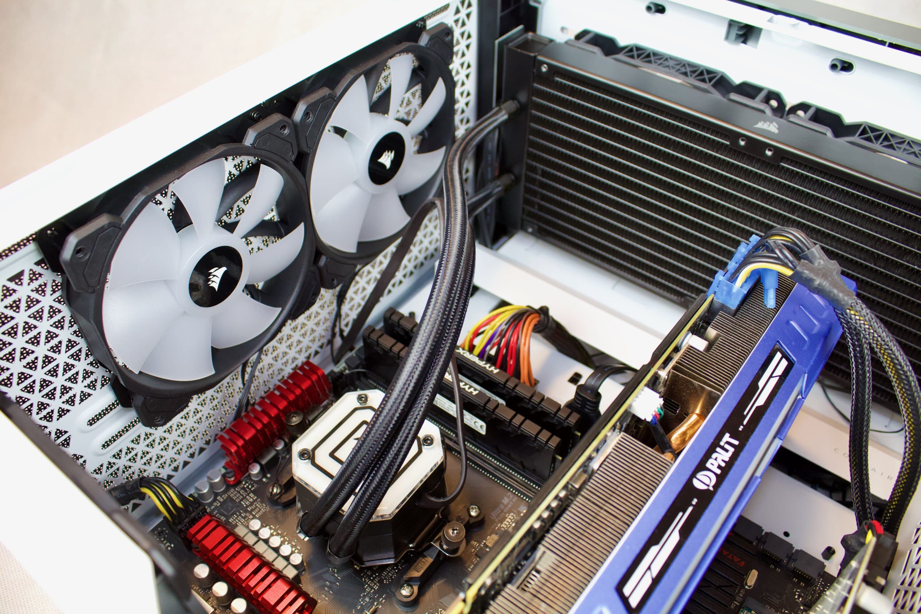 In unserem Fall wurde der Radiator an der Front montiert, mit den Lüftern dazwischen. Die mitgelieferten RGB-Lüfter sind problemlos am Radiator zu befestigen. Es ist sinnvoll bereits vor der Montage des Radiators im Gehäuse das grobe Kabelmanagement der Lüfter vorzunehmen. Platz findet der Radiator problemlos in der Front eines Corsair iCUE 4000X RGB (hier geht es zu unserem Test). Aufgrund des weißen Gehäuses wurde der alternative weiße CPU-Kühler-Deckel installiert.