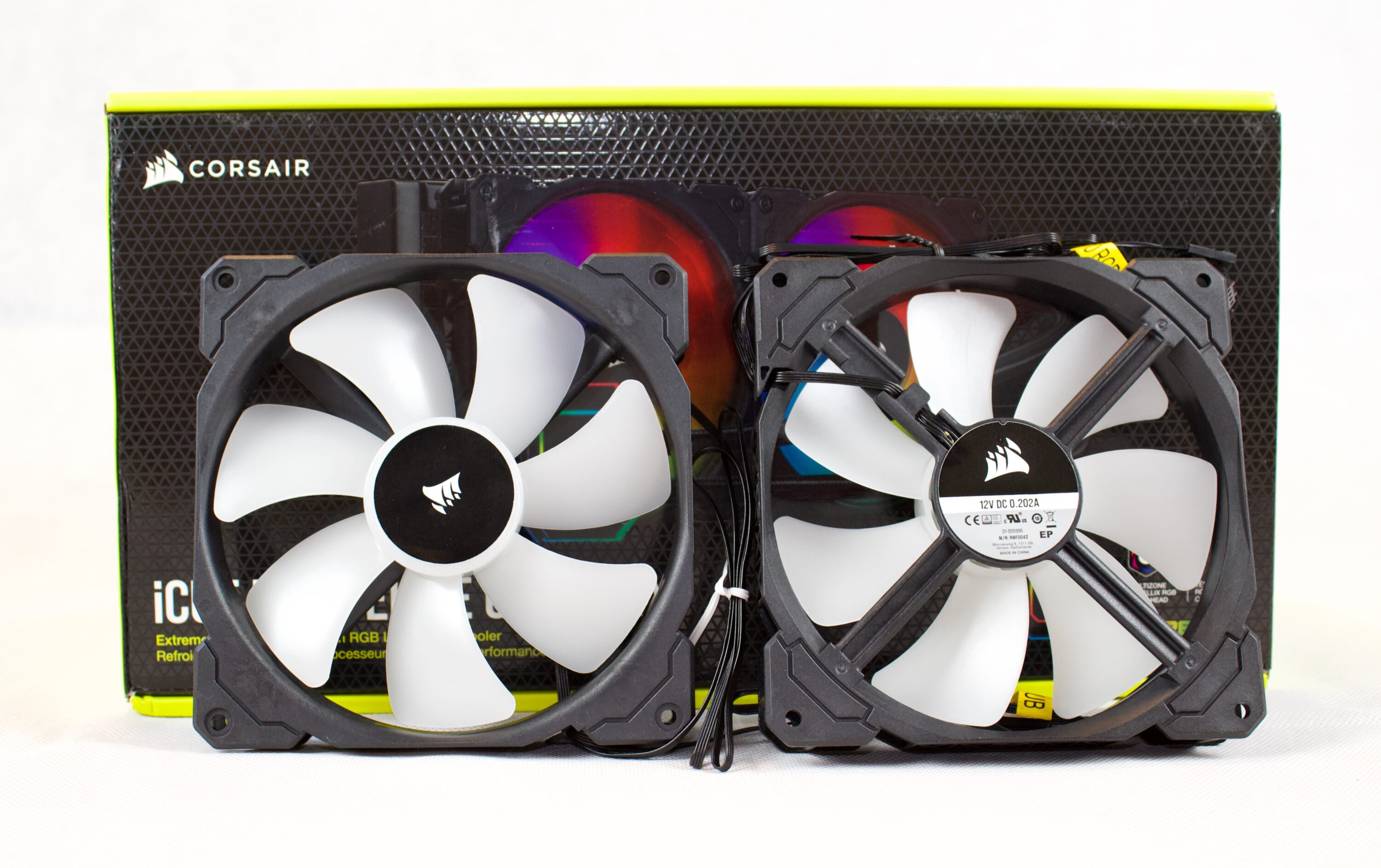Die zwei im Lieferumfang enthaltenen RGB-Lüfter (CORSAIR ML140 RGB-PWM-Lüfter) besitzen einen schwarz Rahmen mit weißen Lüfterblättern. Angeschlossen werden die Lüfter über je einen 4-Pin-PWM-Anschluss. Zudem besitzen sie 4-Pin-RGB-Anschlüsse. Eine Gummierung am Rahmen besitzen die Lüfter nicht.