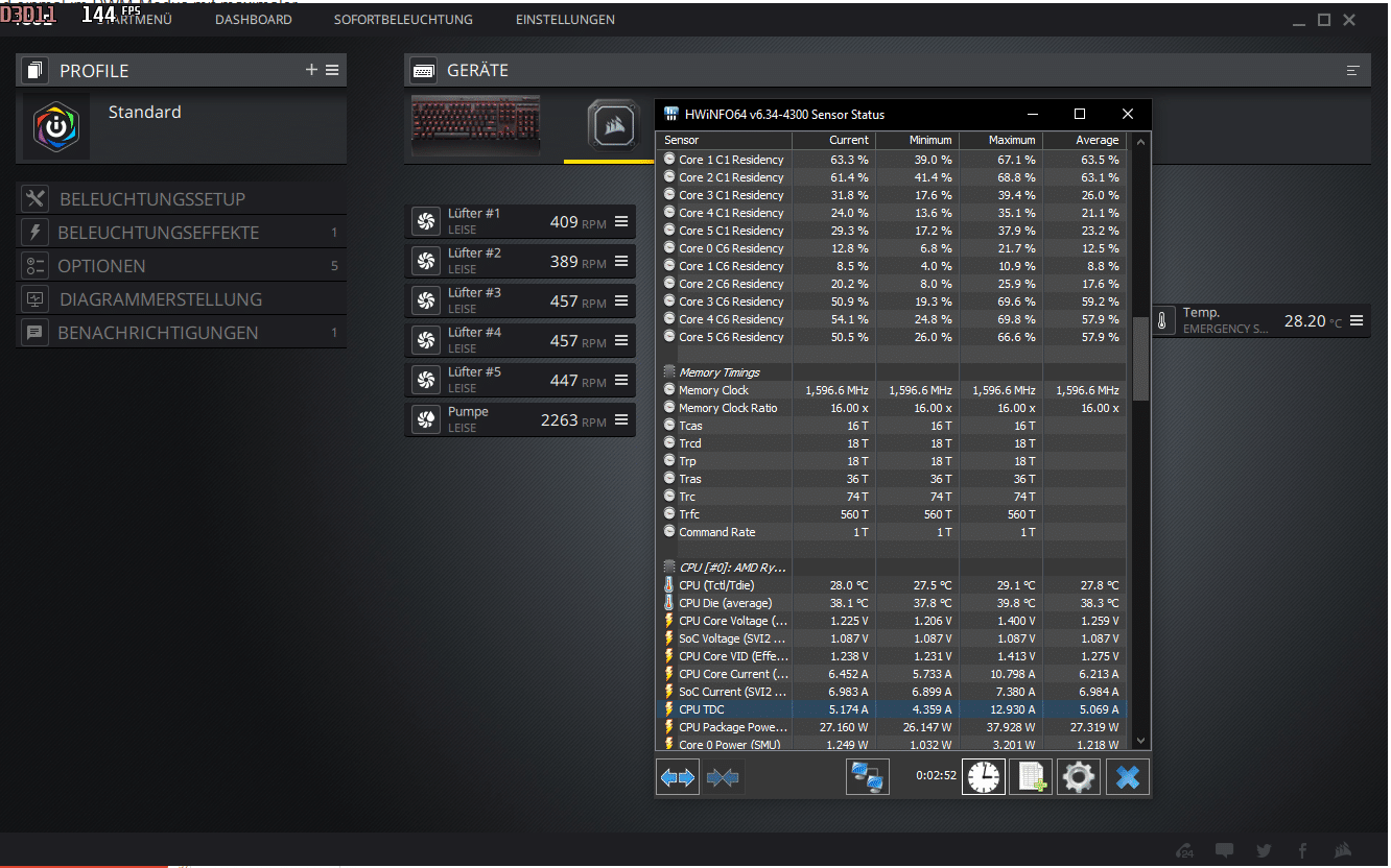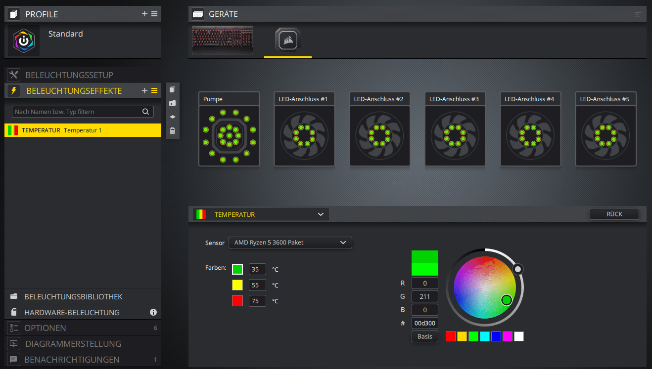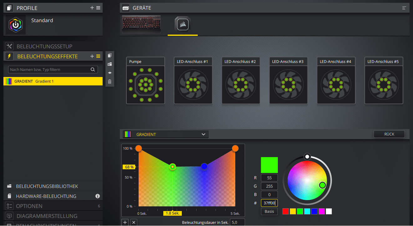 In der Software selbst sind einem kaum Grenzen gesetzt. Zwischen verschiedenen fertigen Profilen können weitere Personalisierungen vorgenommen werden. Es können sowohl die RGBs auf dem CPU-Kühler und Lüfter der AiO gesteuert werden, als auch auch alle weiteren zur iCUE-Software kompatiblen Geräte.