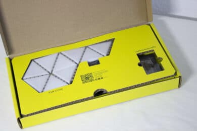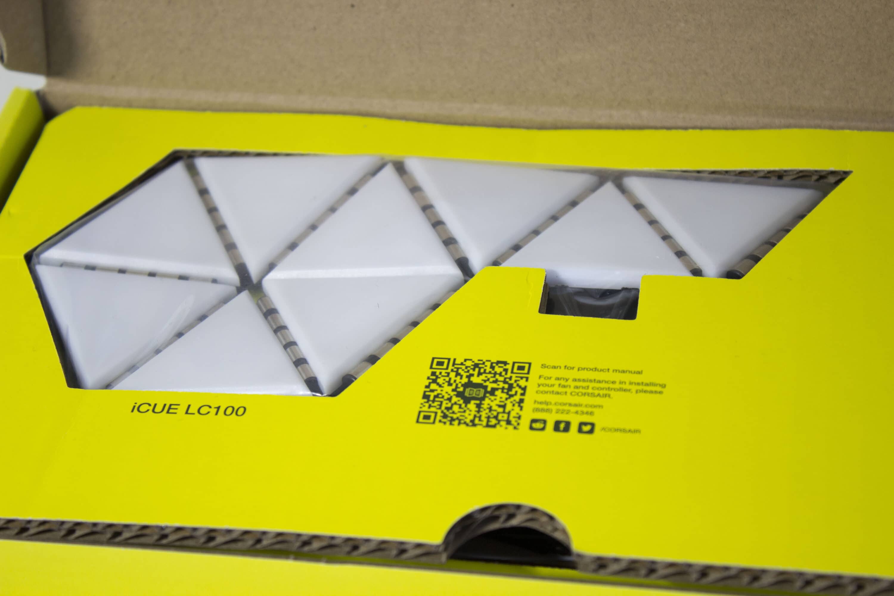 Corsair bietet vom LC100 zwei verschiedene Sets an. Im „Tile Starter Kit“ befinden sich neun RGB-Dreiecke, entsprechende Verbinder und das Lighting Node Pro, die Steuereinheit. Das „Tile Expansion Set“ ist im Grunde das selbe, nur ohne das Lighting Node Pro. Angeschlossen wird das Master-Tile per 3-Pin-Anschluss, solltet ihr also ein Commander Core XT/Pro oder Lighting Node Pro mit freiem Anschluss verbaut haben, könnt ihr etwas Geld sparen, auch wenn das nur 25 Euro sind. Denn das LC100 Startet Kit hat mit 120 Euro seinen Preis.