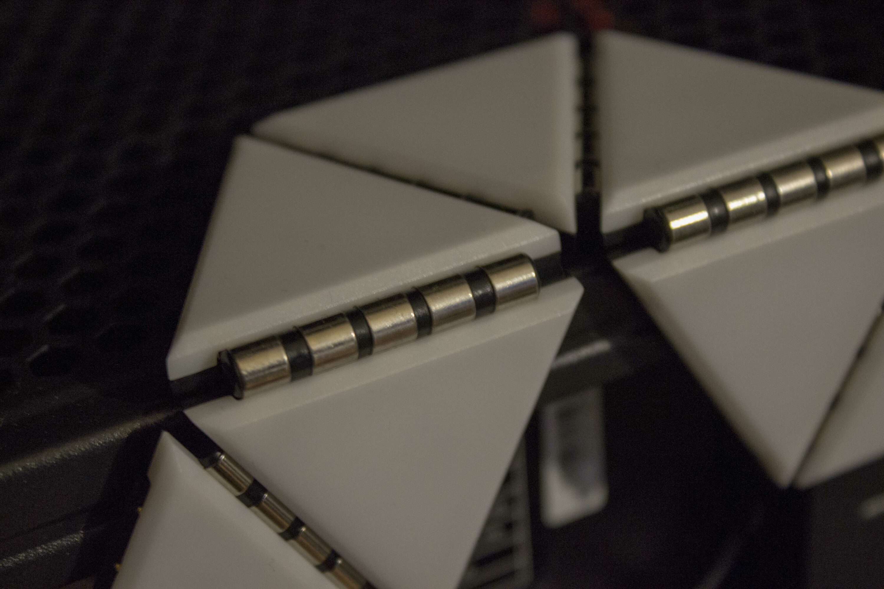 An zwei Seiten der Dreiecke befinden sich Kontakte, um diese per Magnet zu verbinden. Als Verbinder agieren in diesem Fall kleine Metallstangen mit unterschiedlichem Durchmesser. Acht Verbinder haben vier Millimeter, zwei dickere mit 5,5 Millimetern sind auch dabei. Diese werden benötigt, um die Dreiecke auch um Ecken zu legen.