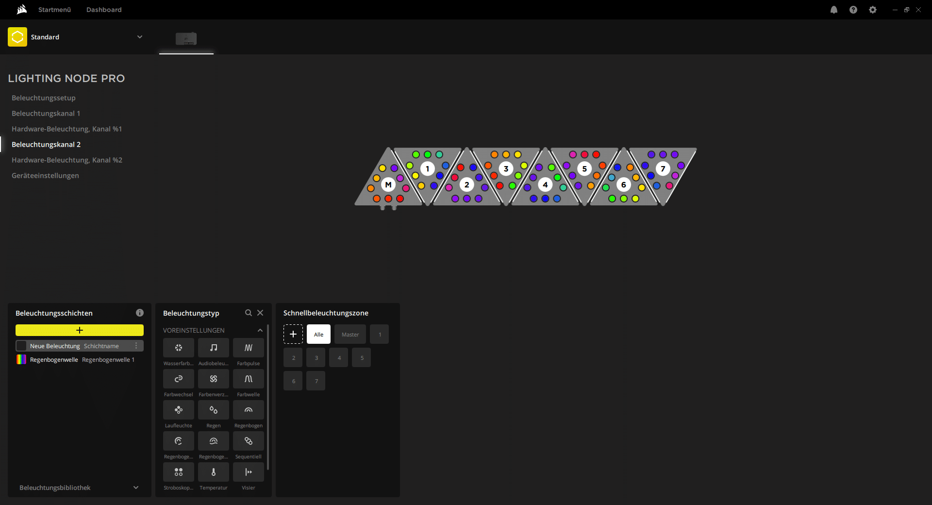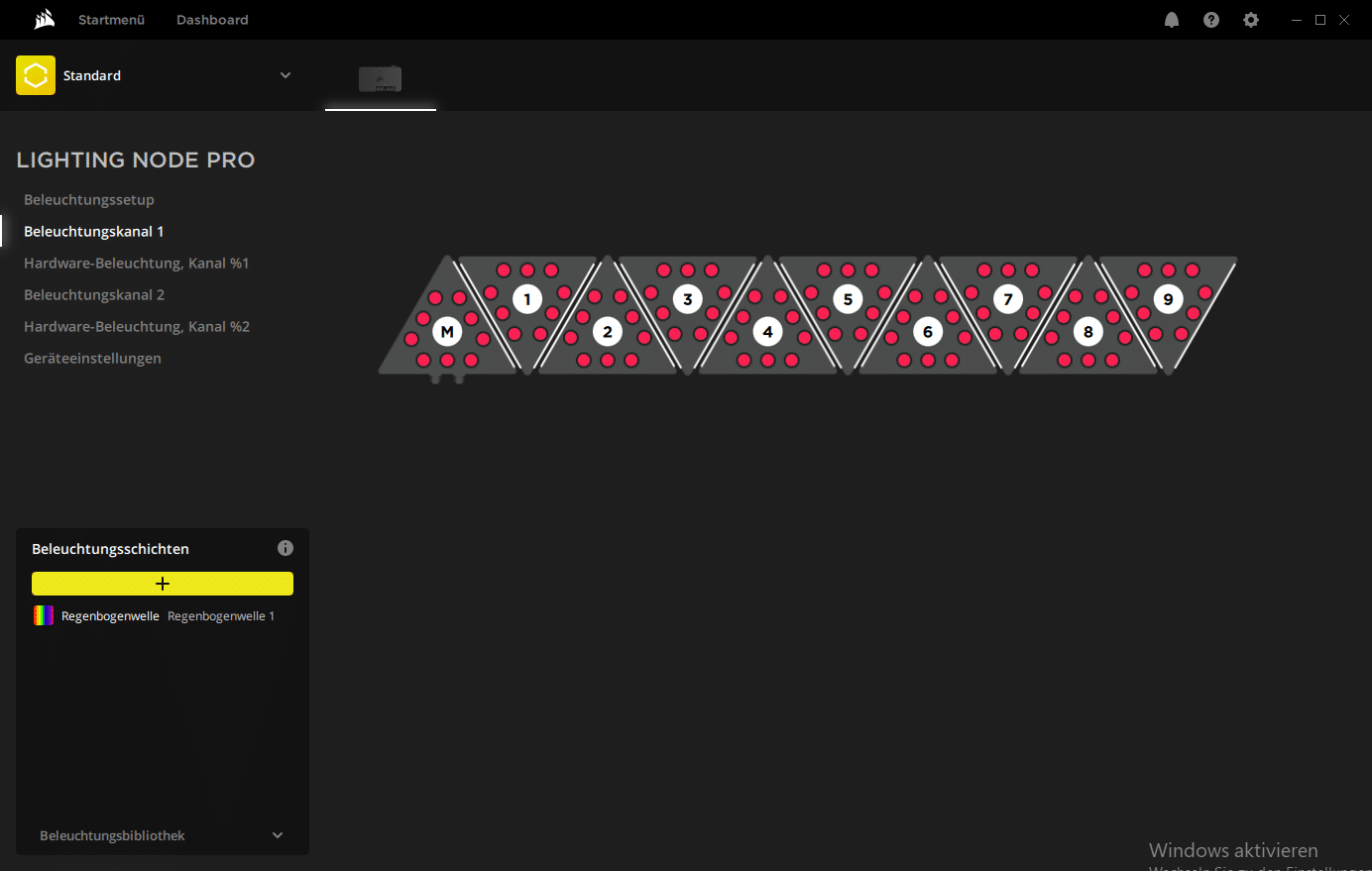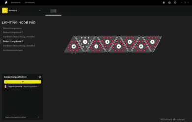 Nach der Installation ist die Einrichtung von iCUE kinderleicht. Ein kleines Tutorial mit Popups leitet euch durch diese sogar teilweise hindurch oder gibt nützliche Tipps. Zuerst wählen wir das Lighting Node Pro aus und wählen für die LC100-Dreiecke aus. Anschließend fügen wir die Anzahl an RBG-Dreiecken in der Software hinzu. Ab dem zehnten informiert euch die Software, dass ein neues Master-Modul vonnöten ist.