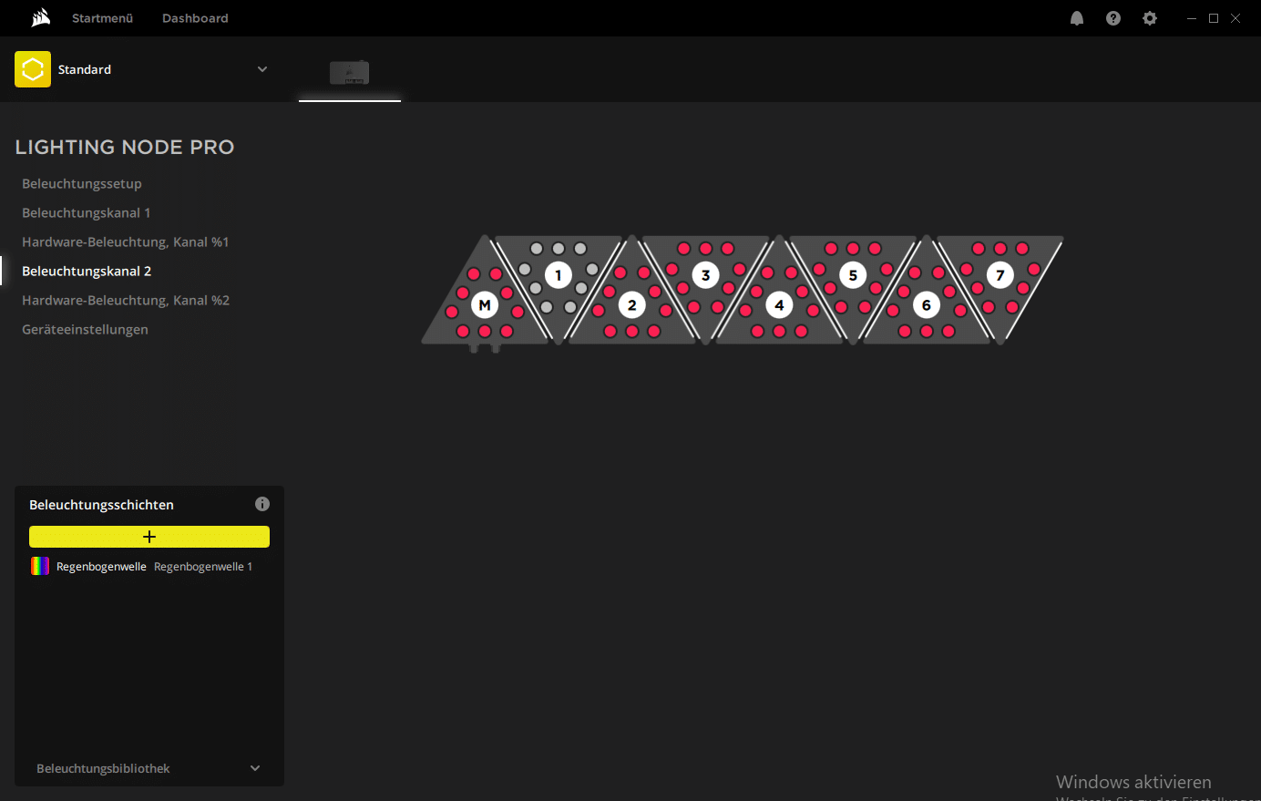 Solltet ihr beide Kits verbauen und diese nicht in Reihe hängen, müsst ihr Beleuchtungskanal 1 und 2 konfigurieren. Falls ihr iCUE nicht konstant anhaben möchtet, könnt ihr die Hardware-Beleuchtung verwenden. Der dort eingestellte Effekt wird immer verwendet, wenn ihr die Software von Corsair nicht an habt.