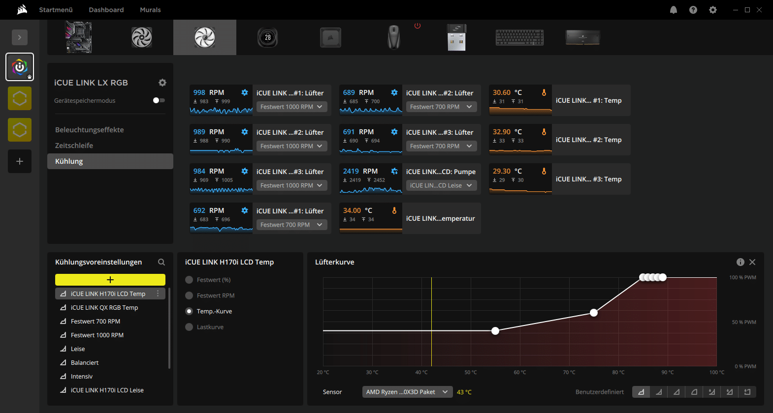 Über den Unterpunkt Kühlung kann die Drehzahl der iCUE LINK -LX140 RGB angepasst werden. Es stehen Festwerte aber auch eine Temperatur- oder Lastkurve zur Auswahl.