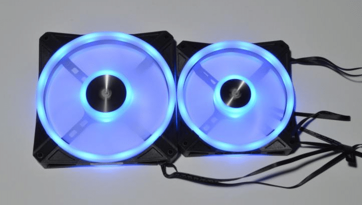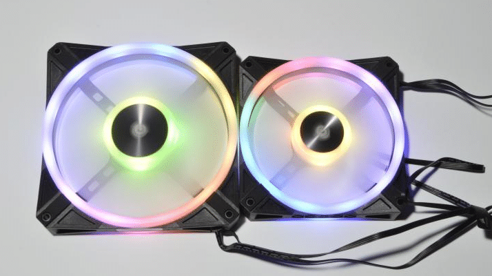 Die Lüfterform gibt sofort zu erkennen was Vorder- und Rückseite sind. Die Rückseite kennzeichnet sich durch die enthaltenen Querstreben im Lüfterraum. Auf beiden Seiten befinden sich Gummipuffer in den Ecken der Lüfter-Rahmen. Vibrationen werden entkoppelt und nicht auf das Gehäuse übertragen. An jedem Lüfter sitzt sowohl ein 4-Pin-PWM- als auch ein RGB-Kabel und kann nicht mit der Mainboard-Steuerung oder der RGB-Steuerung anderer Hersteller verwendet werden. Es funktioniert nur die Hauseigene iCUE-Software in Kombination mit der Lighting Node Core – Nabe.