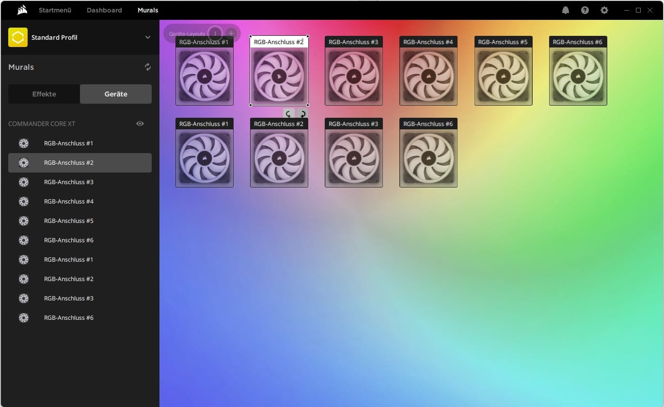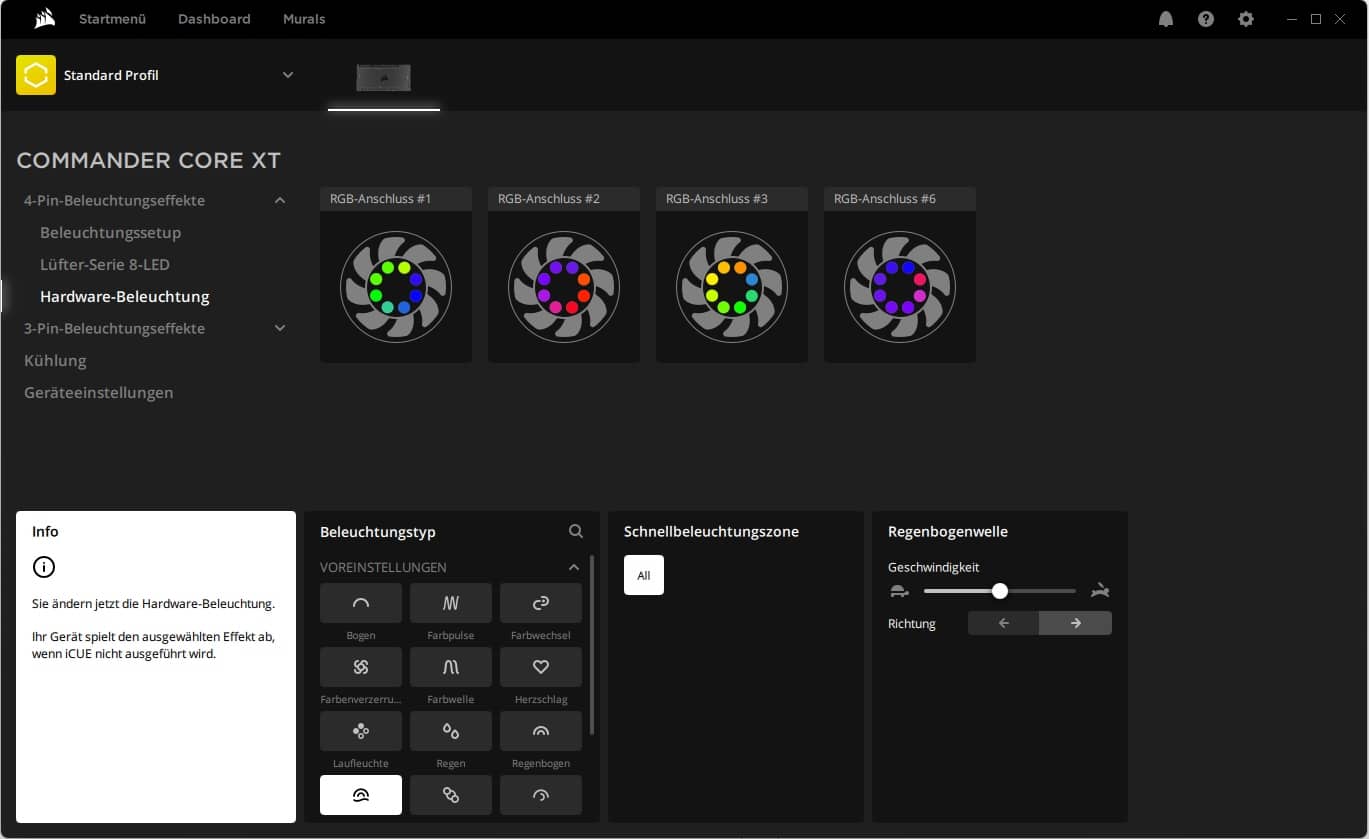 In Corsair iCue kann man die komplette Steuerung der Lüfter übernehmen. Je nach Controller und dessen Möglichkeiten. Im Test kam der Commander Core XT (€ 63,37 *) zum Einsatz. Hier lassen sich beispielsweise die RGB-Funktionen steuern, aber auch die Lüftergeschwindigkeit und die Orientierung der Lüfter.
