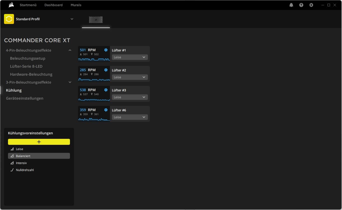 Dementsprechend wird auch die passende Software „Corsair iCue“ benötigt. Diese findet man in der aktuellen Version bei den Downloads auf der offiziellen Webseite von Corsair. Dieses proprietäre System hat den Nachteil, dass man die Corsair-Lüfter nicht mit denen anderer Marken mischen kann. Allerdings kann man natürlich unterschiedliche Corsair-Lüfter kombinieren. Ansonsten gibt es auch den Vorteil, dass Corsair iCue relativ zuverlässig läuft und es keine Probleme mit unbekannter Hardware gibt.