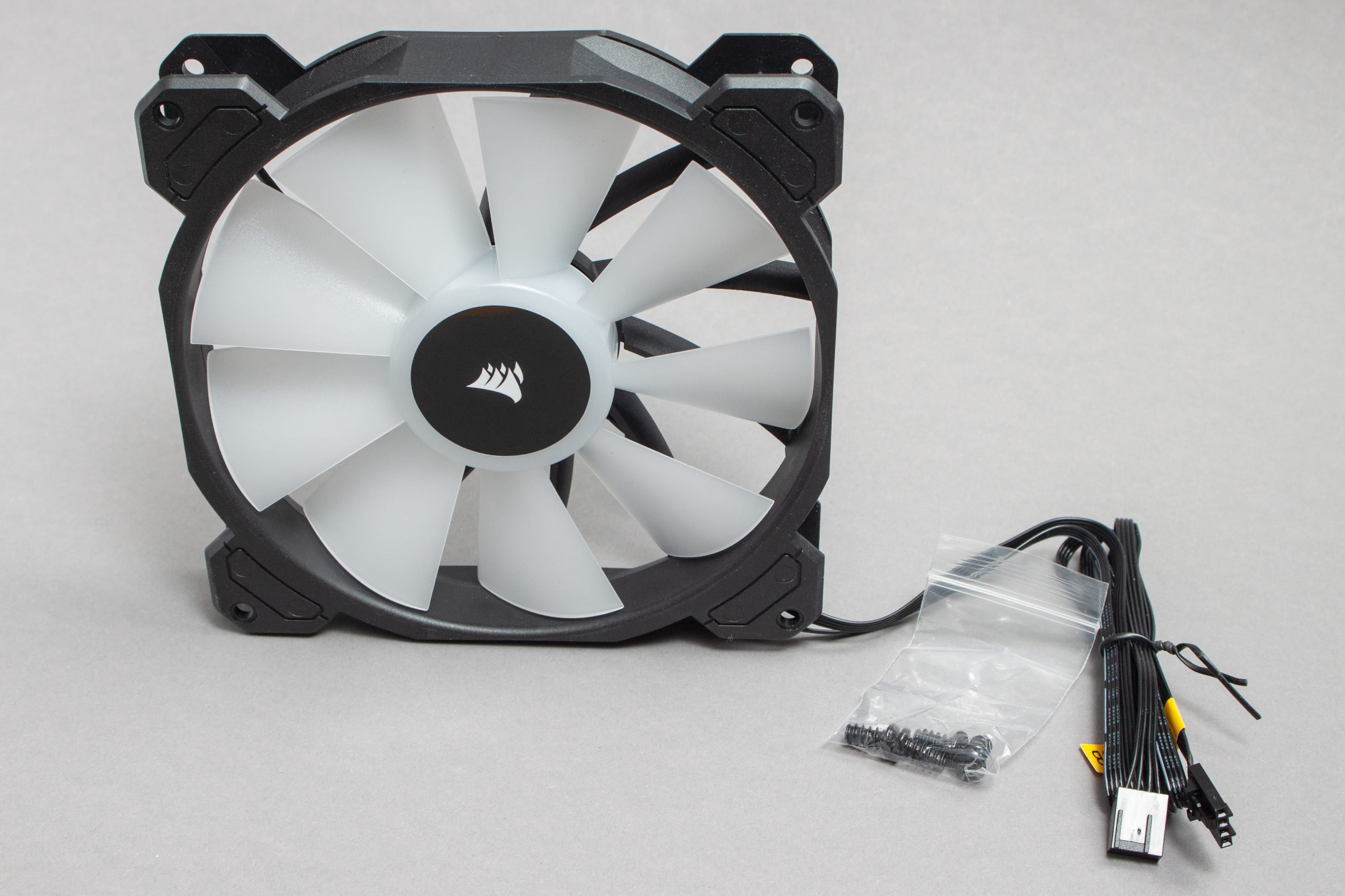 Abgesehen von den Lüfterschrauben und der Anleitung findet sich jedoch kein Zubehör im Lieferumfang der Corsair iCue SP RGB Elite Lüfter.