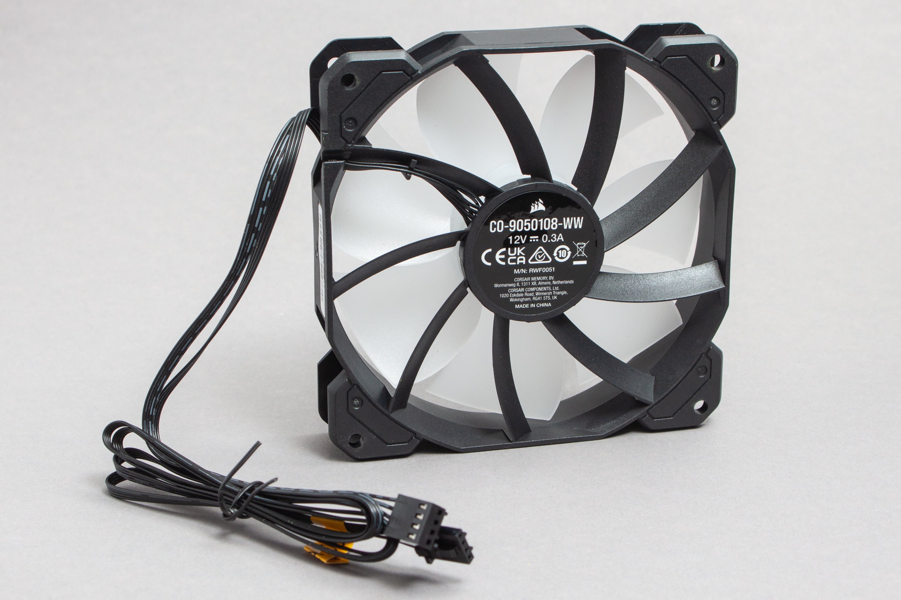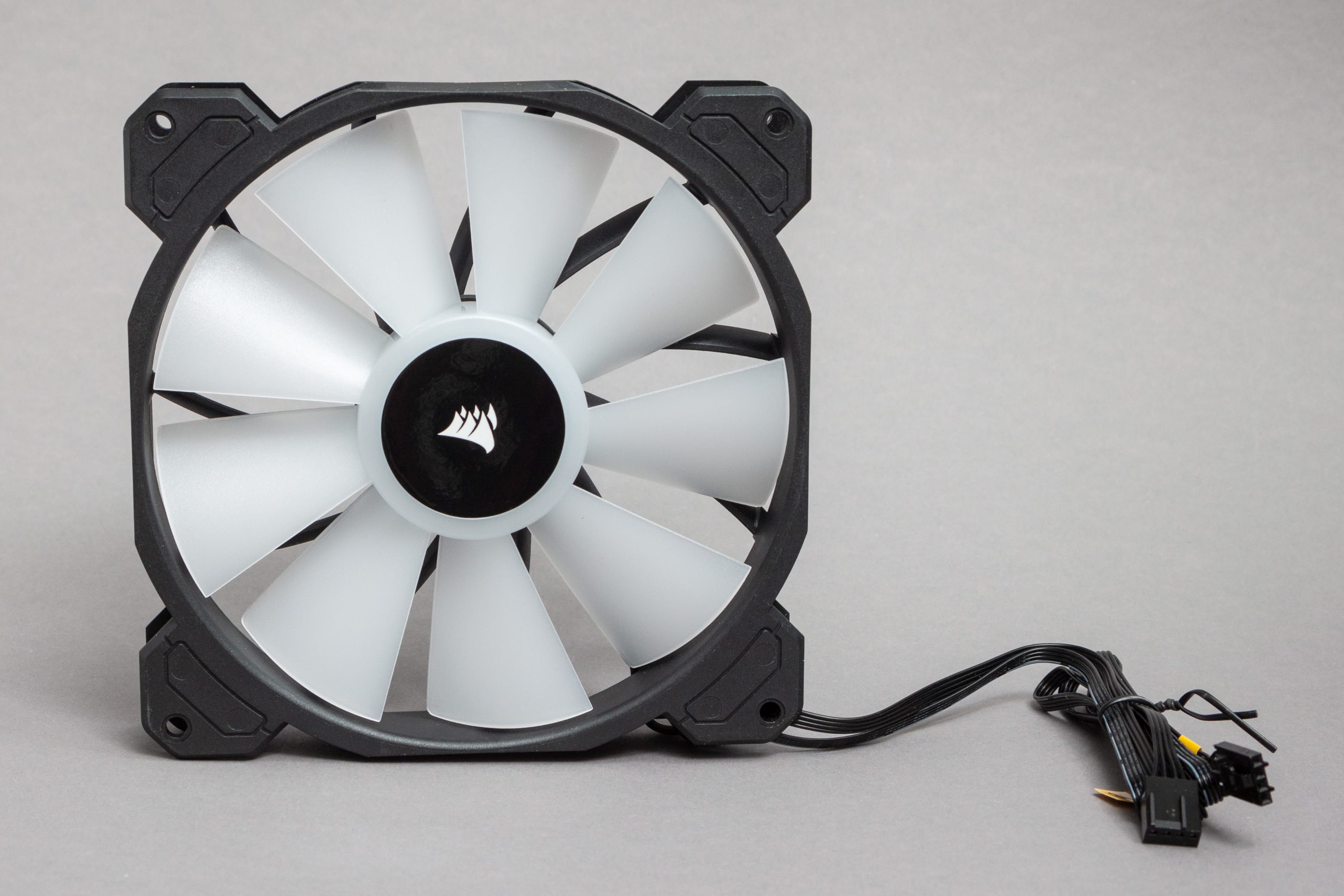 Jeder der Lüfter besitzt zwei Kabel – ein reguläres Lüfterkabel mit PWM-Anschluss und ein RGB-Kabel mit einem proprietären iCue-Stecker von Corsair. Die Kabel sind dünn und nicht ummantelt. Hierdurch sind sie einfach zu verlegen und unauffällig. Allerdings sind sie hierdurch möglicherweise etwas empfindlicher, wenn es um scharfe Kanten geht. Die Kabel sind auch recht lang, rund einen halben Meter. Einerseits reicht das auch für ein Verlegen in großen Gehäusen, aber andererseits muss man Überlängen irgendwie unter Kontrolle halten und irgendwo verstauen, was das Kabelmanagement erschwert. Ich muss zugeben, dass ich hier Konzepte bevorzuge, bei denen kürzere Kabel und mitgelieferte Verlängerungskabel zum Einsatz kommen.