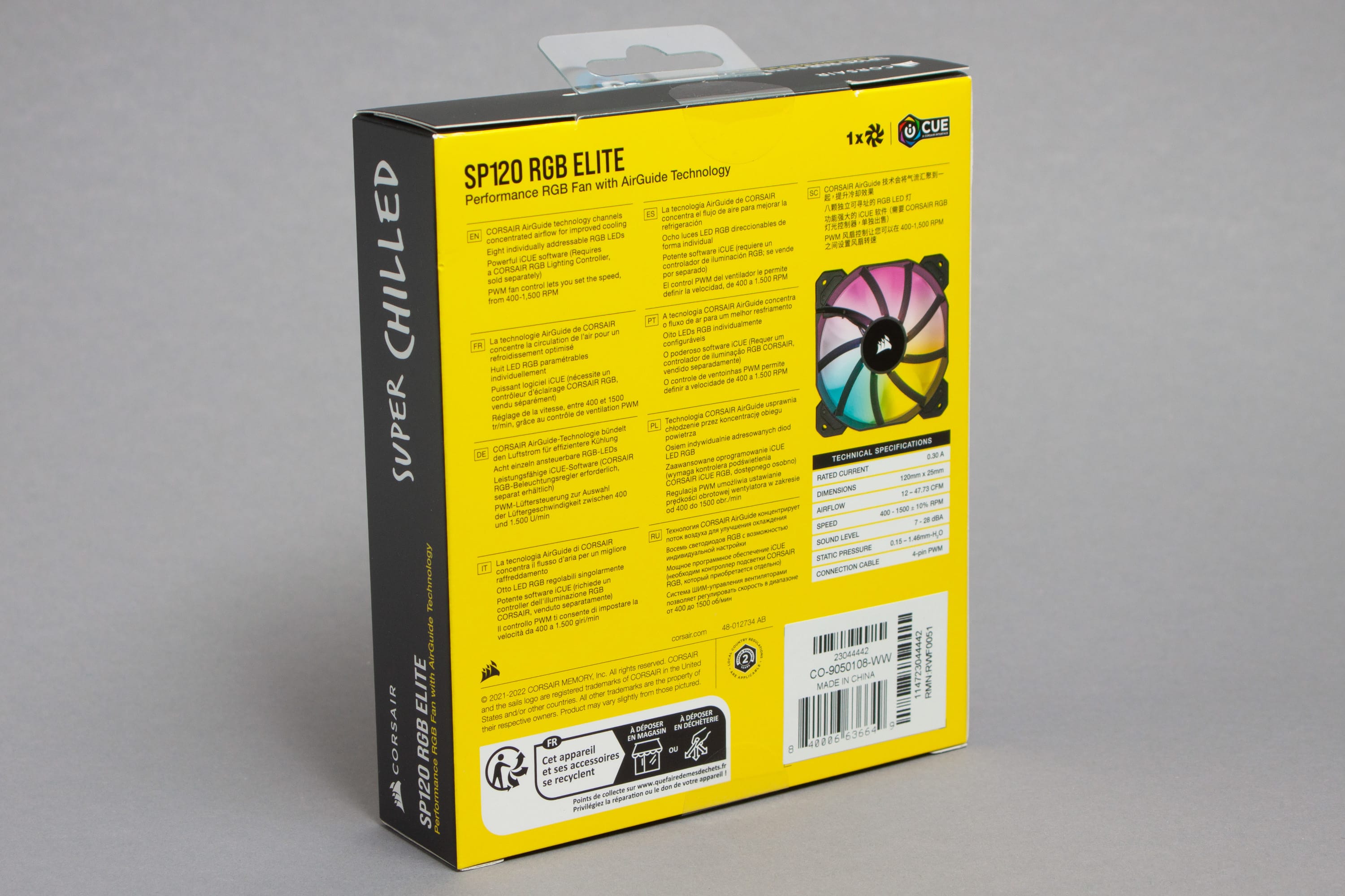 Das Verpackungsdesign von Corsair ist fast immer charakteristisch auffällig. Im kontrastreichen Design mit der schwarzen Seite und der ansonsten signalgelben Verpackung sticht diese schnell ins Auge. Die Vorderseite ist hierbei recht sauber gehalten mit einem Produktaufdruck und der Artikelbezeichnung. Auf der Rückseite findet sich dann eine vielsprachige Zusammenfassung der wichtigsten Features und die Liste an Spezifikationen. Öffnet man die Schachtel – hierbei muss man etwas vorsichtig sein, damit diese nicht einreißt – stößt man auf einen robusten Einschub. Dieser sorgt für einen zusätzlichen Schutz des Lüfters im Transport. Die Vorderseite ist hierbei nur mit den Anleitungen bedeckt. Zieht man den Einschub heraus, blickt man auf den Lüfter. Die Kabel und Schrauben finden sich dann unter einer weiteren Abdeckung, die den Anblick sauber halten.
