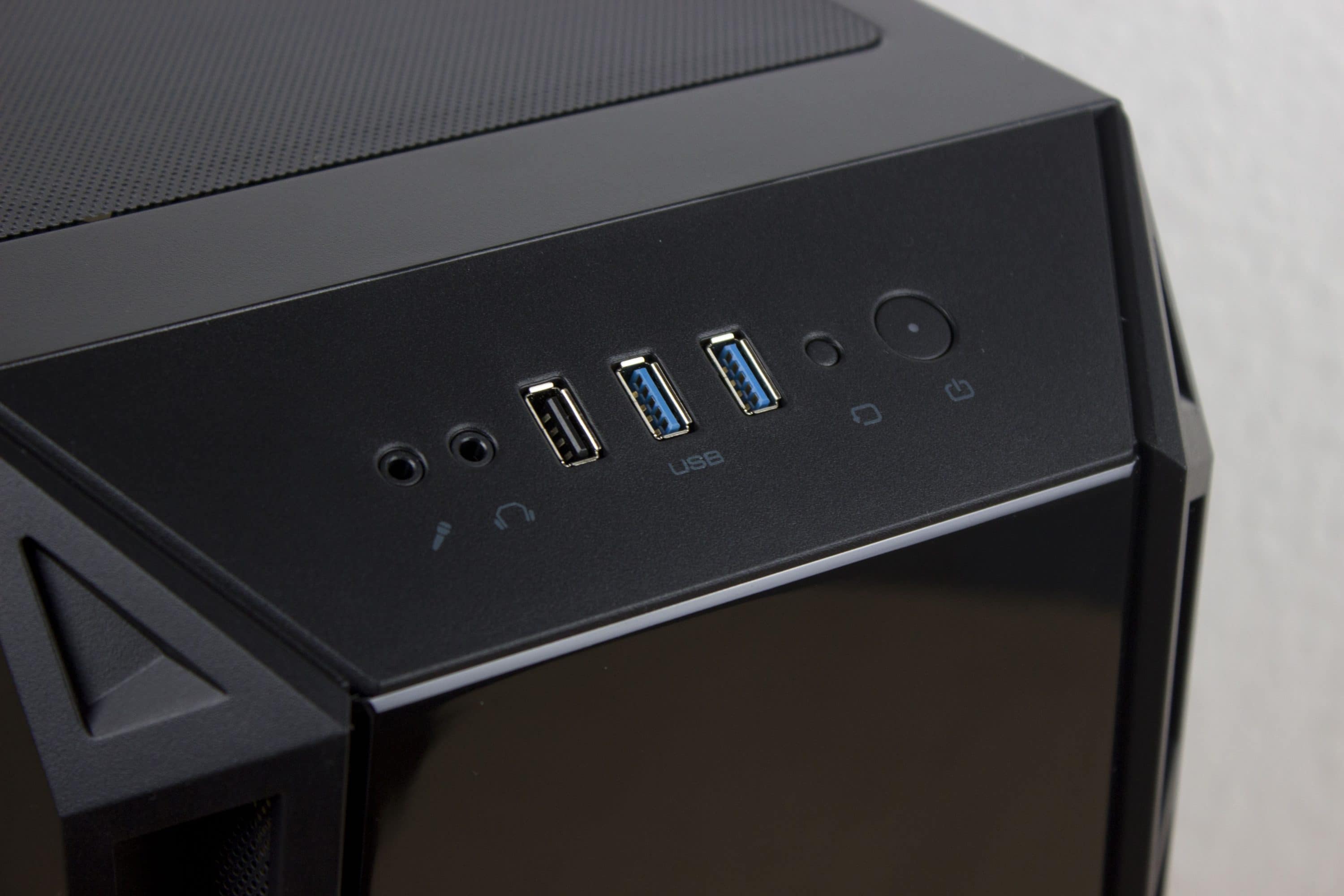 Das I/O-Panel ist oben auf der Front angebracht. Es passt sich durch die plane Fläche perfekt an die herausgestellt Front an. Standardmäßig ist bei dem Cougar Turret ein Anschluss für Kopfhörer sowie Mikrofon vorhanden. Zwei USB 3.0-Slots sind ebenso mit von der Partie wie ein USB 2.0-Slot. Ohne Frage, der Power- und Reset-Button sind ebenso im I/O-Panel.