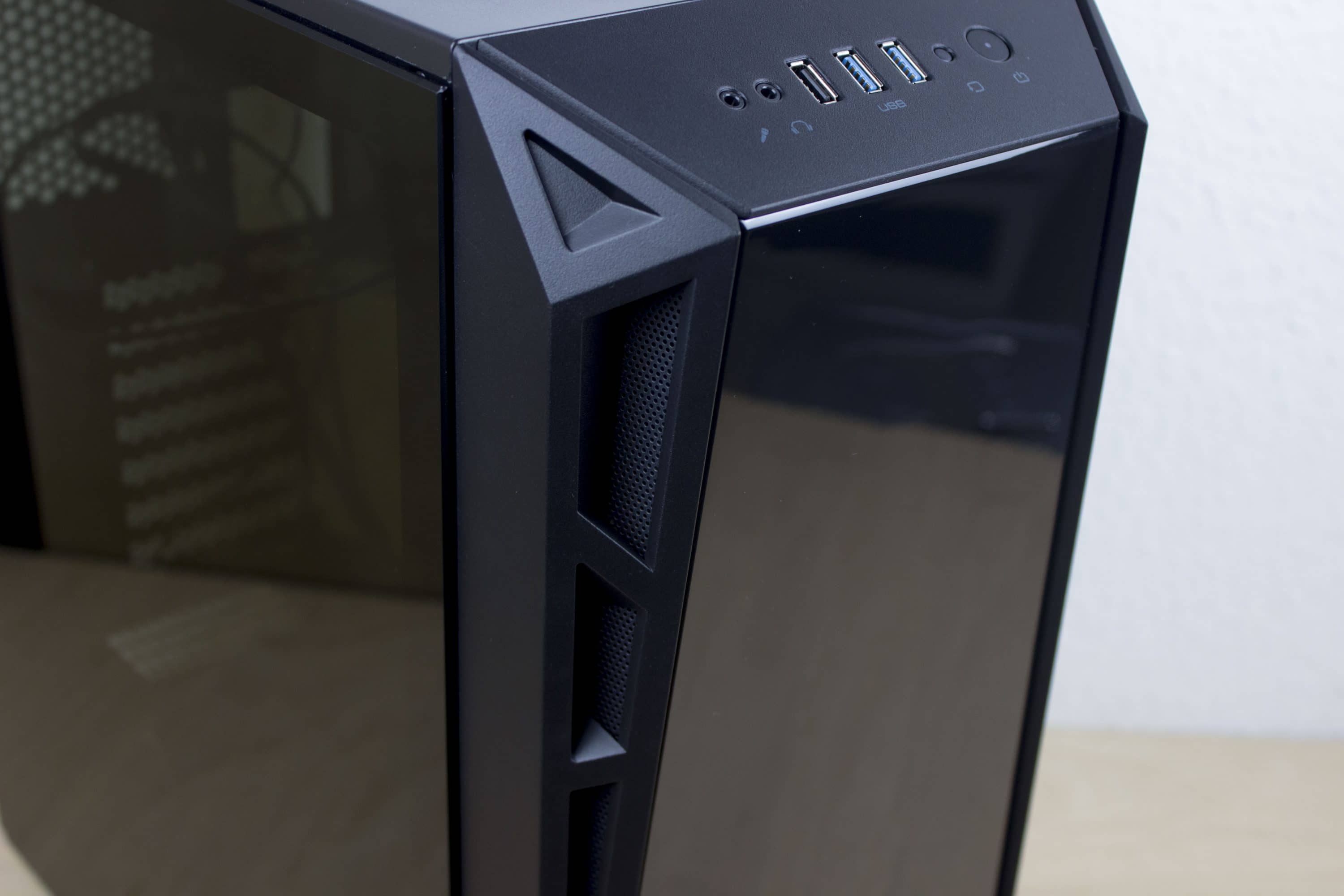 Für den Einblick auf die Hardware sorgt die große Glasseite. Um sich etwas an das ansonsten schwarze Gehäuse anzulehnen, ist die Scheibe leicht getönt. Für LED-Liebhaber ist immer noch genügend freie Sicht auf die Komponenten vorhanden. Als Material für den Rahmen kommt Stahl zum Einsatz. Dadurch wird das Gehäuse in Verbindung mit der Scheibe etwas schwer, das Gewicht hält sich aber noch in Grenzen.