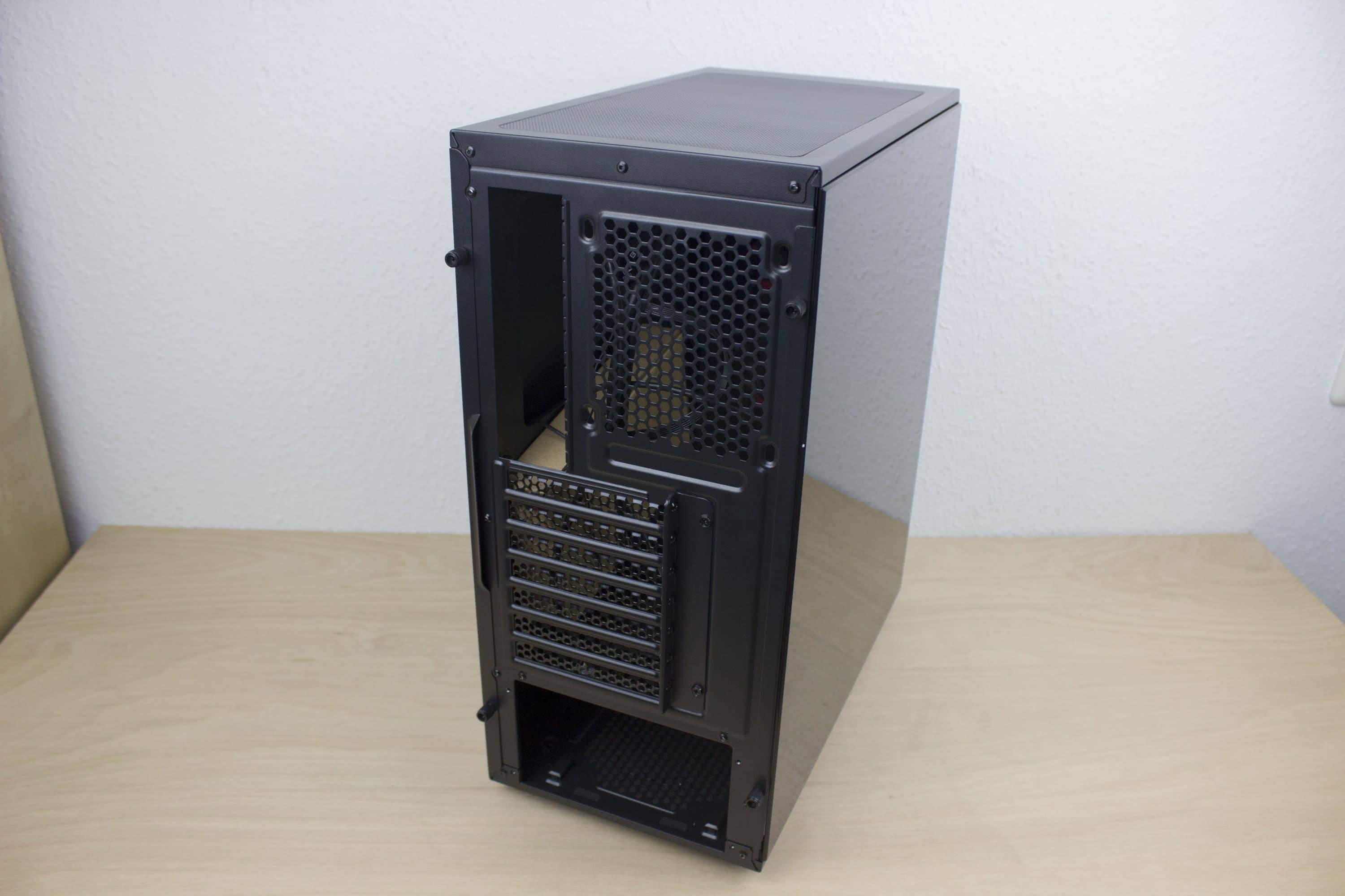 Sieben Erweiterungsslots finden wir auf der Rückseite, bei Midi-Towern eine normale Zahl. Wünschenswert wäre noch ein weiterer vorinstallierter Lüfter. Leider finden wir dort nur einen leeren 120-mm-Slot vor. Geeignet ist das Gehäuse für Netzteile in der Standardgröße ATX.