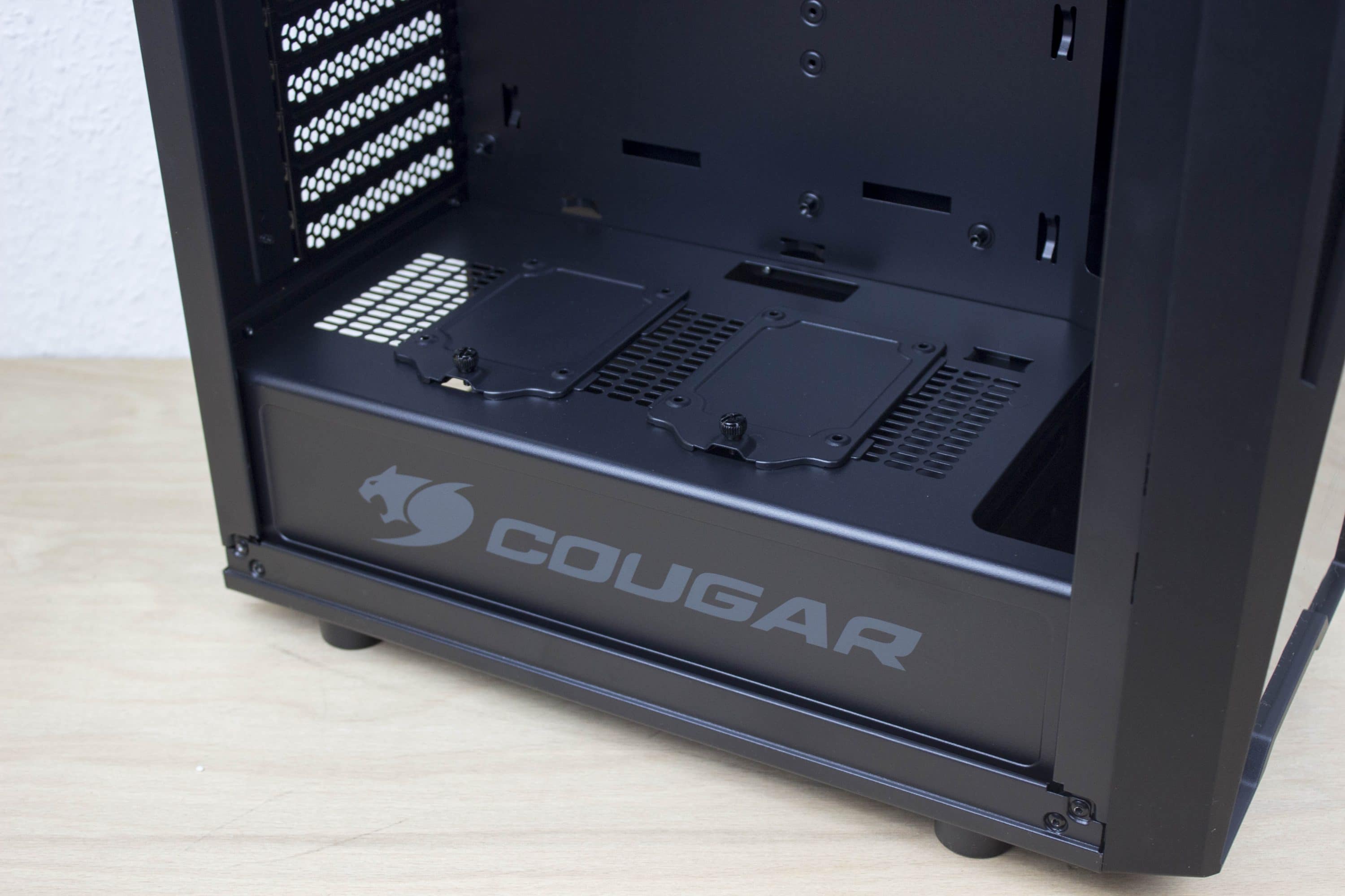 Der Hardwarebereich ist vom Bereich für das Netzteil und die Datenträger abgetrennt. Die Abtrennung ziert das Cougar-Logo inklusive Schriftzug. Auf der Abtrennung ist Platz für zwei 2,5-Zoll-Datenträger. Radiatoren mit bis zu 360 mm finden im vorderen Bereich ihren Platz, da dort die Abtrennung für bessere Luftzirkulation offen ist.